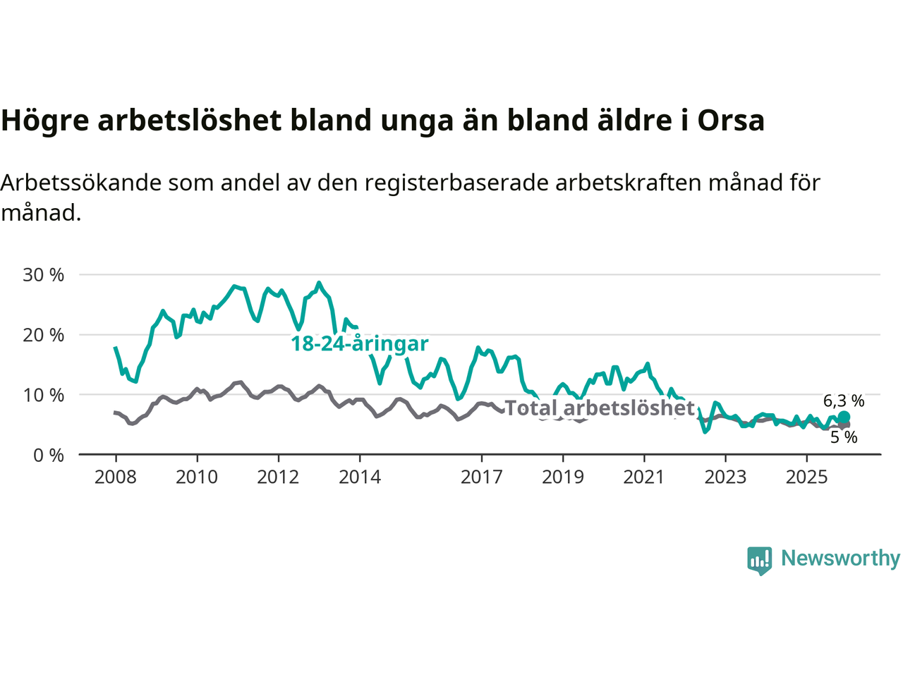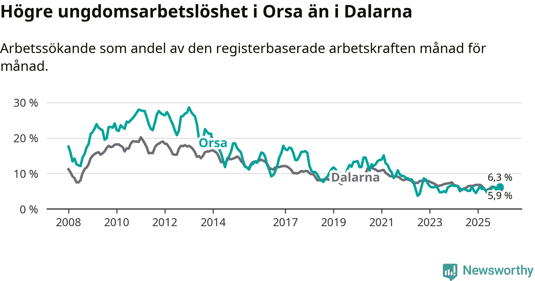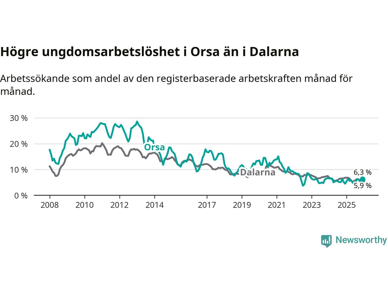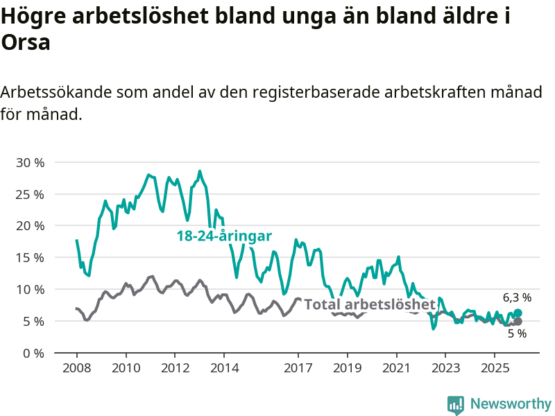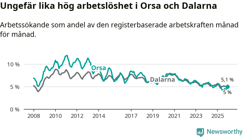Medan Orsa har ungefär samma total arbetslöshet som Dalarna, ligger ungdomsarbetslösheten 0,4 procentenheter högre i Orsa.