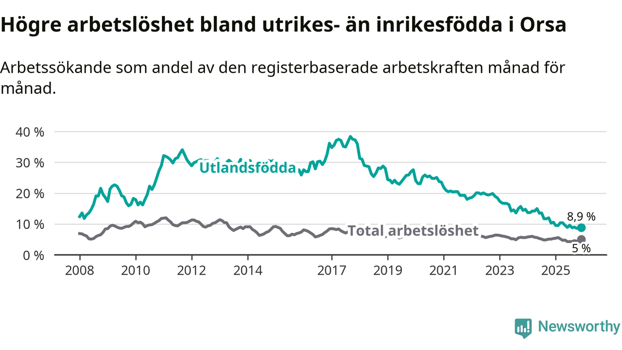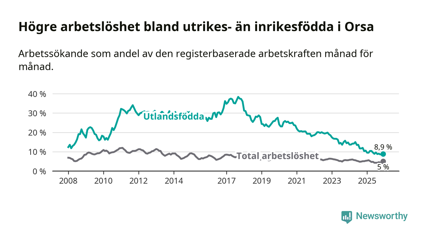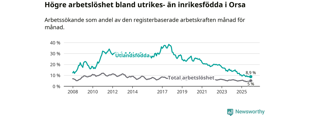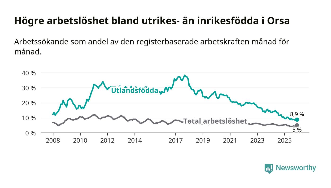 Arbetslösheten bland utlandsfödda var 8,9 procent i Orsa under december månad, motsvarande 39 av 438 personer. Det är 1,7 procentenheter färre än vid samma tidpunkt i fjol (−9 om man räknar personer). Därmed har de utlandsföddas arbetslöshet varit lägre än vid samma tidpunkt i fjol i över tre år i sträck. Sedan december 2022 har arbetslösheten bland utlandsfödda minskat från 18,5 till 8,9 procent.