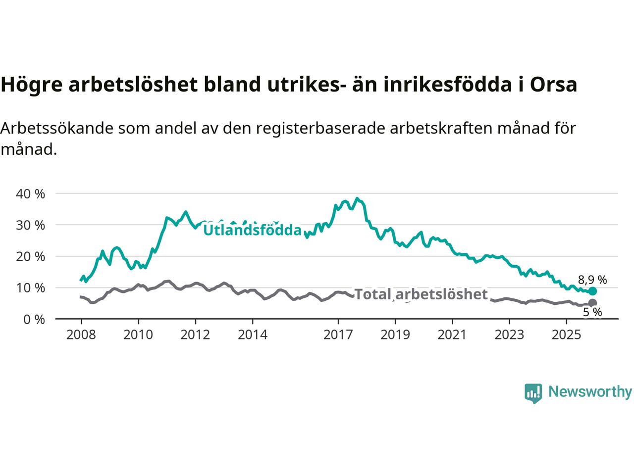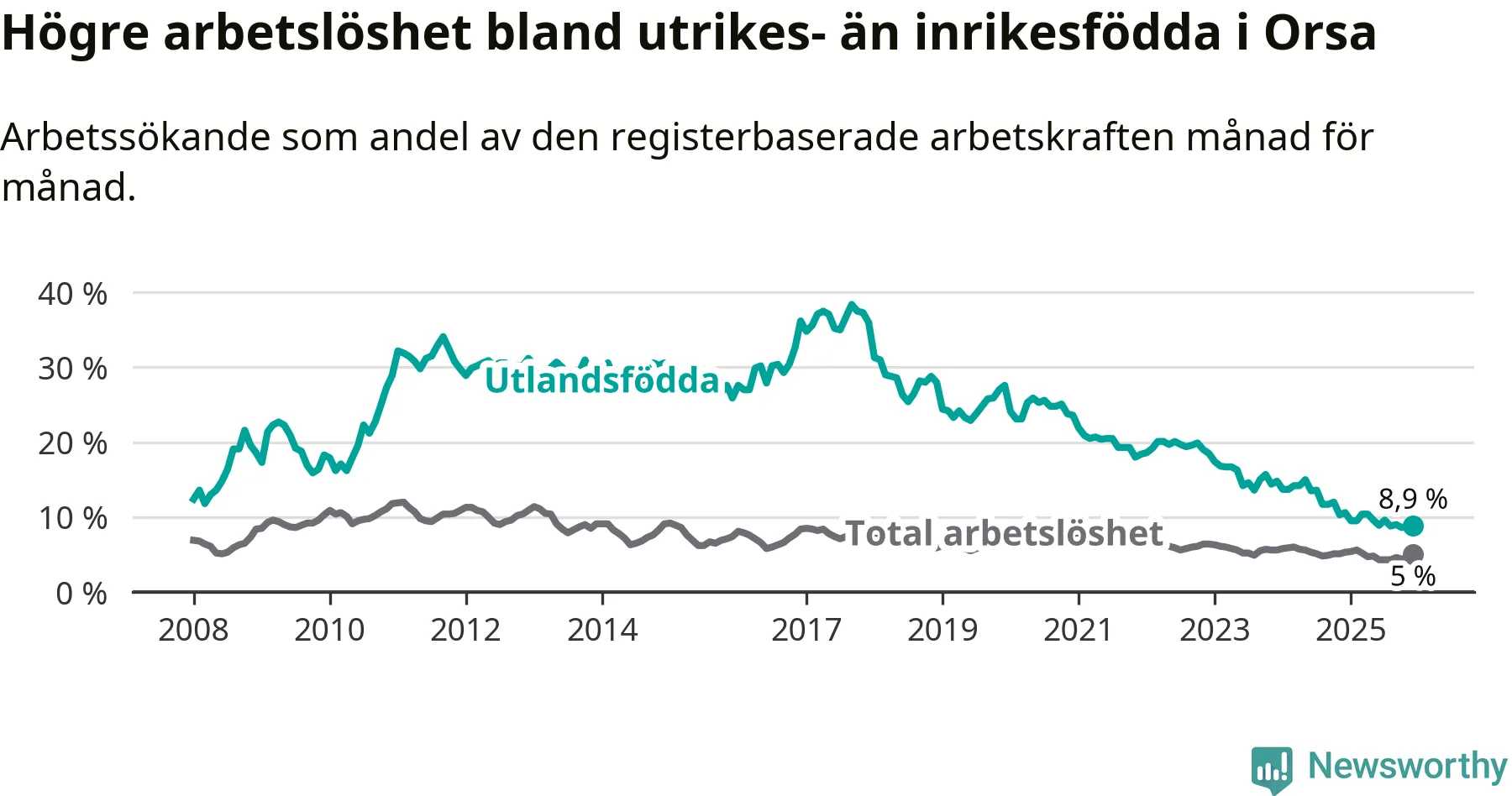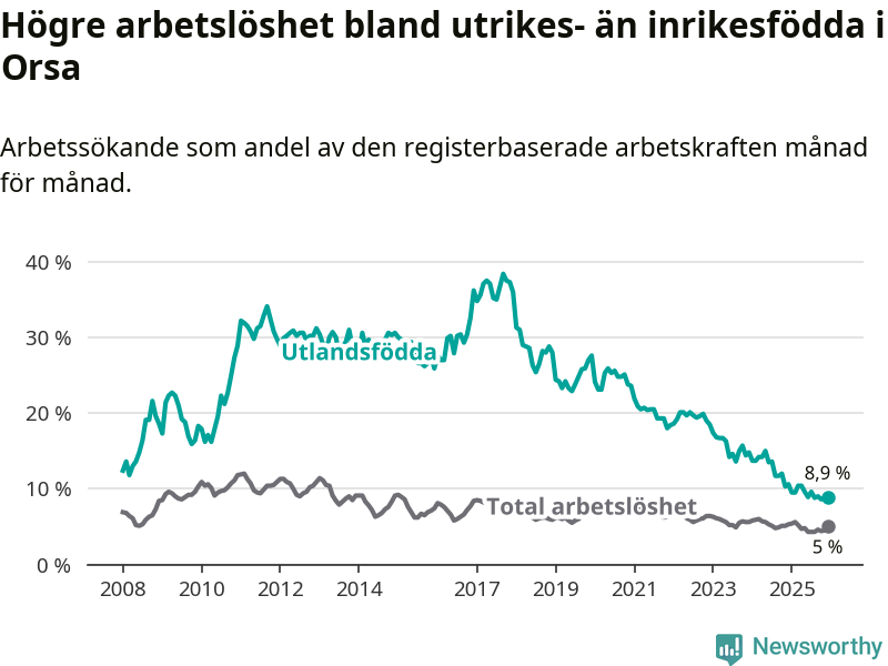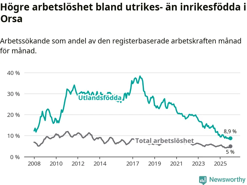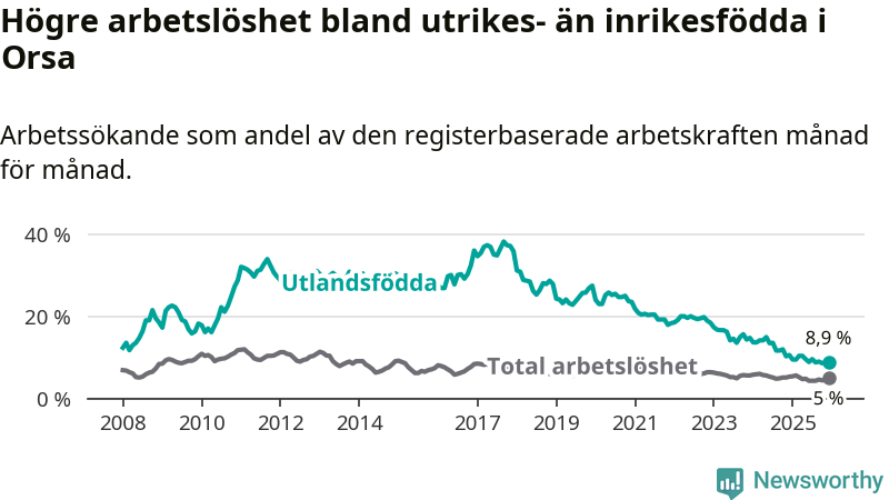 Arbetslösheten bland utlandsfödda var 8,9 procent i Orsa under december månad, motsvarande 39 av 438 personer. Det är 1,7 procentenheter färre än vid samma tidpunkt i fjol (−9 om man räknar personer). Därmed har de utlandsföddas arbetslöshet varit lägre än vid samma tidpunkt i fjol i över tre år i sträck. Sedan december 2022 har arbetslösheten bland utlandsfödda minskat från 18,5 till 8,9 procent.
