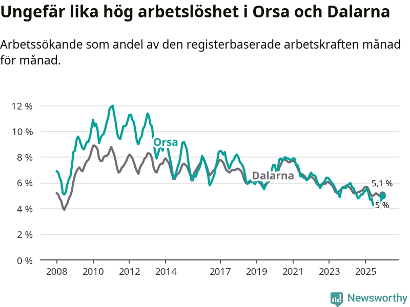 Under december månad rapporterade Orsa kommun en total arbetslöshet på 5,0 procent. Det är en minskning jämfört med samma tidpunkt i fjol (−0,3 procentenheter). Även i Dalarnas län sjunker arbetslösheten .