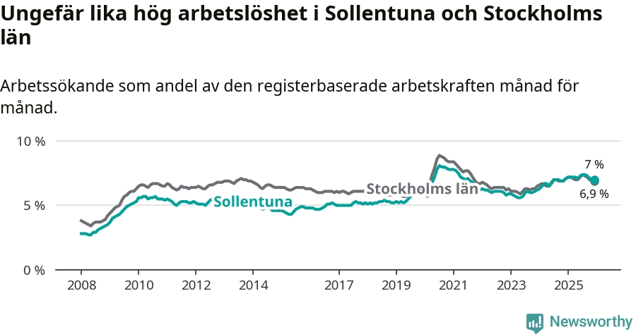 Under december månad rapporterade Sollentuna kommun en total arbetslöshet på 7,0 procent. Det är en minskning jämfört med samma tidpunkt i fjol (−0,1 procentenheter). Även i Stockholms län sjunker arbetslösheten något.