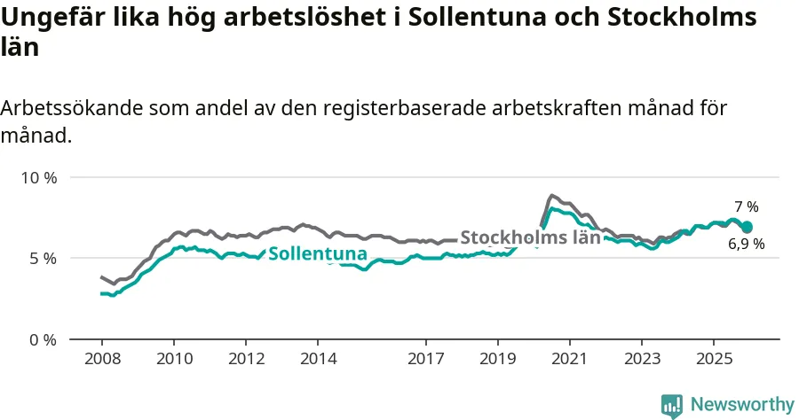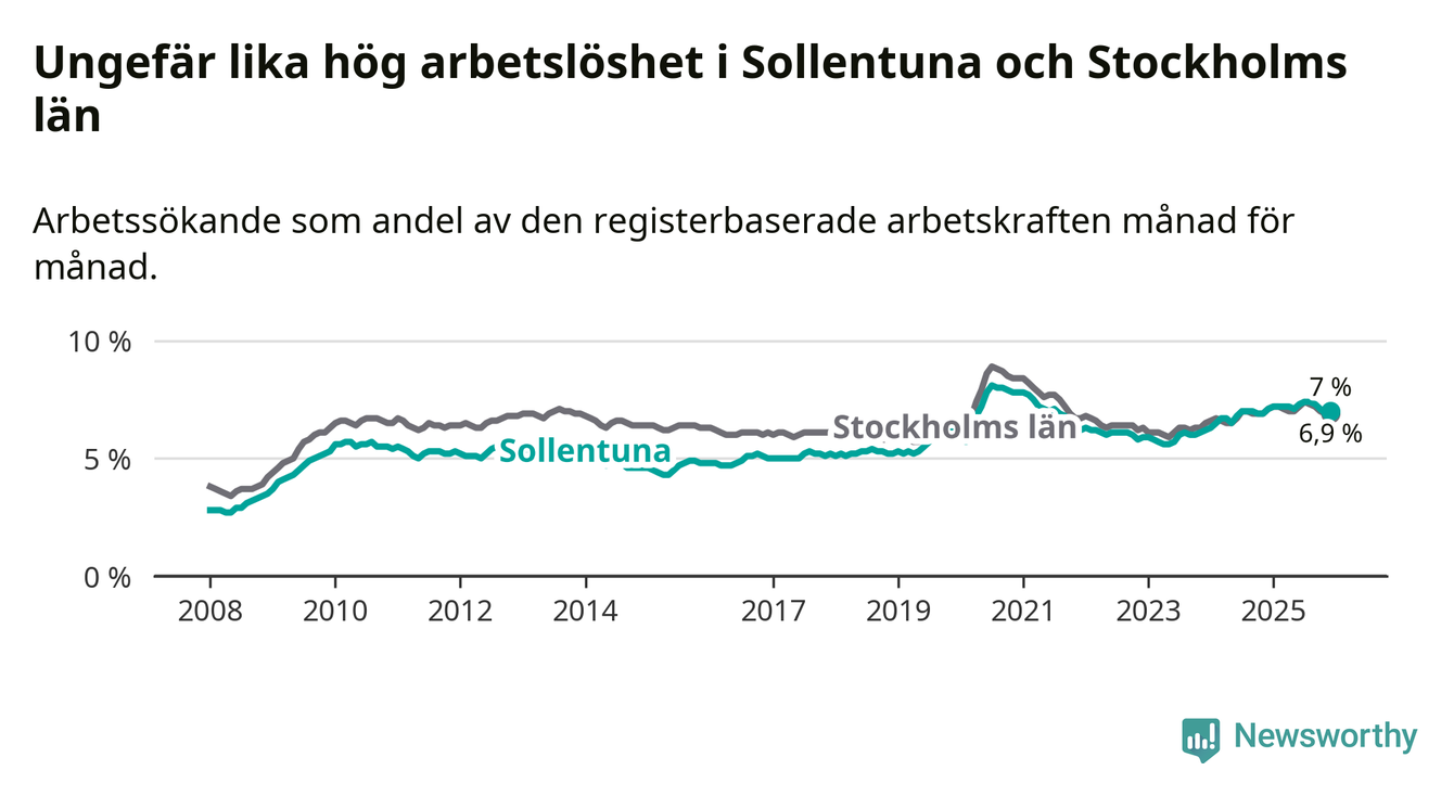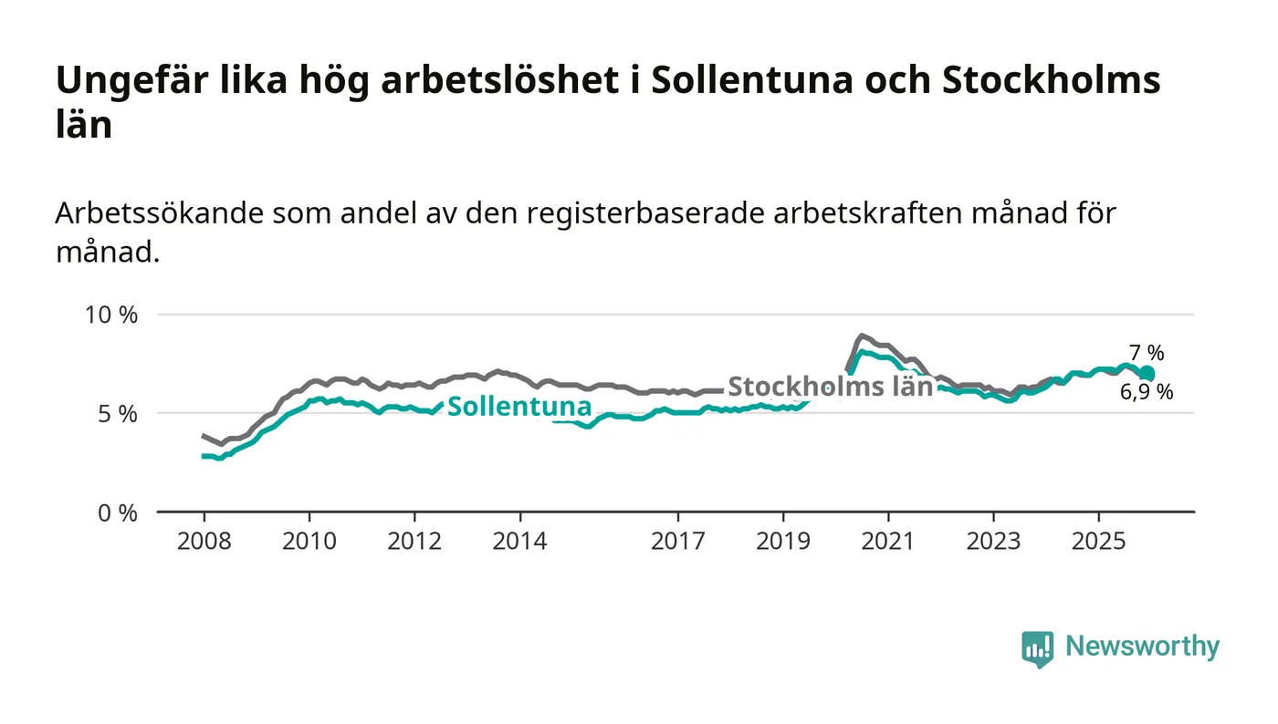 Den minskande arbetslösheten gör att Sollentuna nu har i stort sett samma arbetslöshetsnivå som hela Stockholms län. Ekerö har den lägsta arbetslösheten i länet (3,8 procent), medan Södertälje har den högsta (11,0 procent). För att Sollentuna skulle komma ner i samma arbetslöshetsnivå som Ekerö skulle 1 277 personer behöva sysselsättas.
