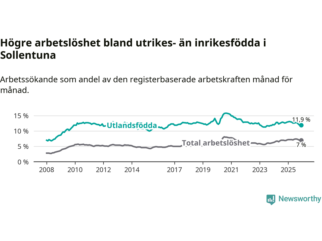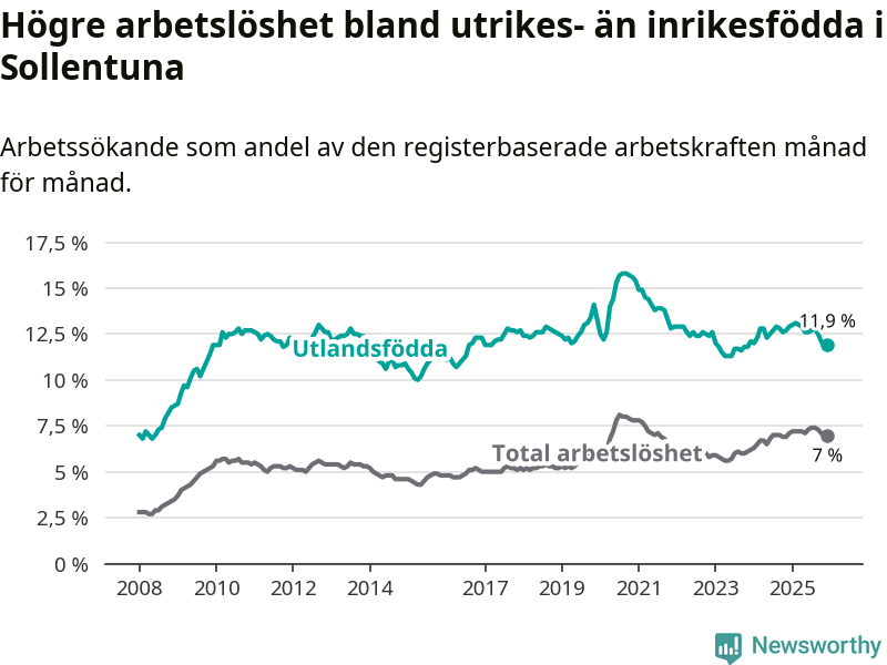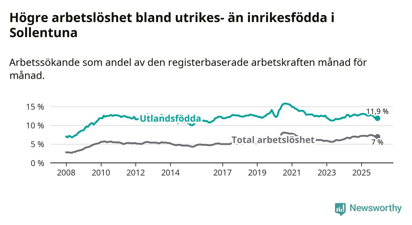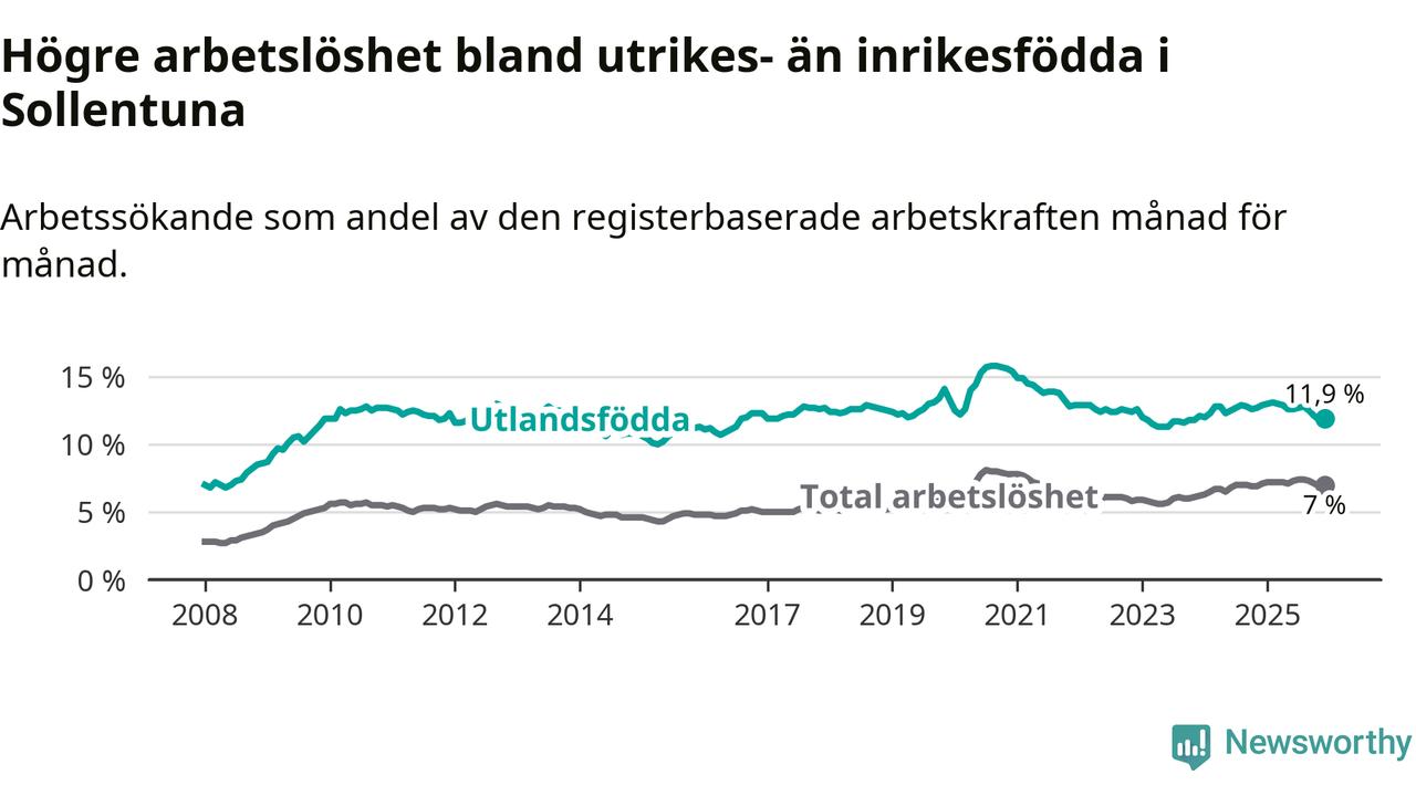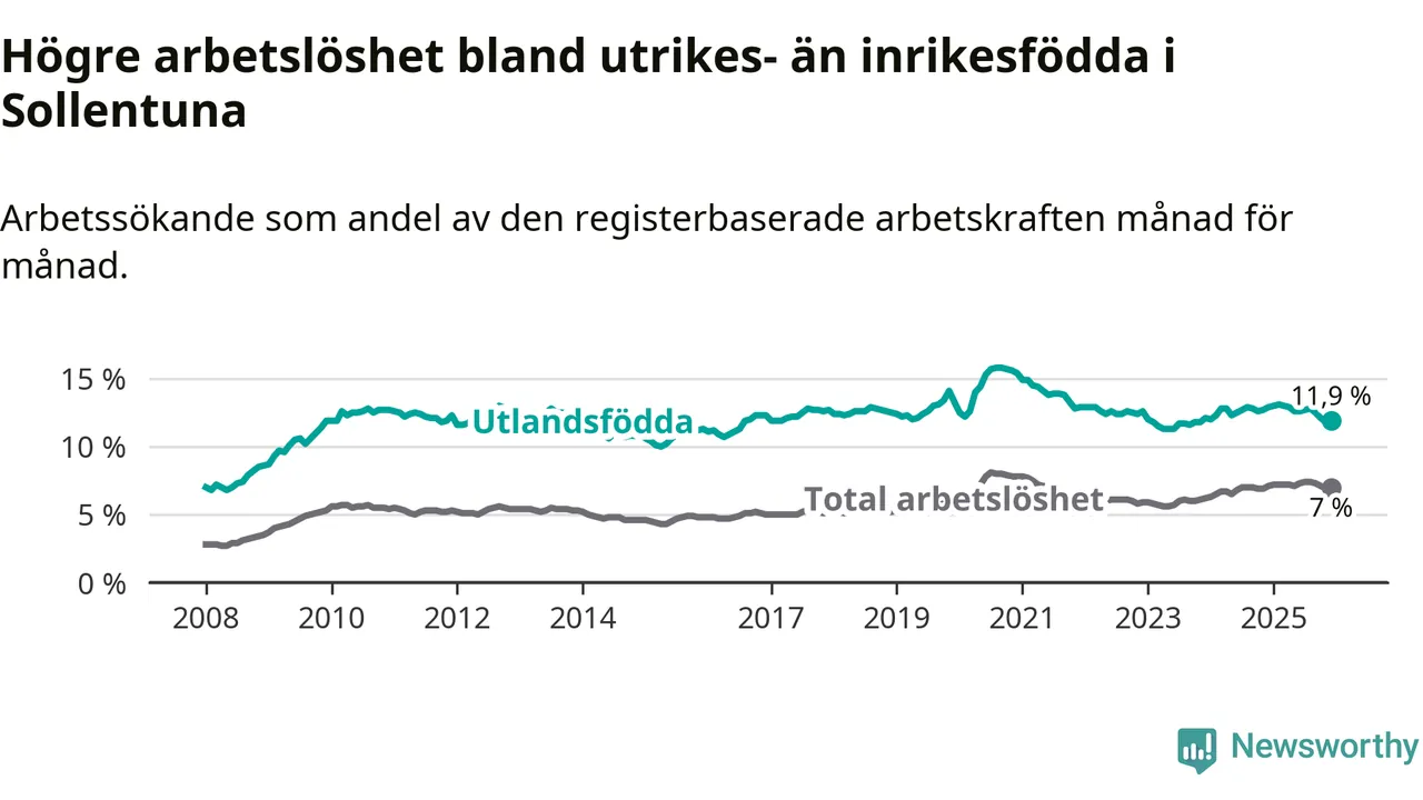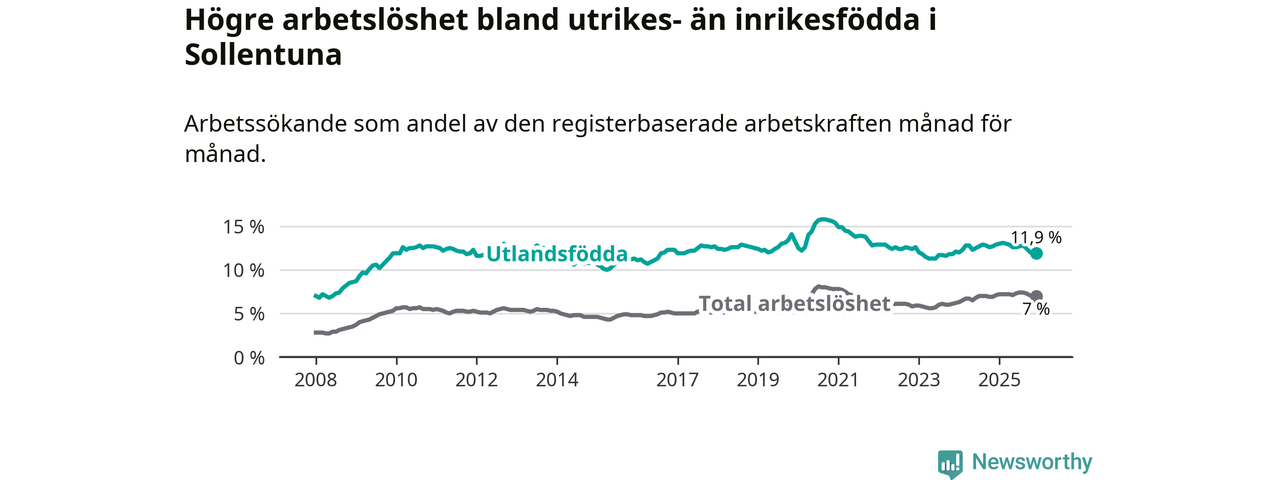 Skillnaden i arbetslöshet mellan utrikesfödda och hela befolkningen är 4,9 procentenheter i Sollentuna. Det är en mindre skillnad än för ett år sedan (−0,9 procentenheter).