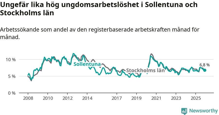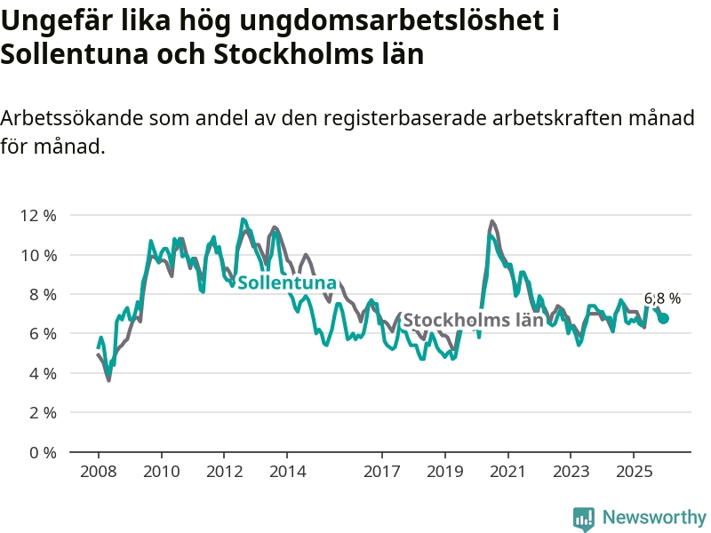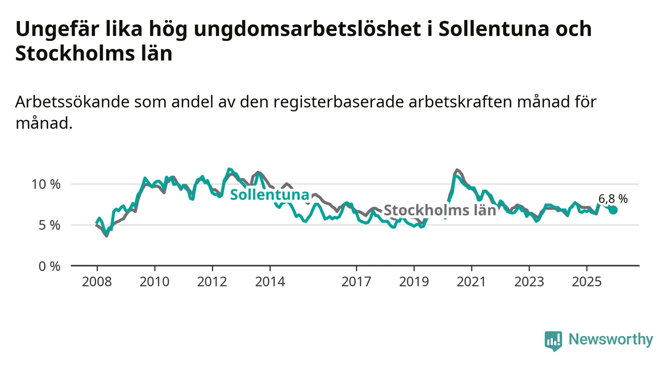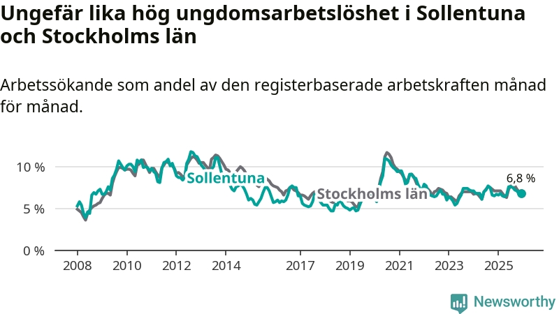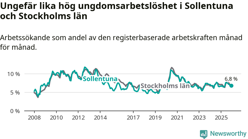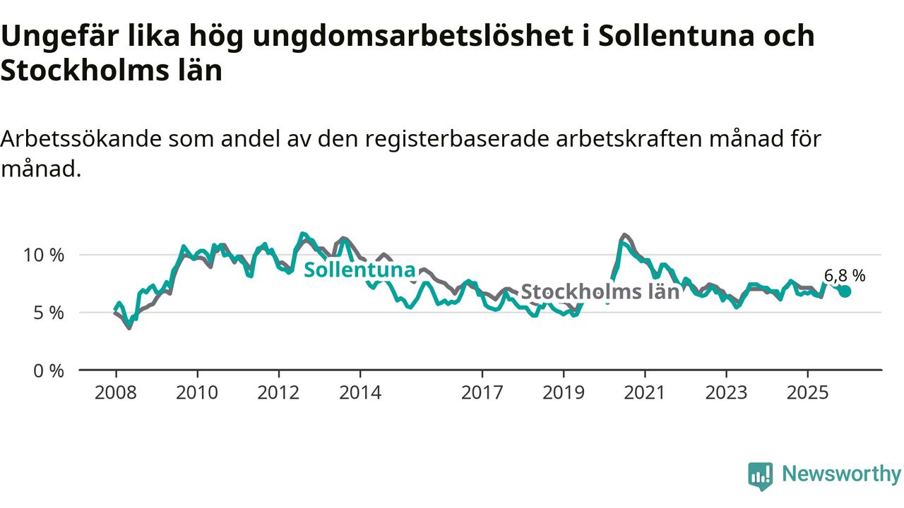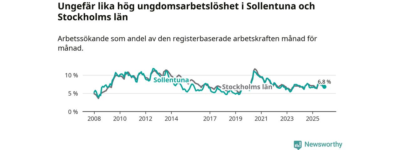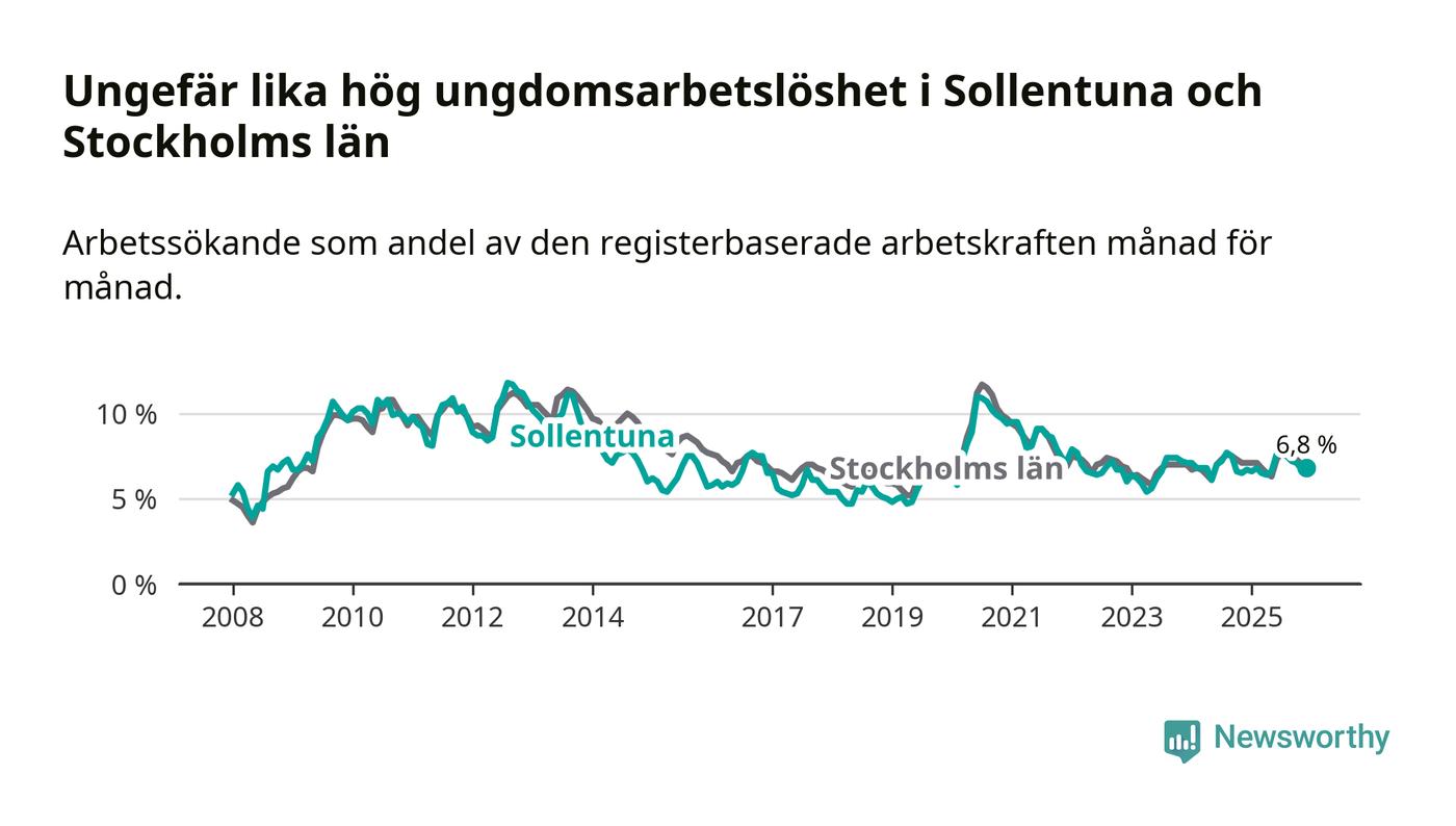 Precis som den totala arbetslösheten ligger ungdomsarbetslösheten i Sollentuna på i stort sett samma nivå som i Stockholms län som helhet.