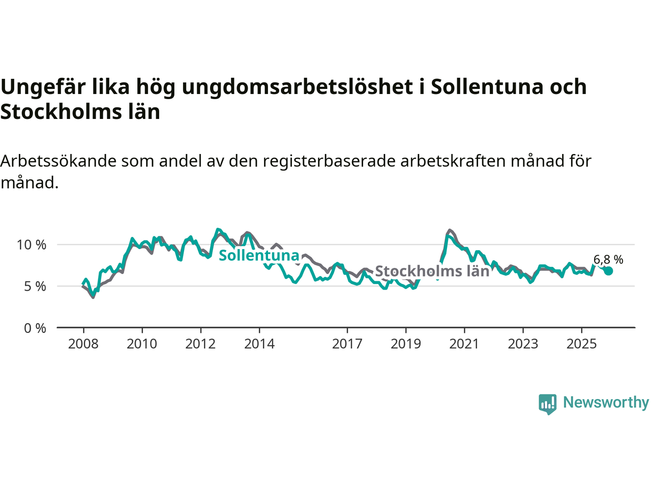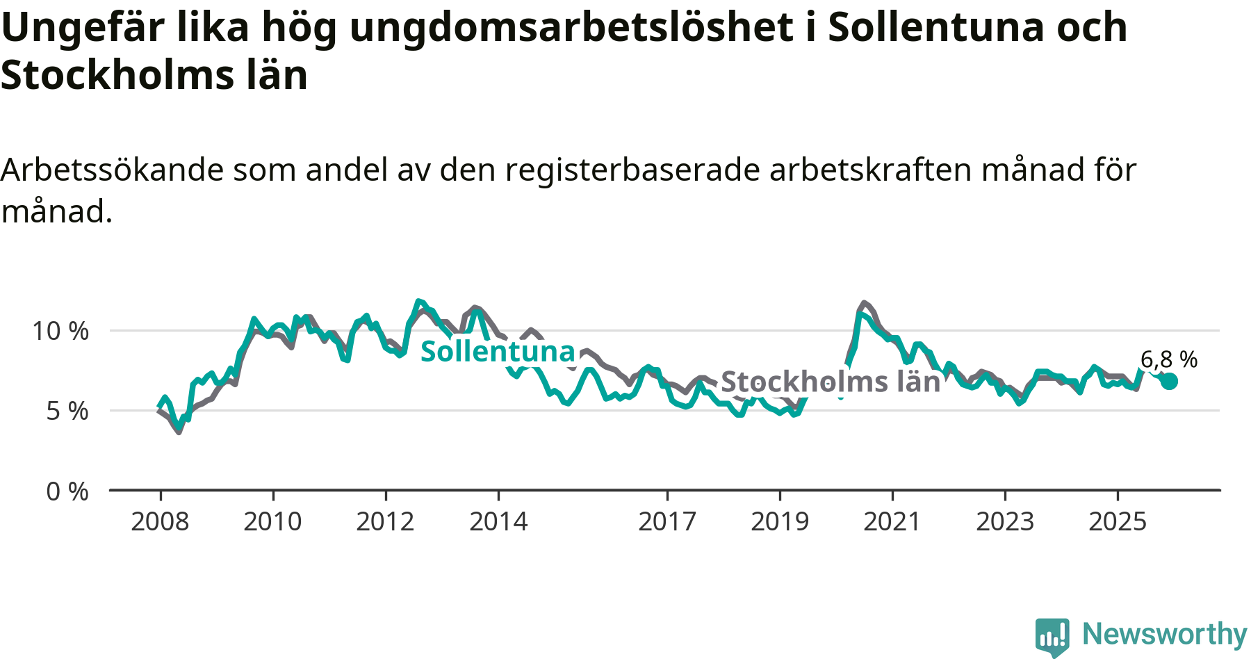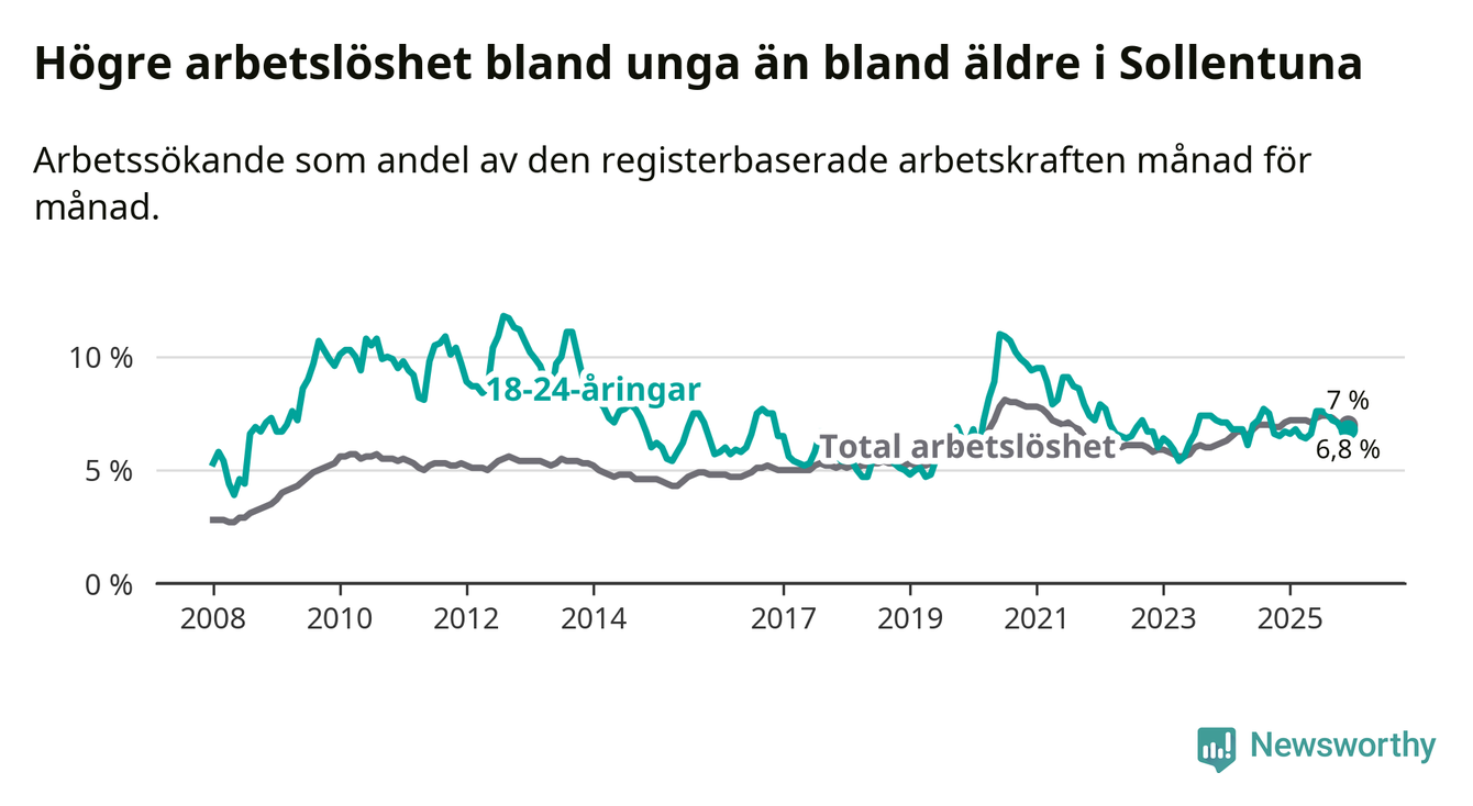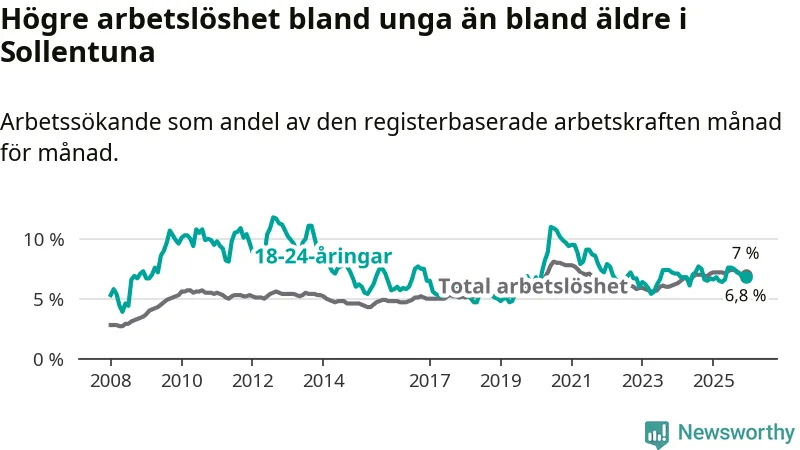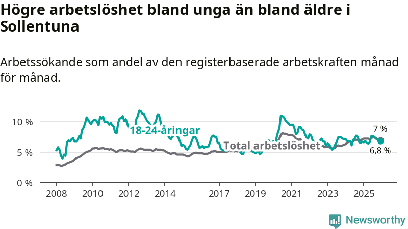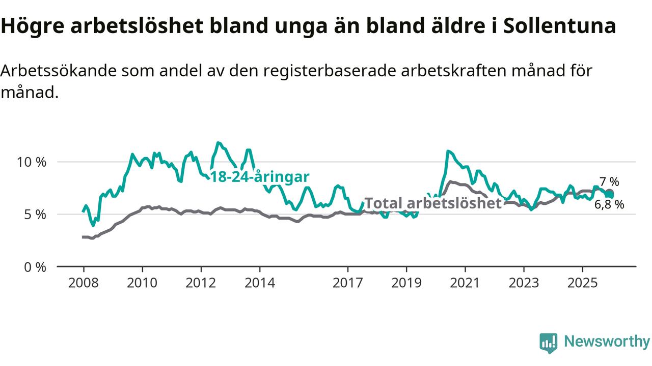 Precis som den totala arbetslösheten ligger ungdomsarbetslösheten i Sollentuna på i stort sett samma nivå som i Stockholms län som helhet.