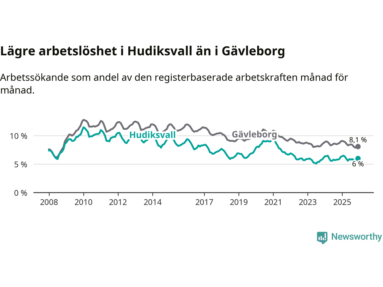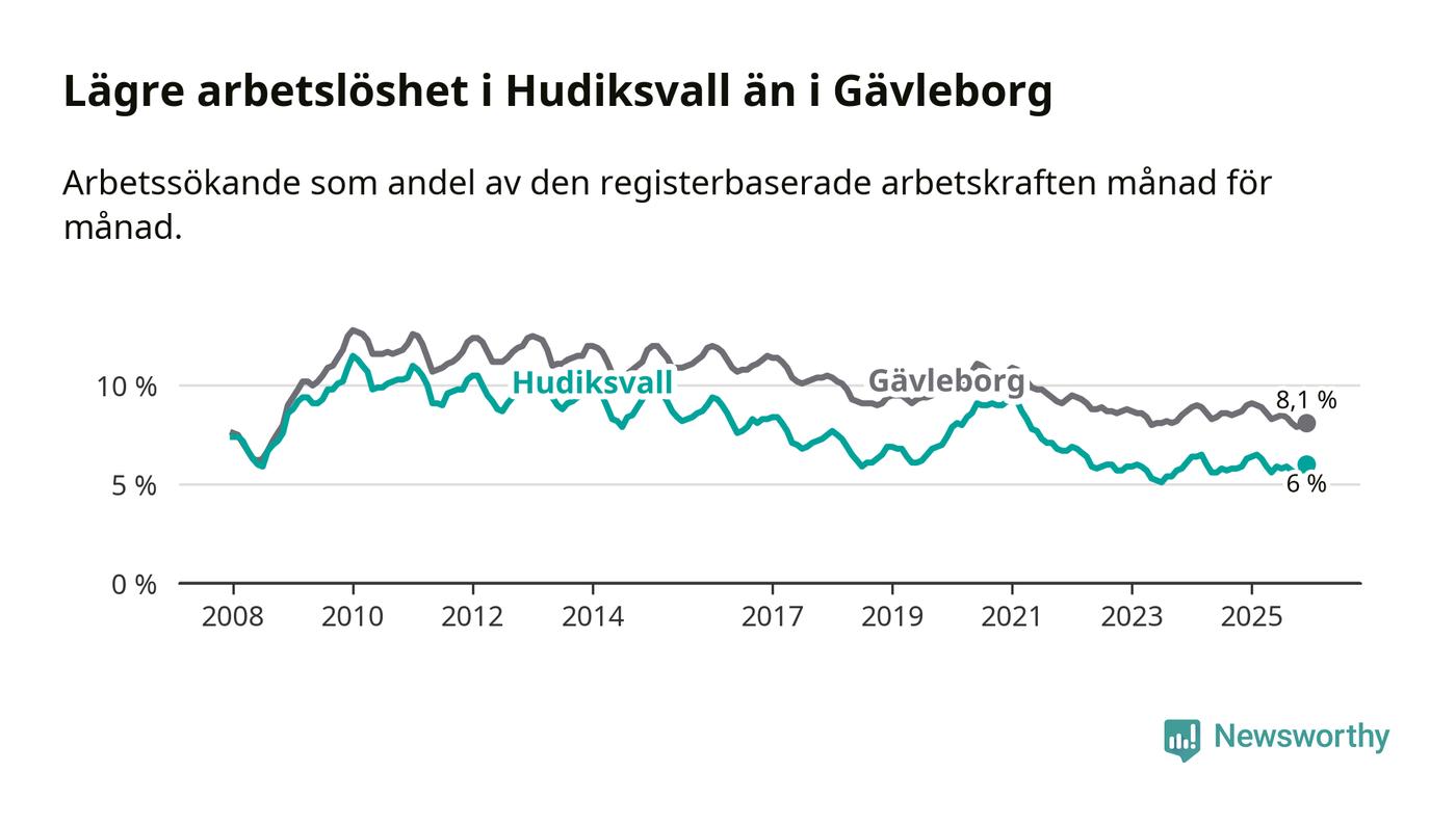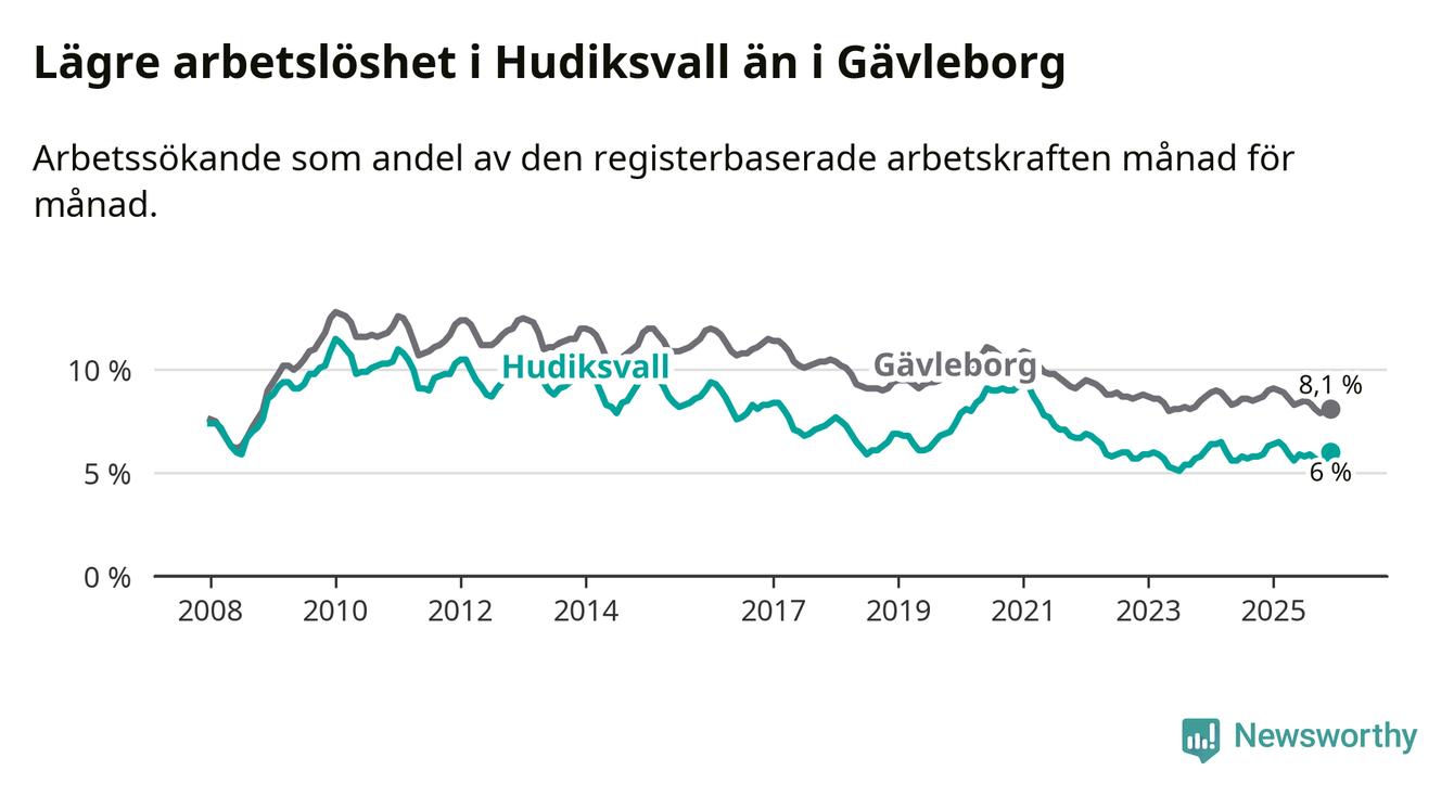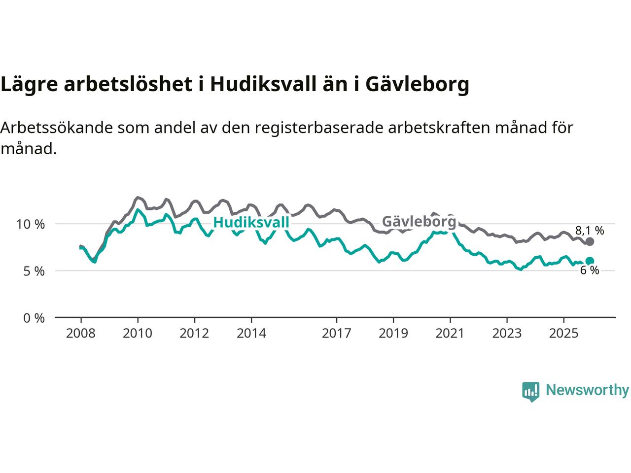 Hudiksvall hade redan tidigare lägre arbetslöshet än snittet i hela Gävleborgs län och nu växer klyftan (6,0 procent i kommunen, jämfört med 8,1 procent i hela länet). Hudiksvall har därmed även den lägsta arbetslöshetsnivån i länet. Söderhamn har den högsta (9,1 procent).