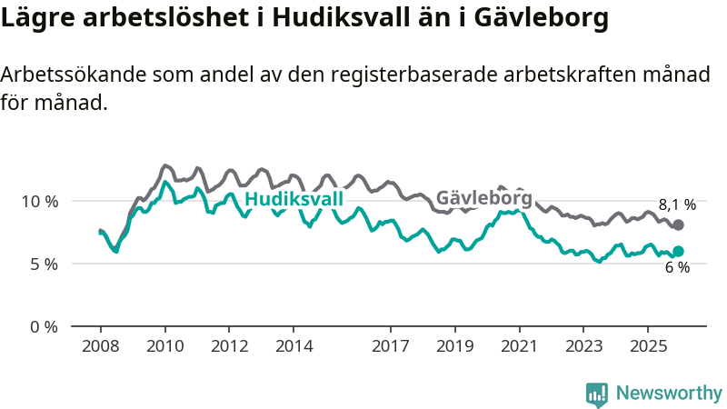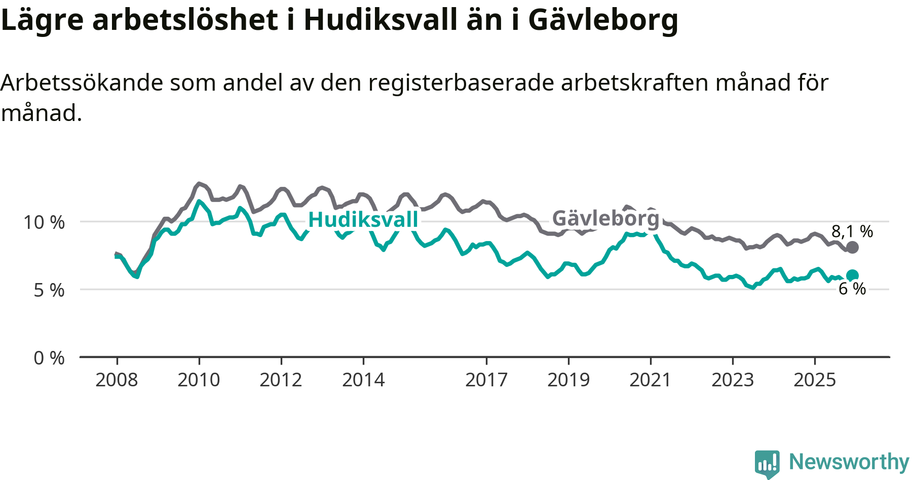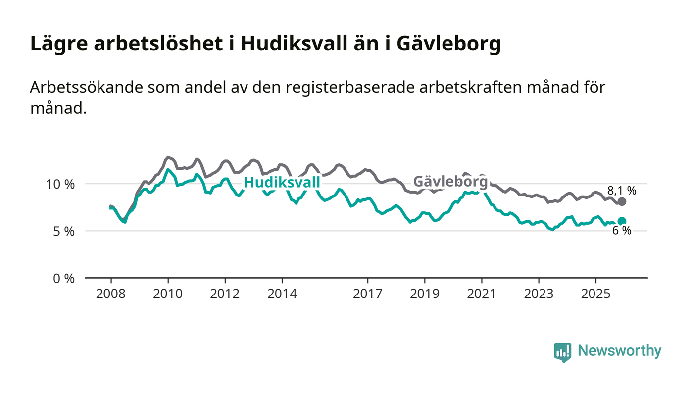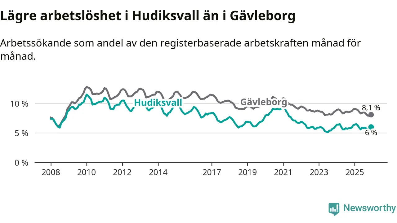 Hudiksvall hade redan tidigare lägre arbetslöshet än snittet i hela Gävleborgs län och nu växer klyftan (6,0 procent i kommunen, jämfört med 8,1 procent i hela länet). Hudiksvall har därmed även den lägsta arbetslöshetsnivån i länet. Söderhamn har den högsta (9,1 procent).