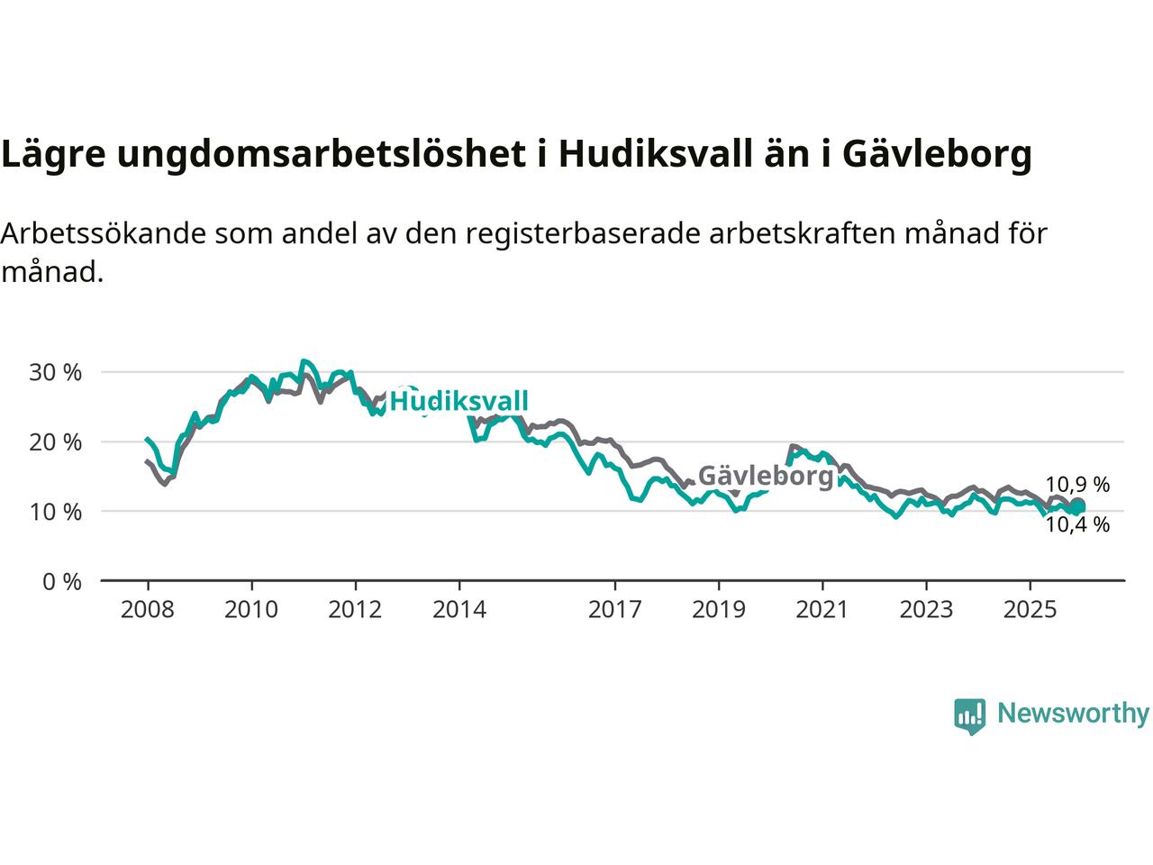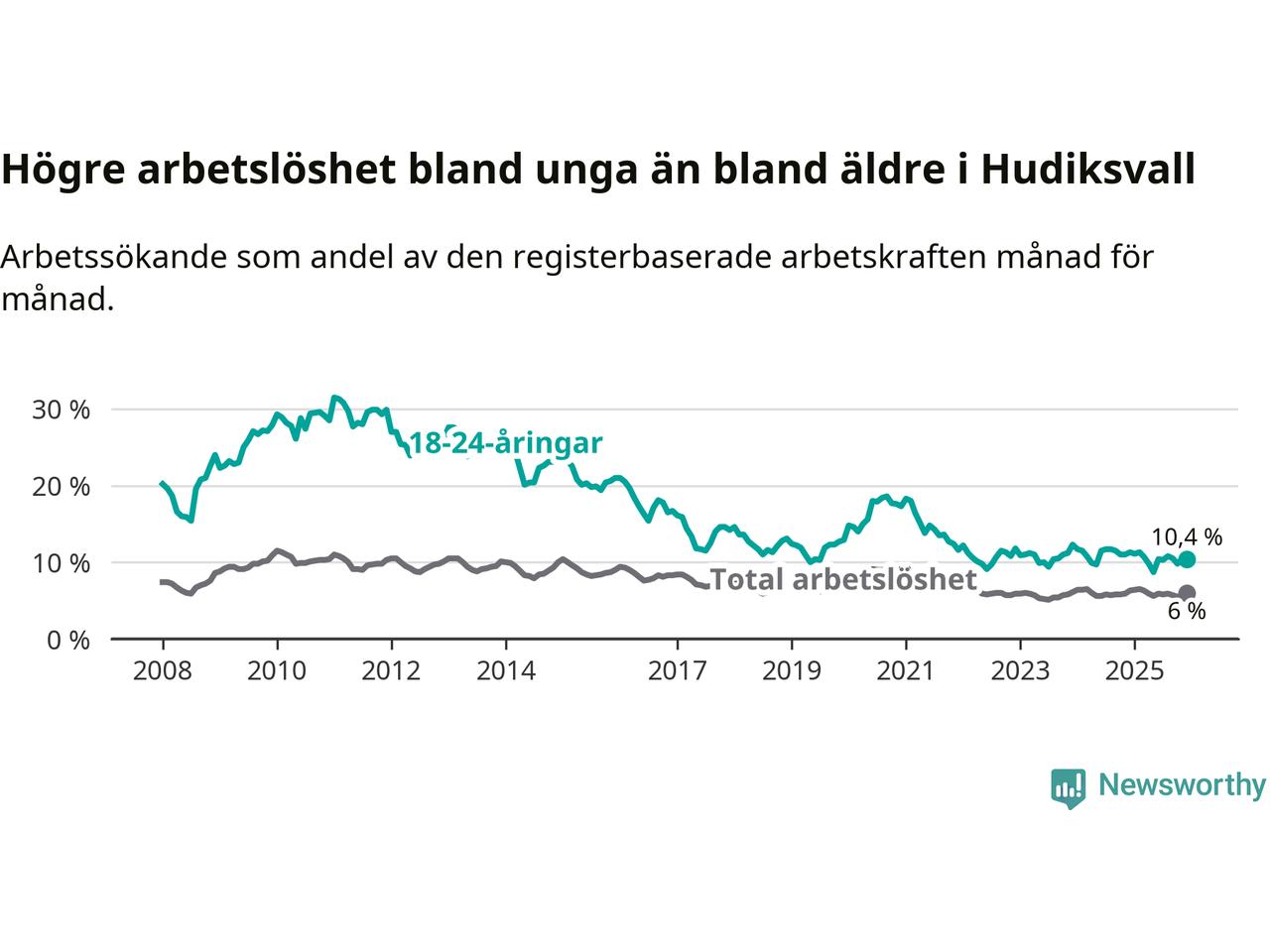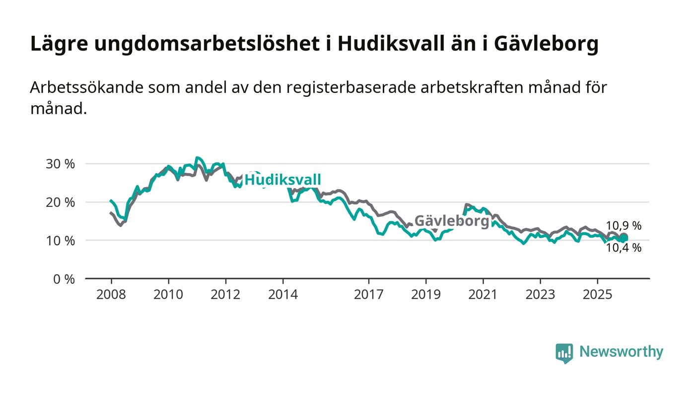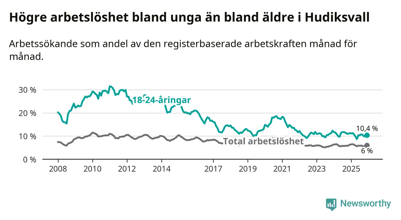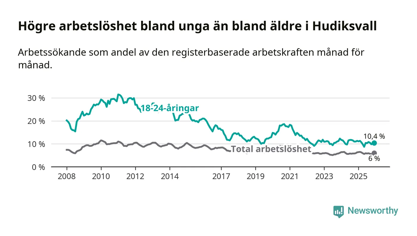 I och med den senaste månadens nedgång har de ungas arbetslöshet i Hudiksvall sjunkit 14 månader i följd (ner från 11,0 procent i oktober 2024 till 10,4 procent nu).