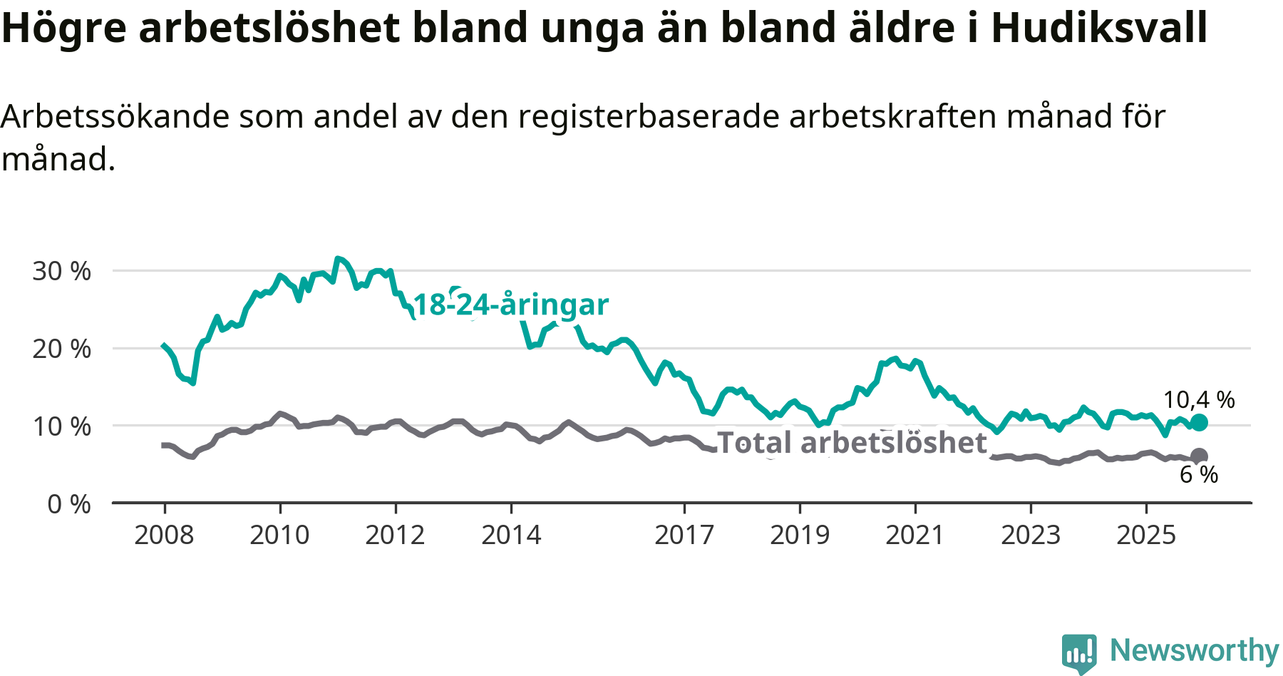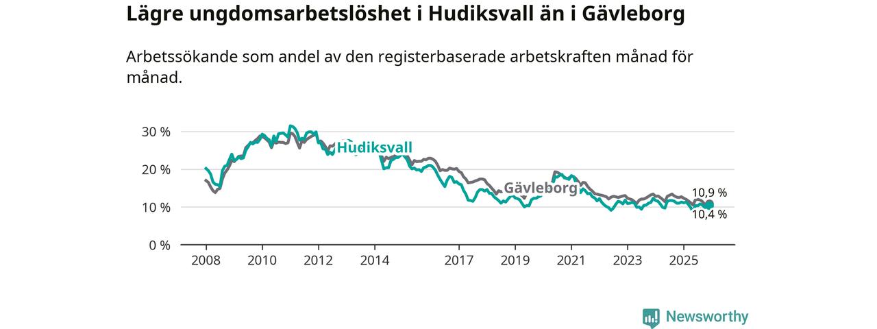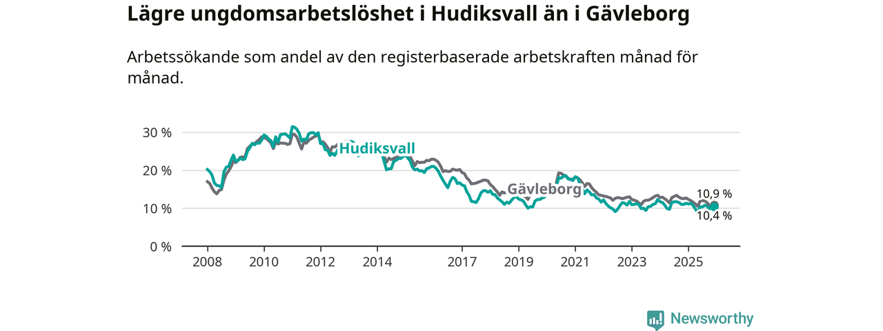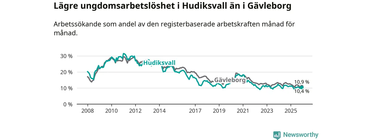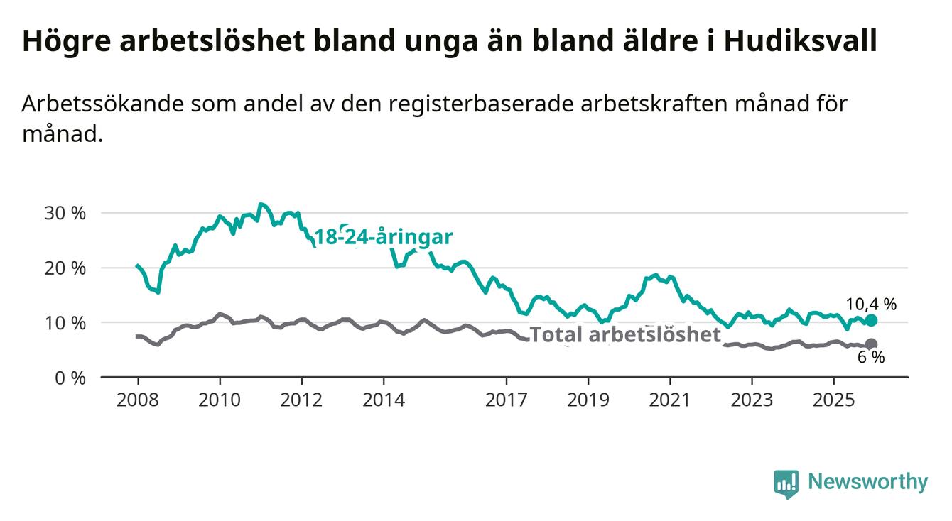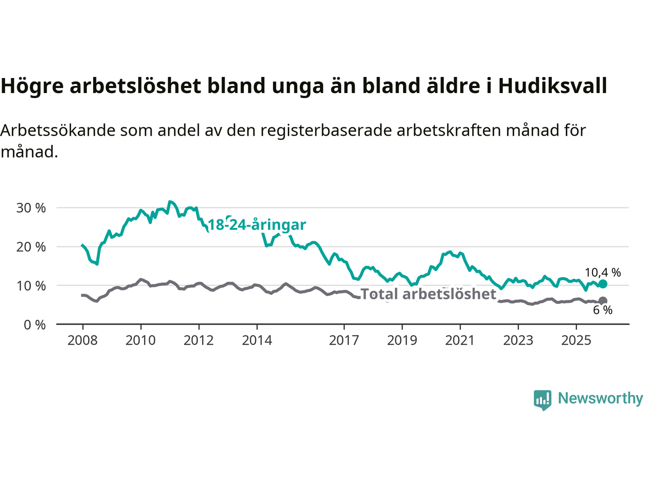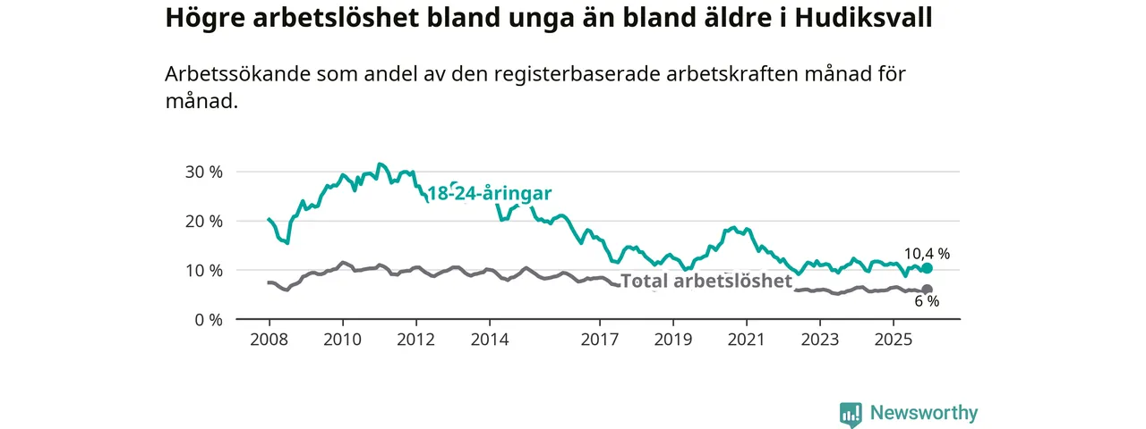 I och med den senaste månadens nedgång har de ungas arbetslöshet i Hudiksvall sjunkit 14 månader i följd (ner från 11,0 procent i oktober 2024 till 10,4 procent nu).