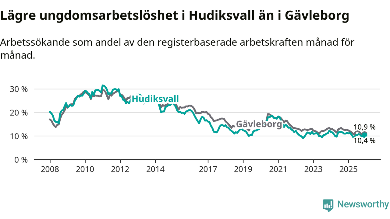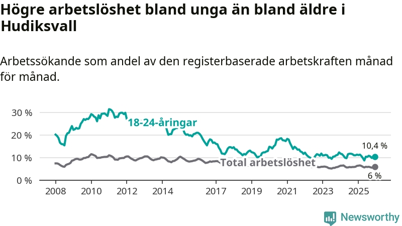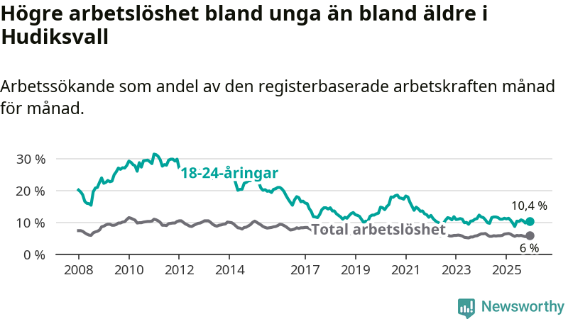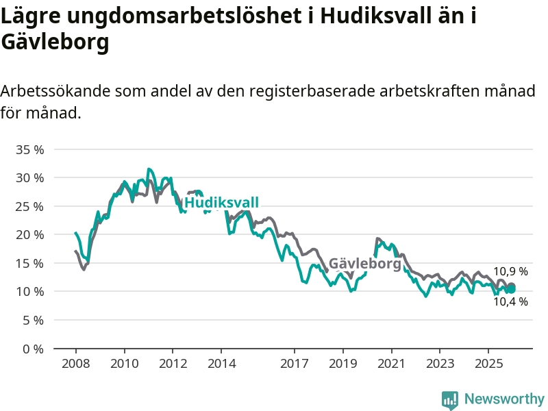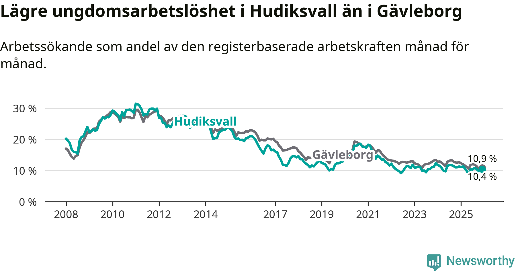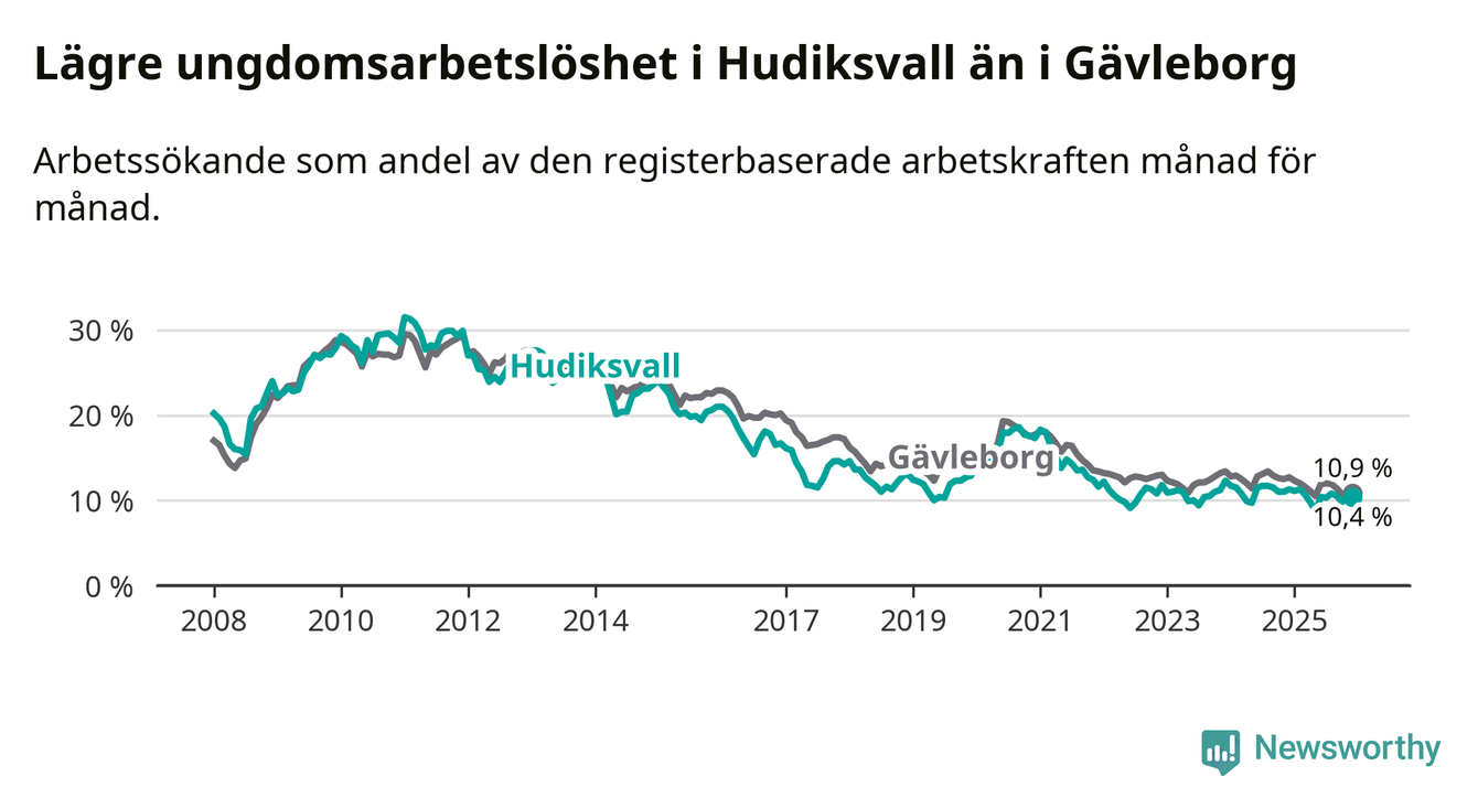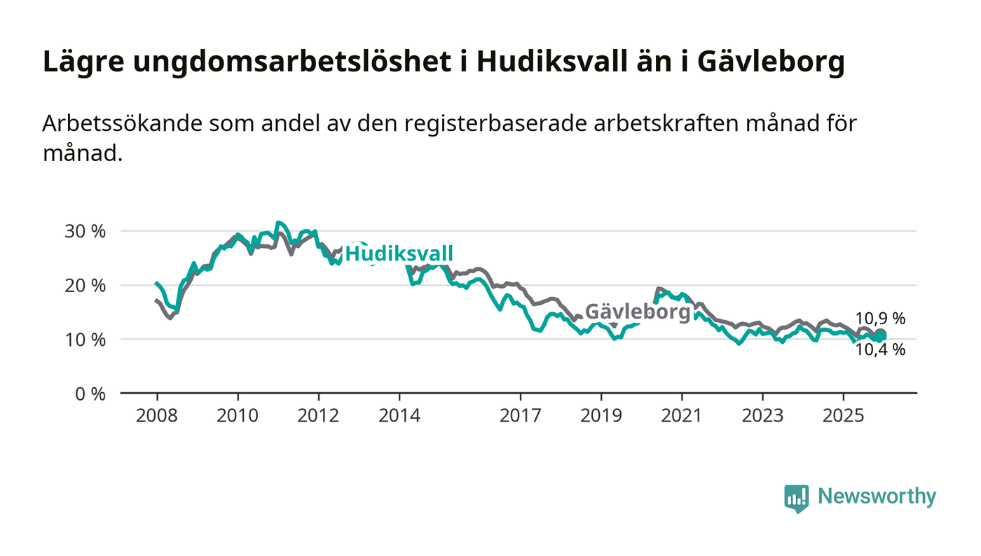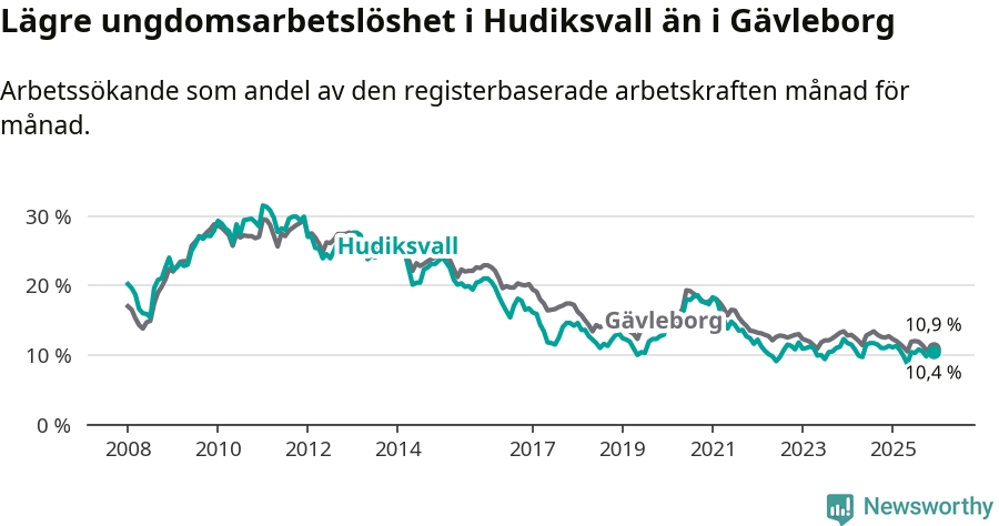 I och med den senaste månadens nedgång har de ungas arbetslöshet i Hudiksvall sjunkit 14 månader i följd (ner från 11,0 procent i oktober 2024 till 10,4 procent nu).