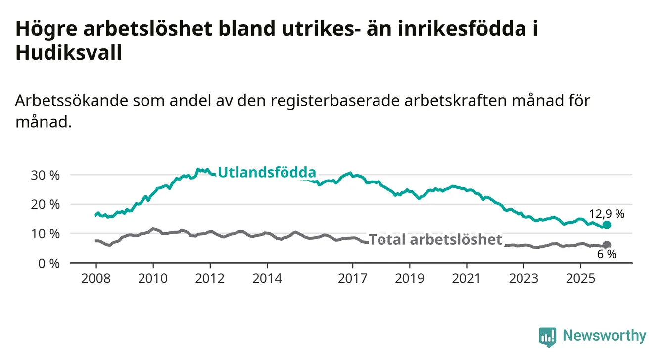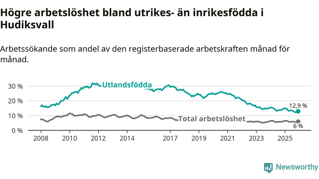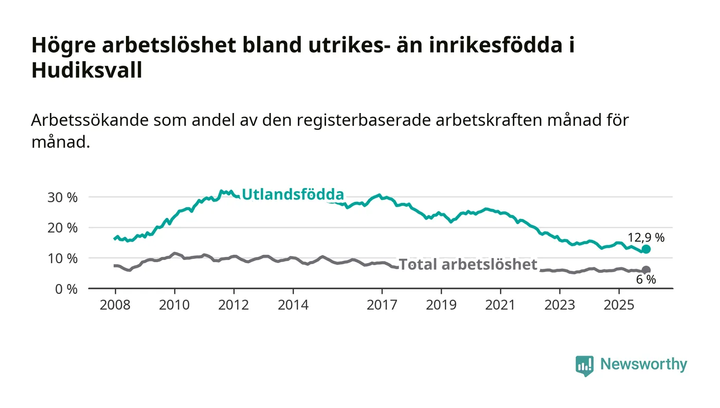 Skillnaden i arbetslöshet mellan utrikesfödda och hela befolkningen är 6,9 procentenheter i Hudiksvall. Det är en betydligt mindre skillnad än för ett år sedan (−1,7 procentenheter).