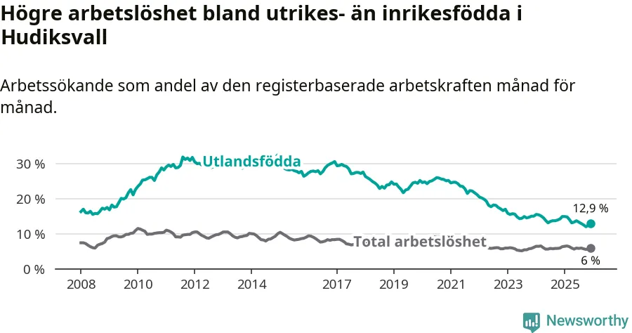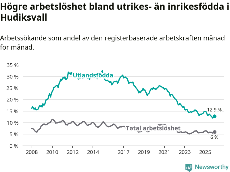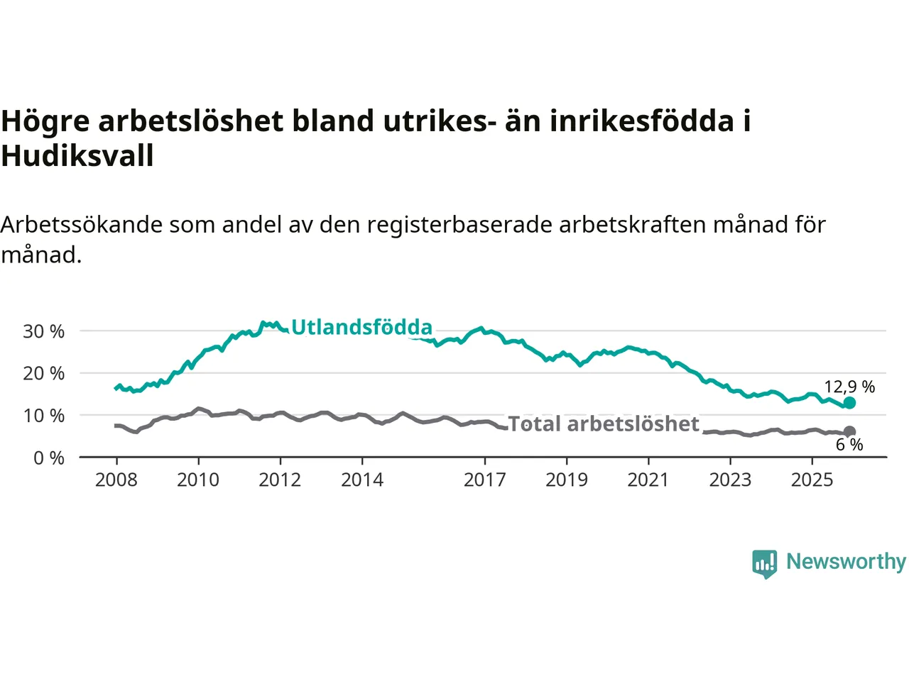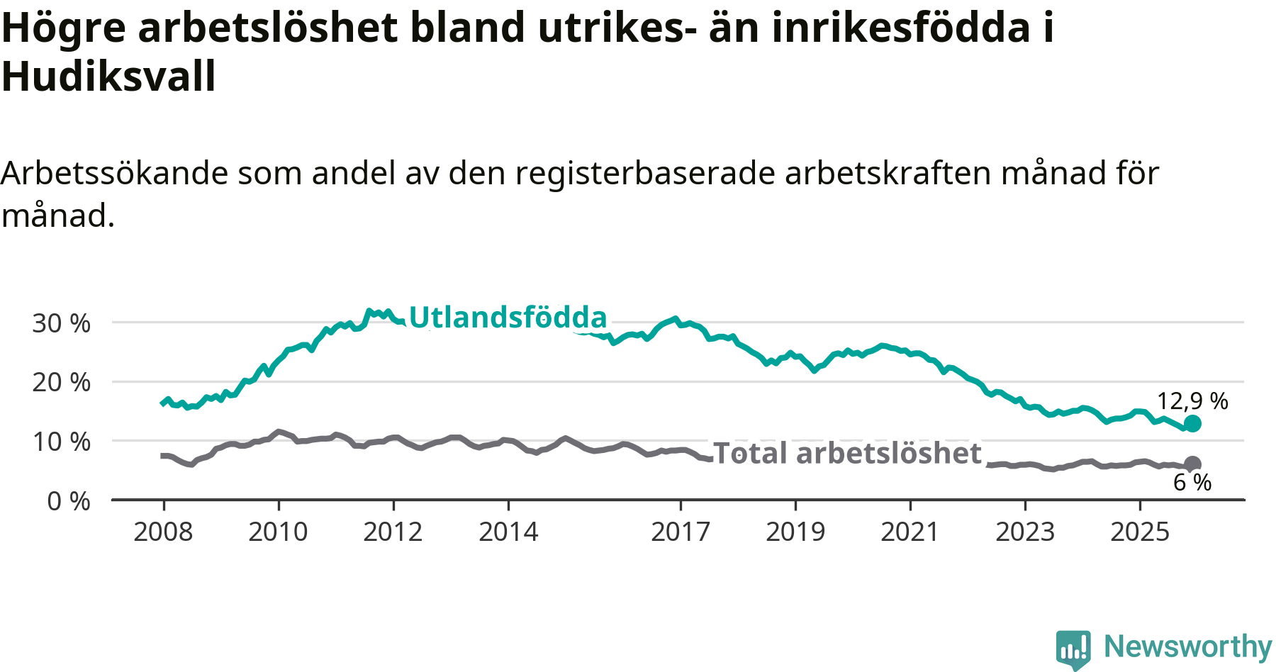 Skillnaden i arbetslöshet mellan utrikesfödda och hela befolkningen är 6,9 procentenheter i Hudiksvall. Det är en betydligt mindre skillnad än för ett år sedan (−1,7 procentenheter).