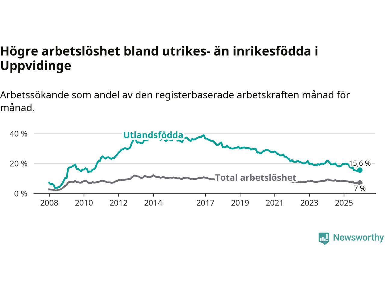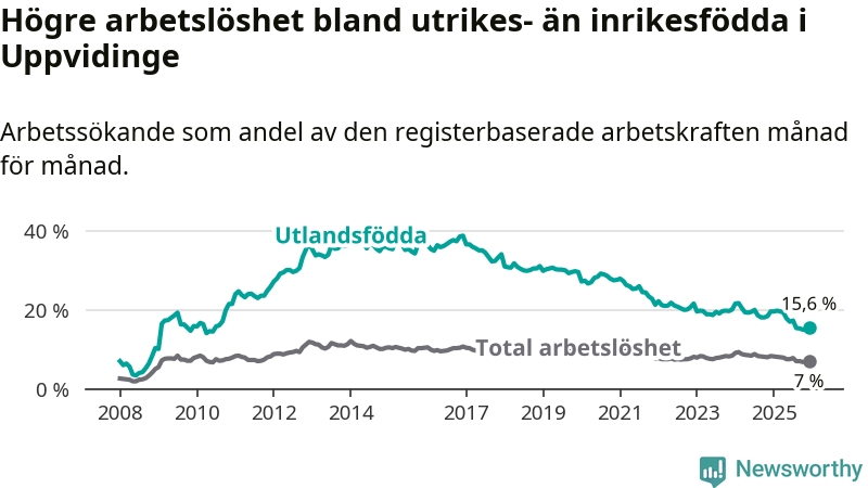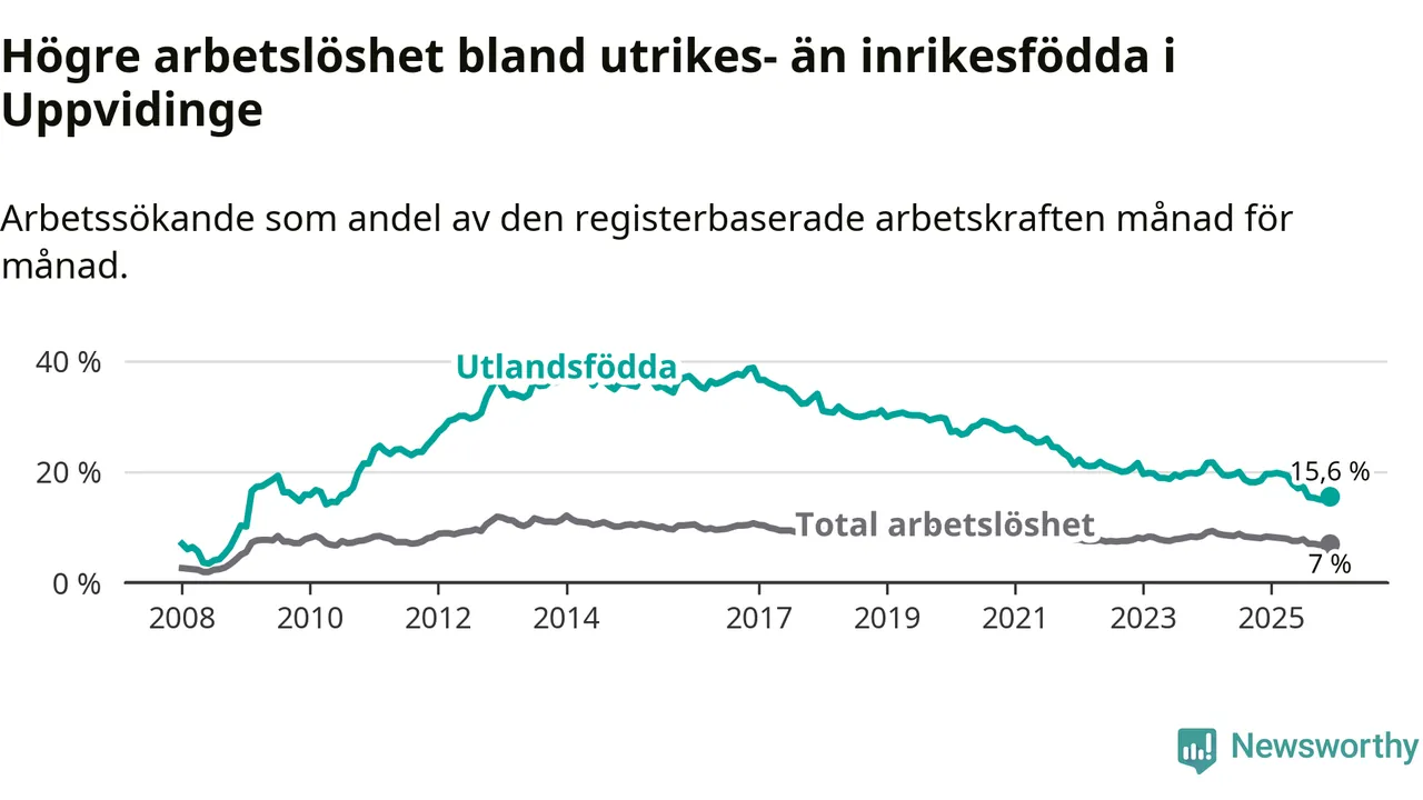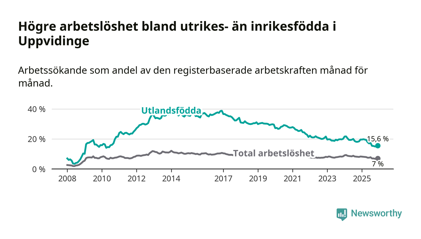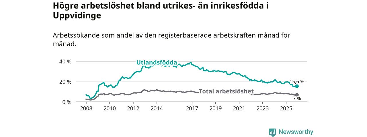 Arbetslösheten bland utlandsfödda var 15,6 procent i Uppvidinge under december månad, motsvarande 171 av 1 096 personer. Det är 4,0 procentenheter färre än vid samma tidpunkt i fjol (−47 om man räknar personer). Därmed är de utlandsföddas arbetslöshet lägre än vid samma tidpunkt i fjol för 17:e månaden i följd. Sedan juli 2024 har arbetslösheten bland utlandsfödda minskat från 20,0 till 15,6 procent.