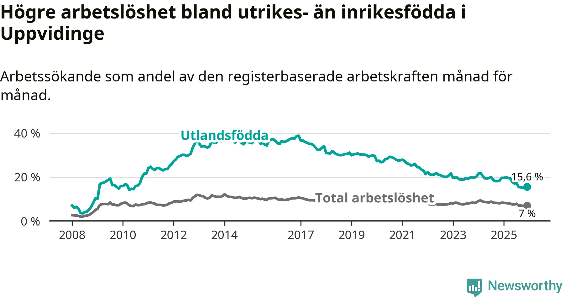 | Bland utlandsfödda | 15,6 % | −4,0 % ▼ | 15,6 % | −2,7 % ▼ | 14,3 % | −1,4 % ▼ |