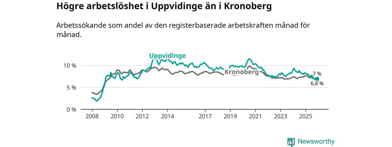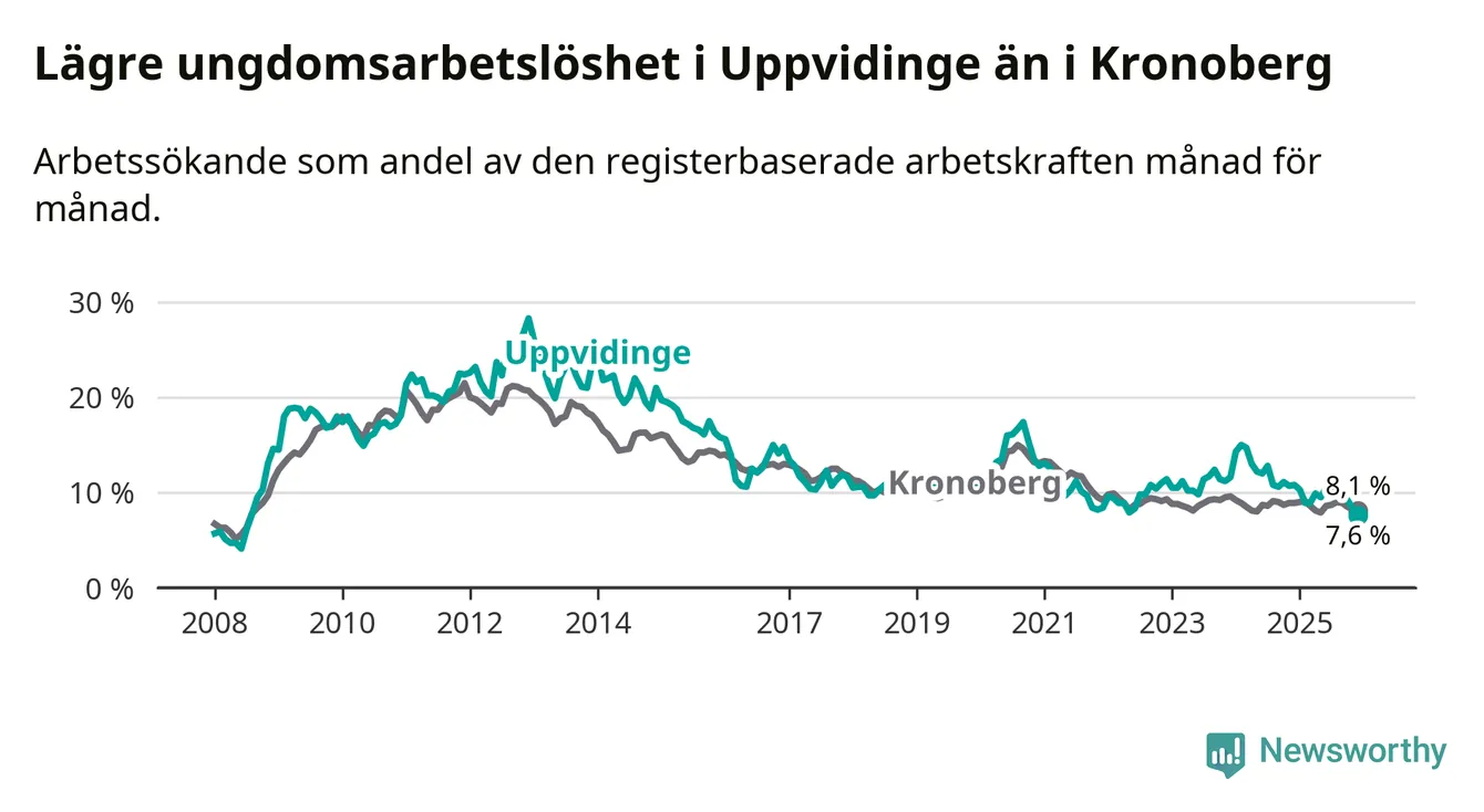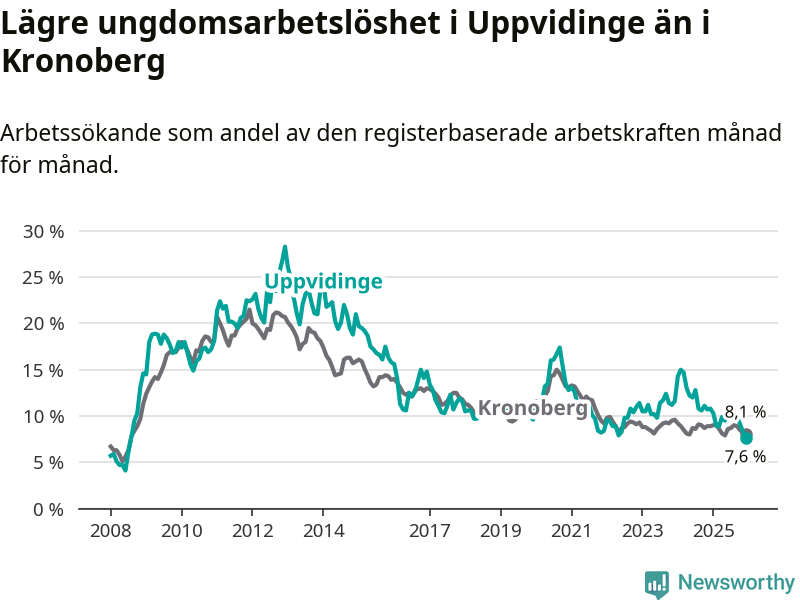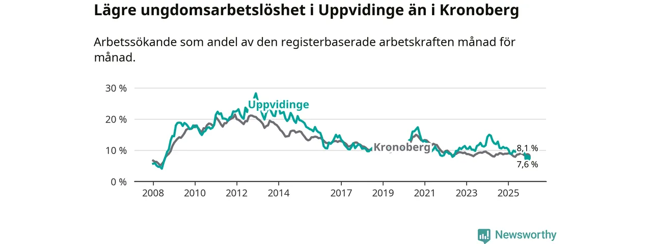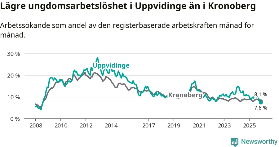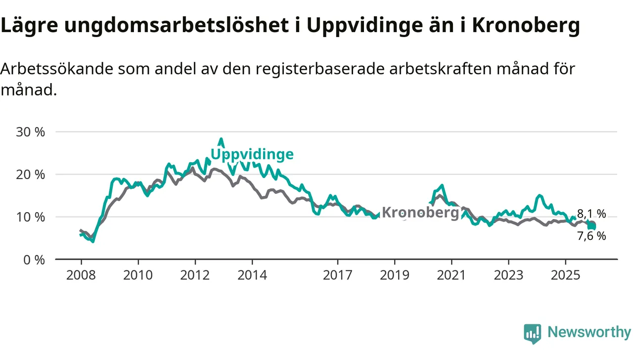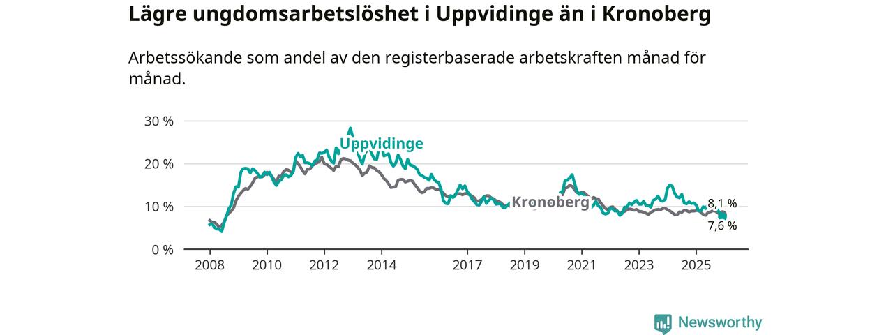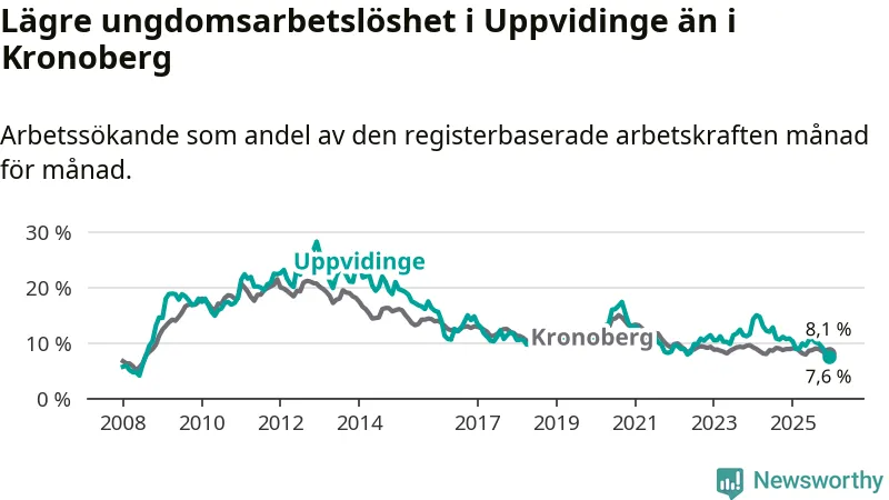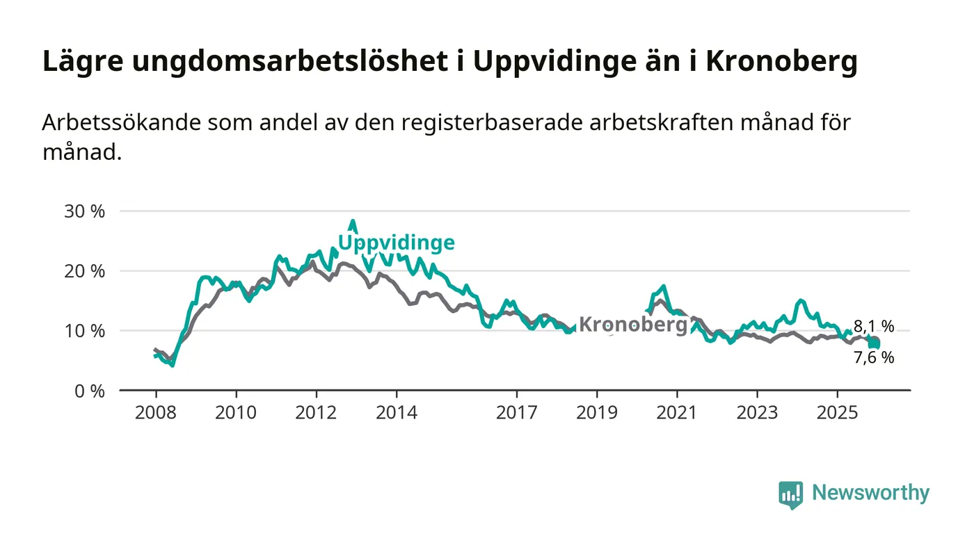 Medan Uppvidinge har högre total arbetslöshet än Kronoberg, ligger ungdomsarbetslösheten 0,5 procentenheter lägre i Uppvidinge.