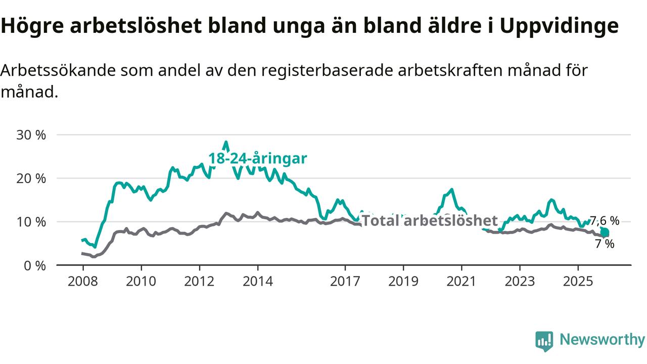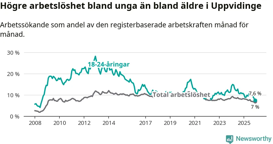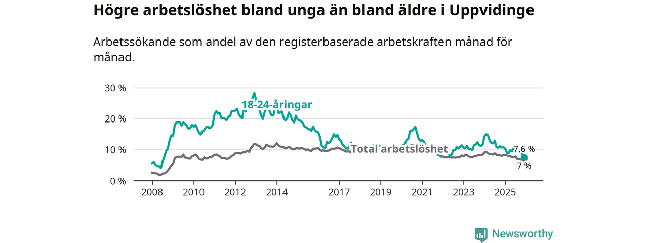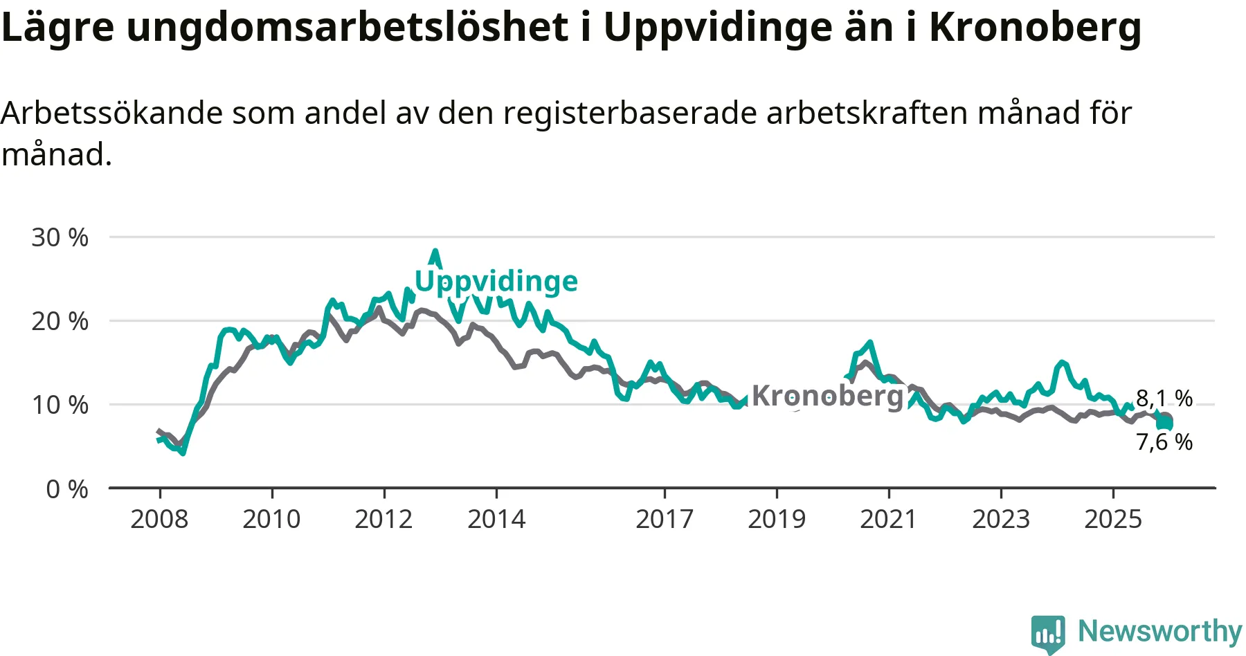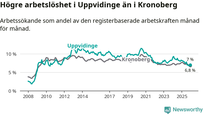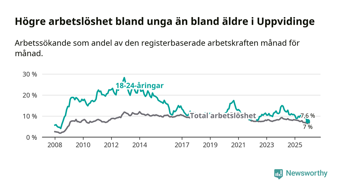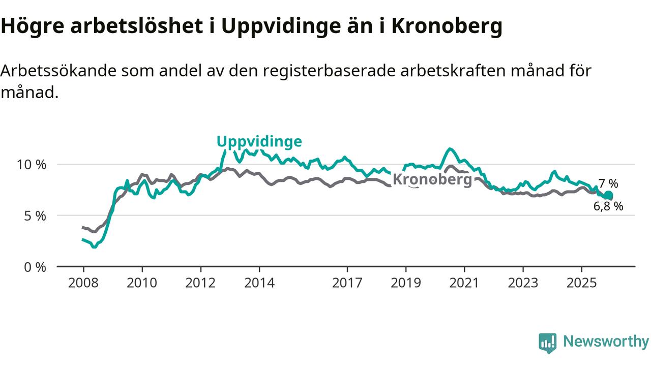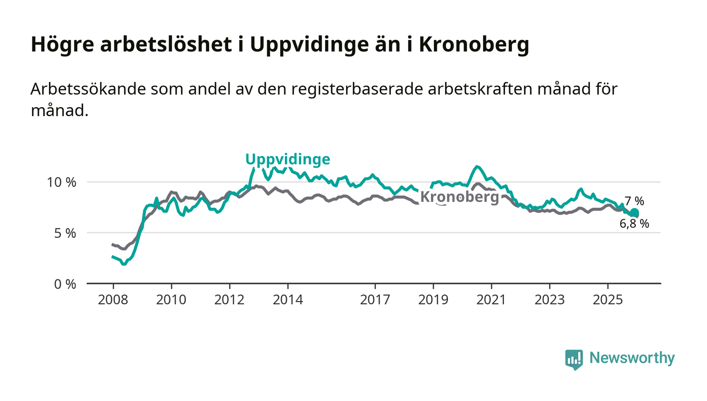 Medan Uppvidinge har högre total arbetslöshet än Kronoberg, ligger ungdomsarbetslösheten 0,5 procentenheter lägre i Uppvidinge.