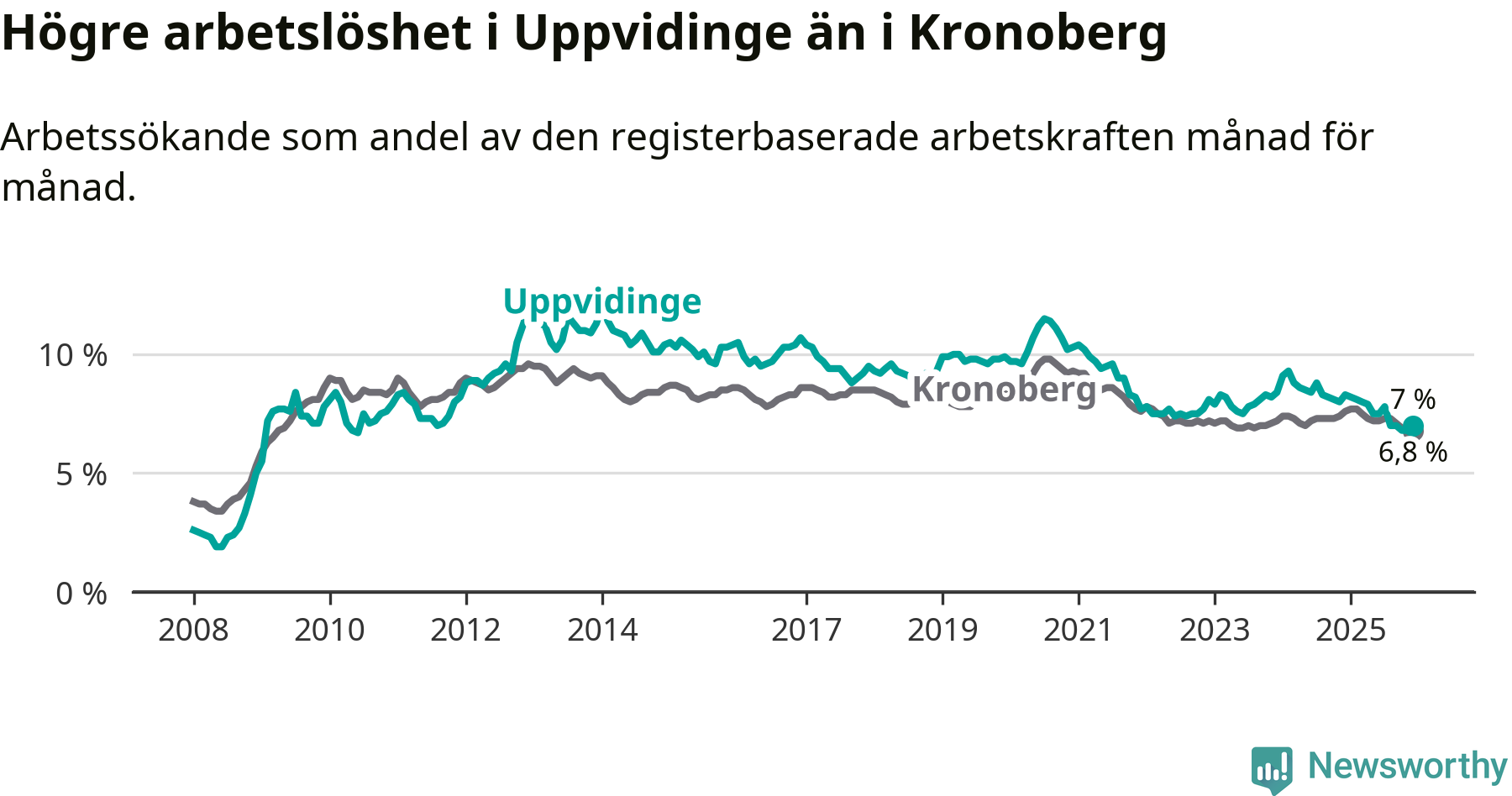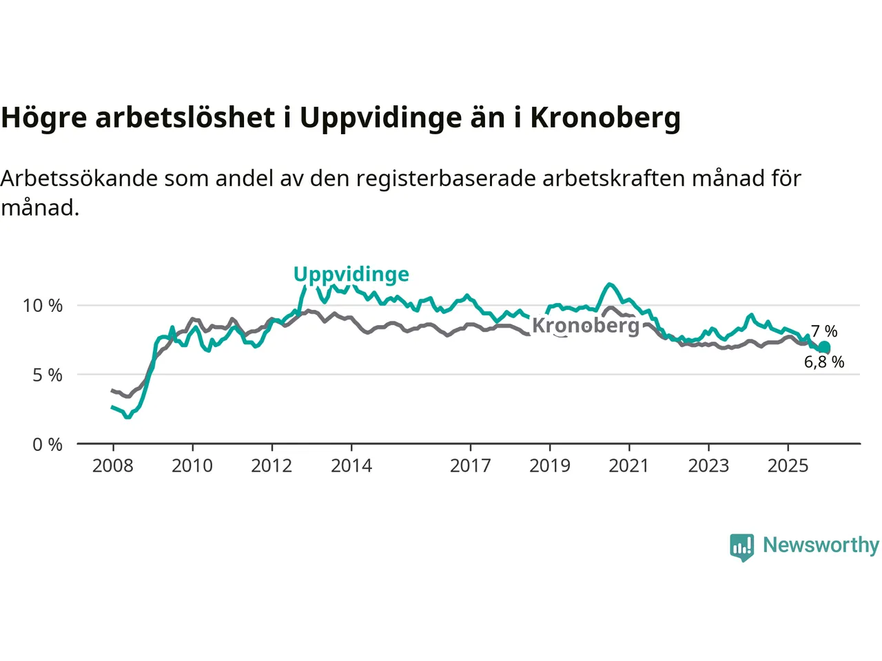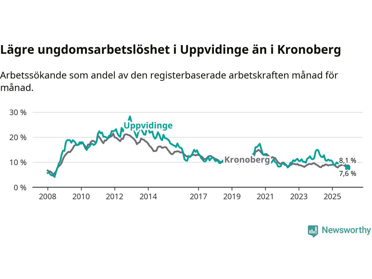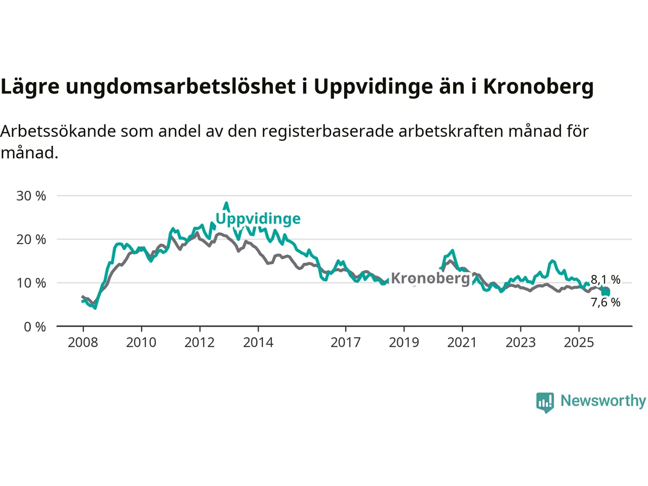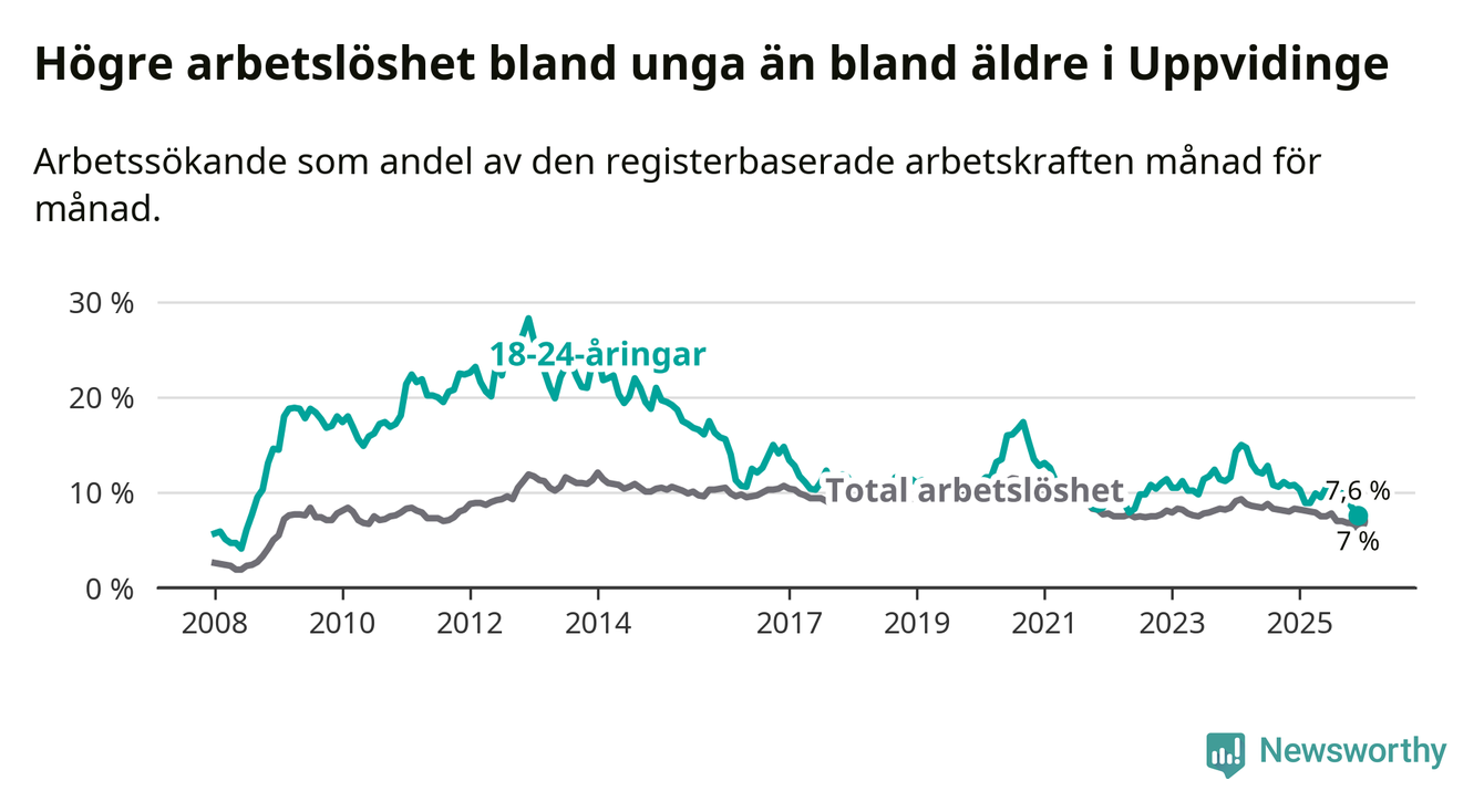 Medan Uppvidinge har högre total arbetslöshet än Kronoberg, ligger ungdomsarbetslösheten 0,5 procentenheter lägre i Uppvidinge.