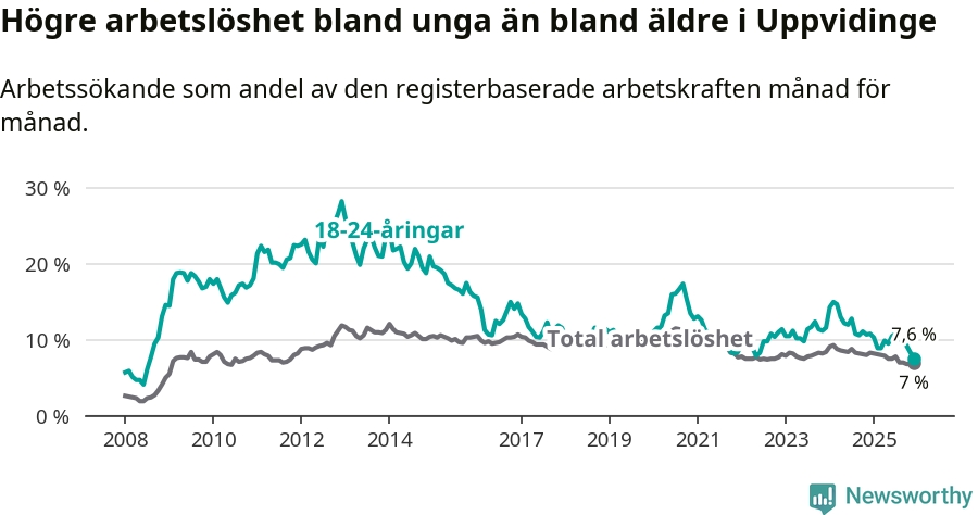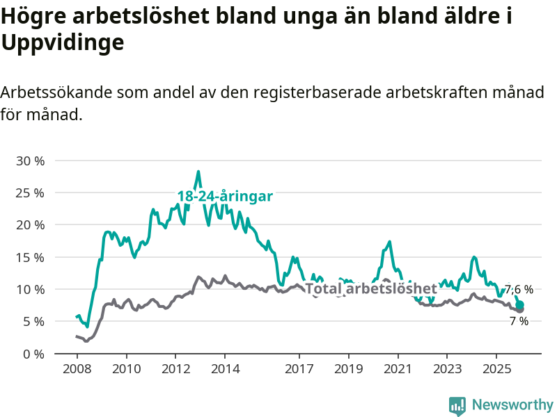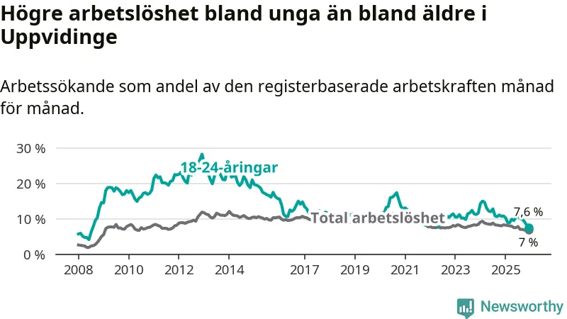 I och med den senaste månadens nedgång har de ungas arbetslöshet i Uppvidinge sjunkit 17 månader i följd (ner från 12,8 procent i juli 2024 till 7,6 procent nu). Den nuvarande arbetslöshetsnivån är den lägsta sedan juli 2008.