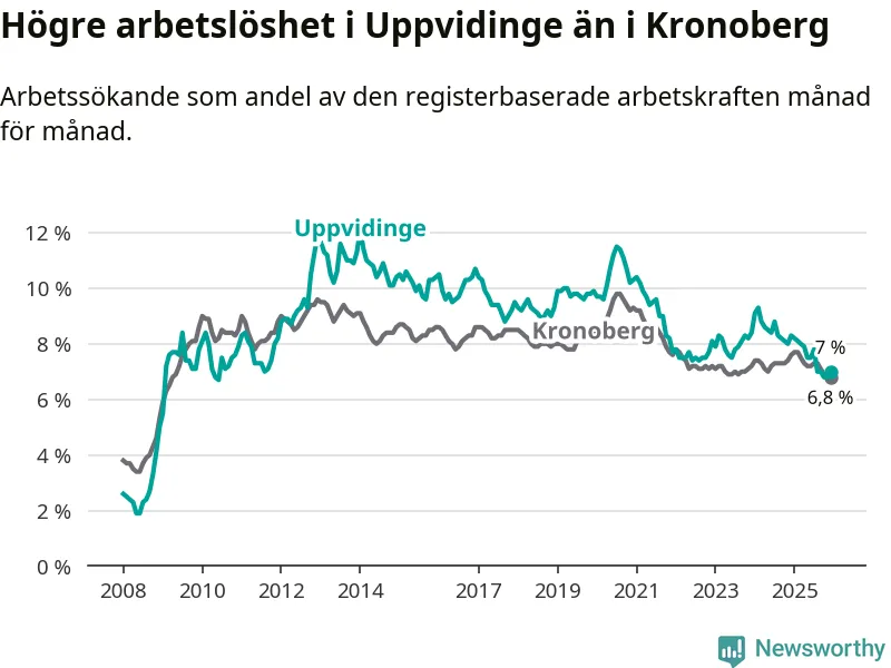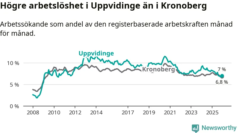 Under december månad rapporterade Uppvidinge kommun en total arbetslöshet på 7,0 procent. Det är en minskning jämfört med samma tidpunkt i fjol (−1,3 procentenheter). Även i Kronobergs län sjunker arbetslösheten .