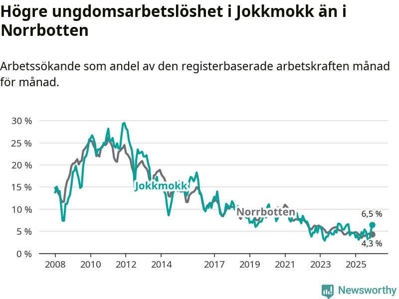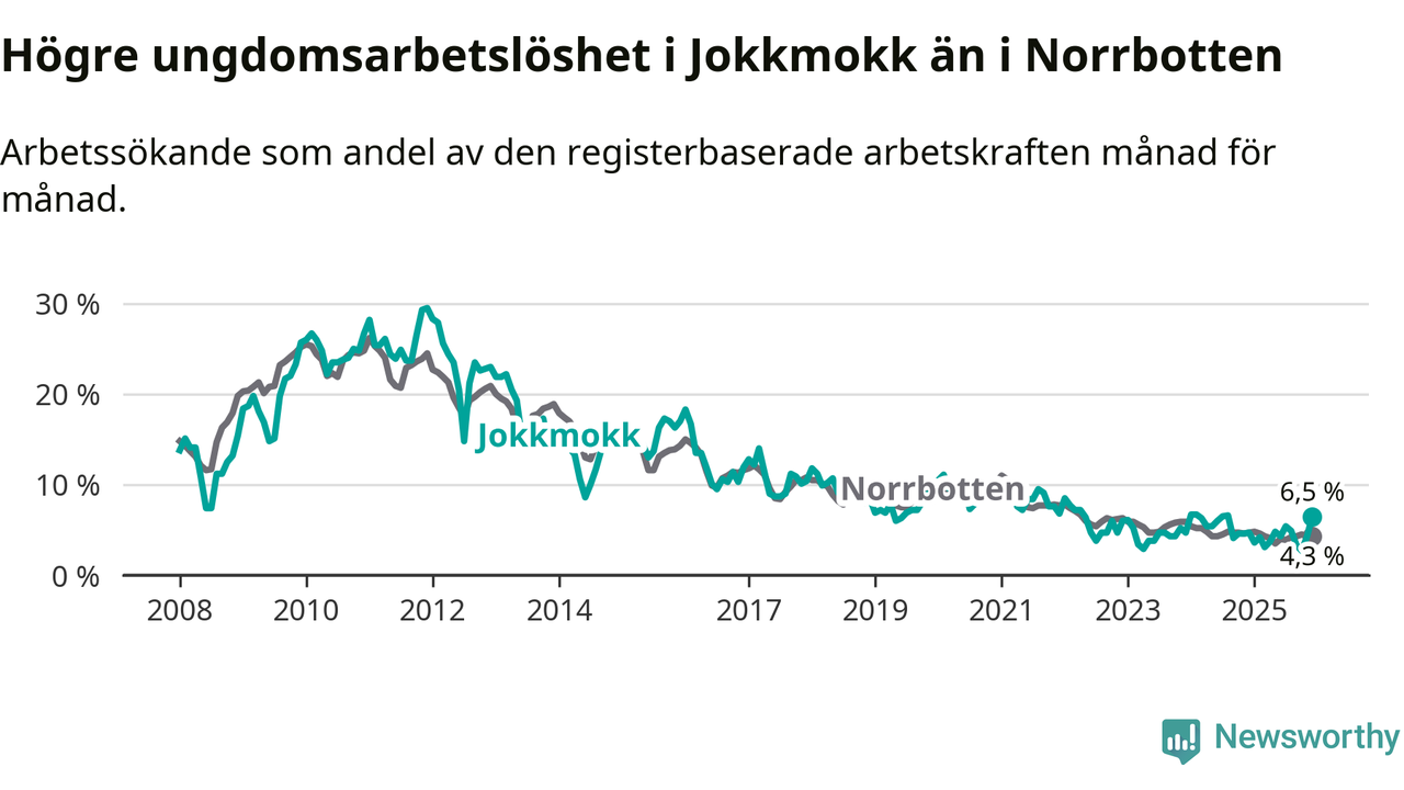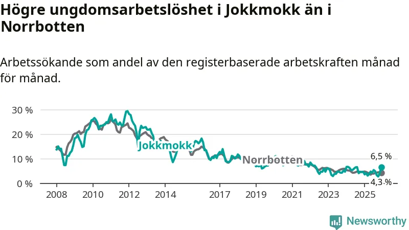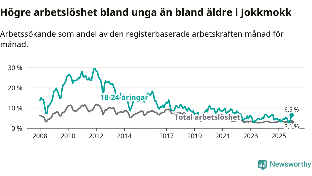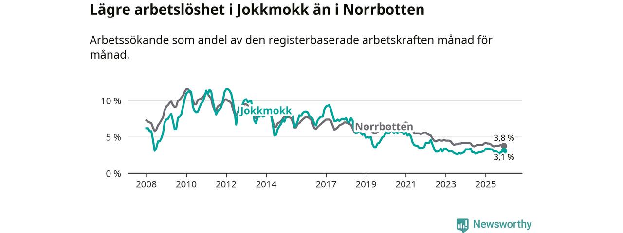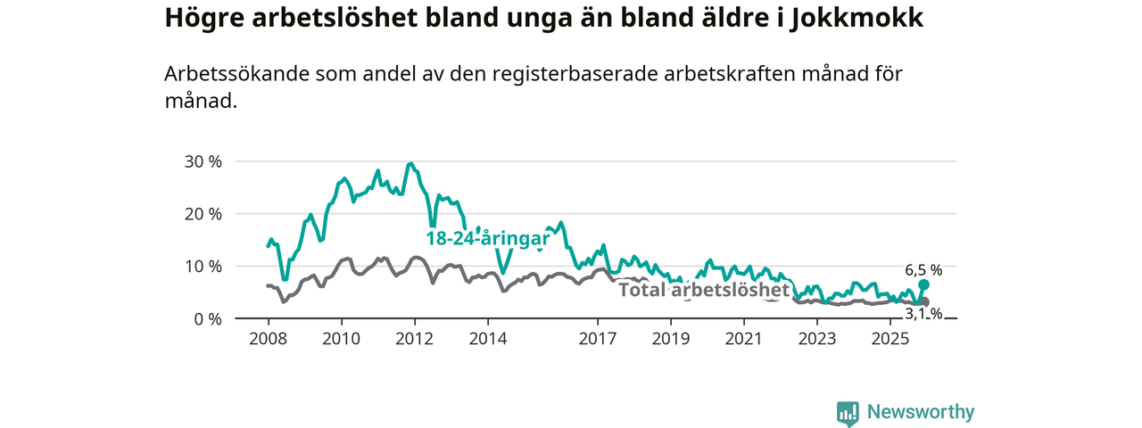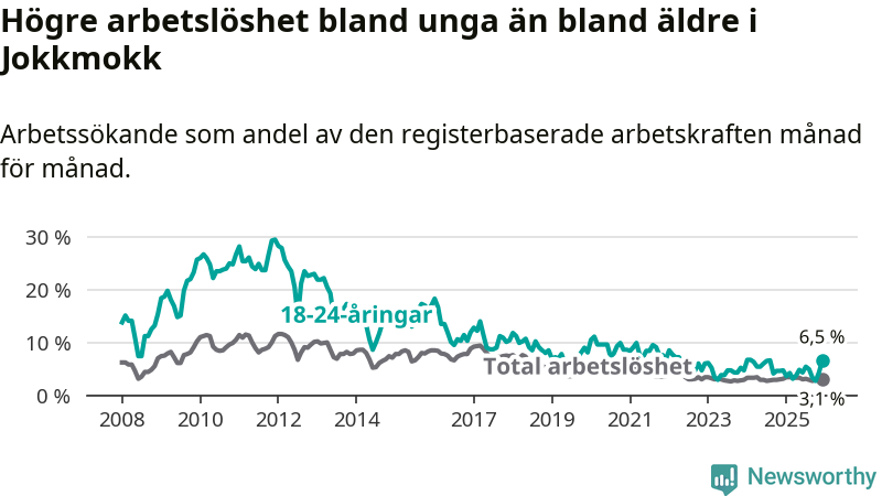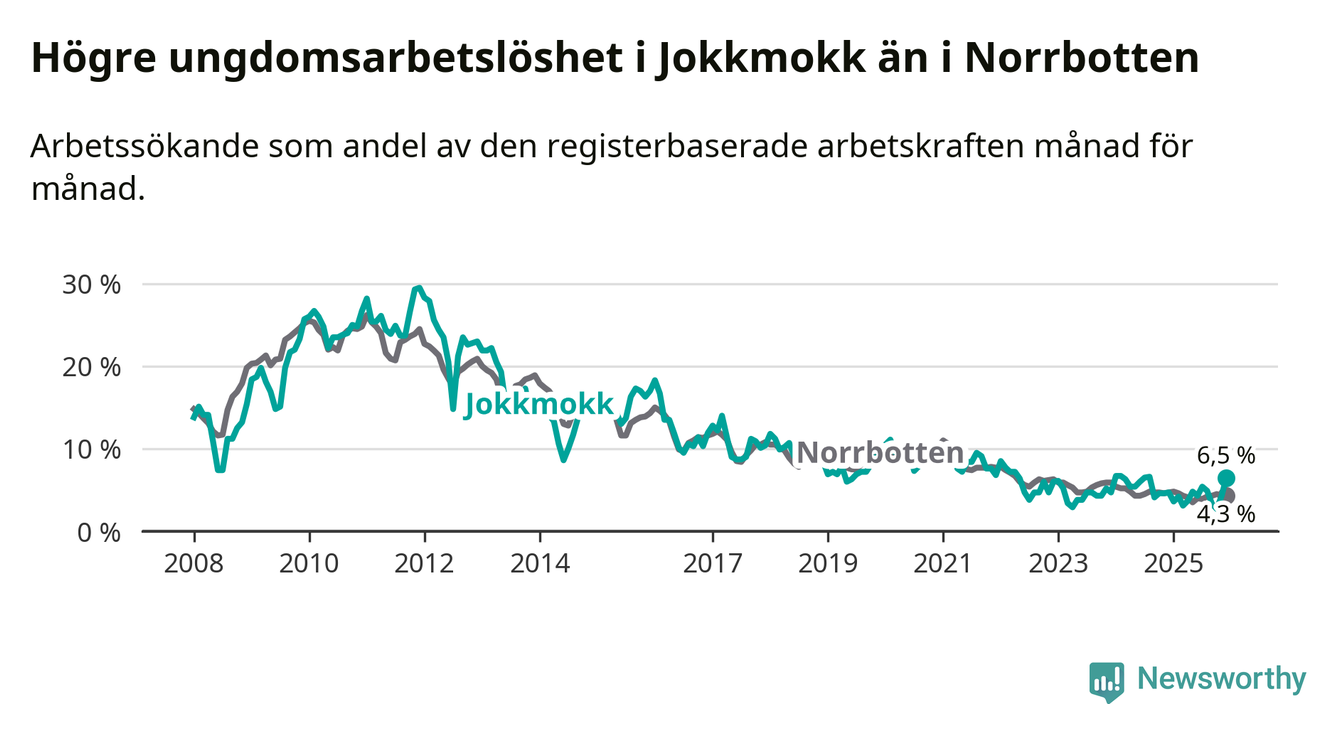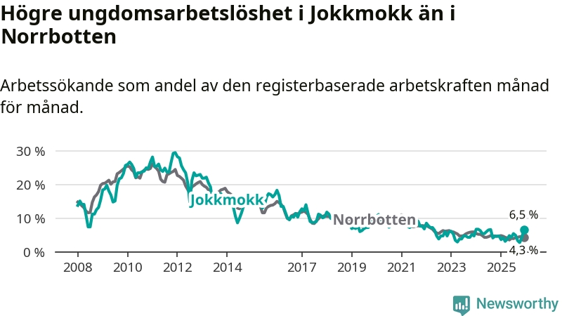 Medan Jokkmokk har lägre total arbetslöshet än Norrbotten, ligger ungdomsarbetslösheten 2,2 procentenheter högre i Jokkmokk.