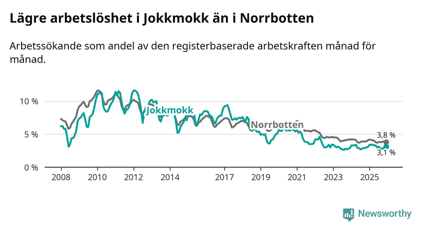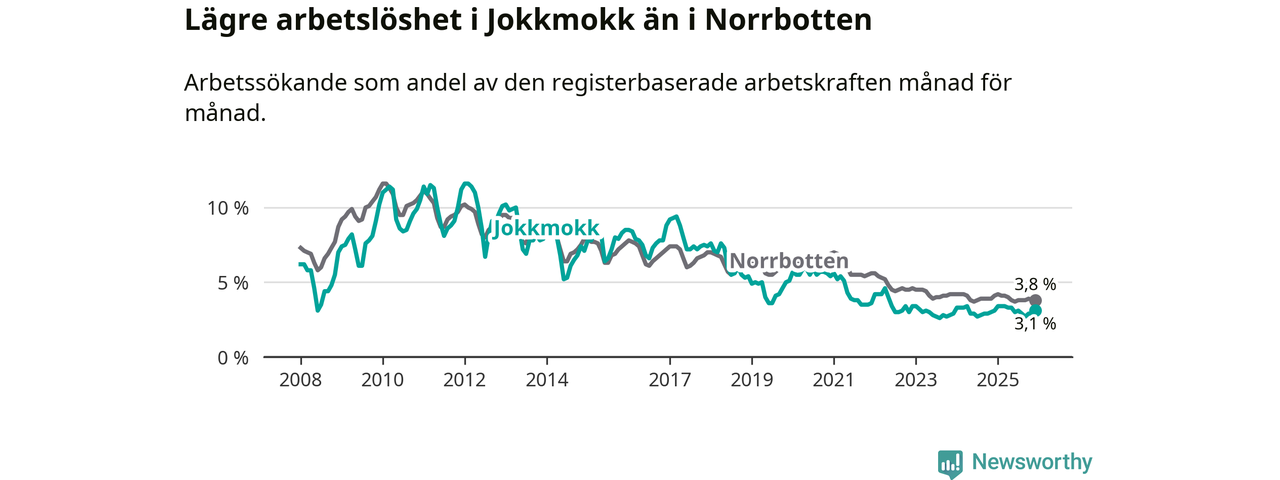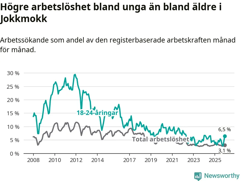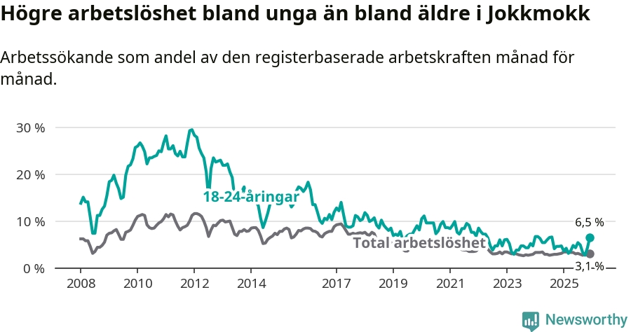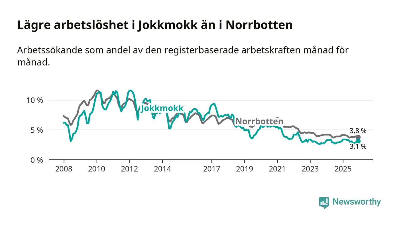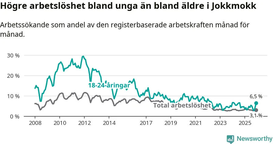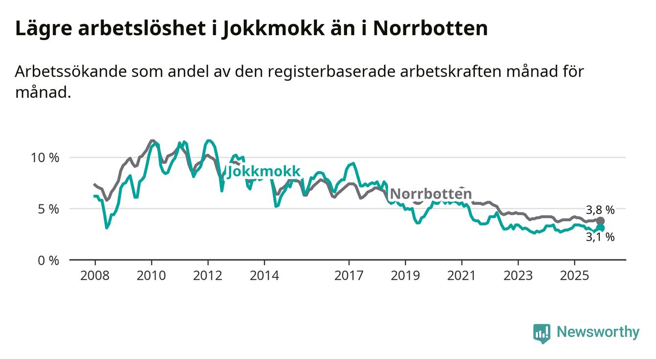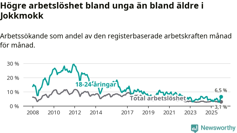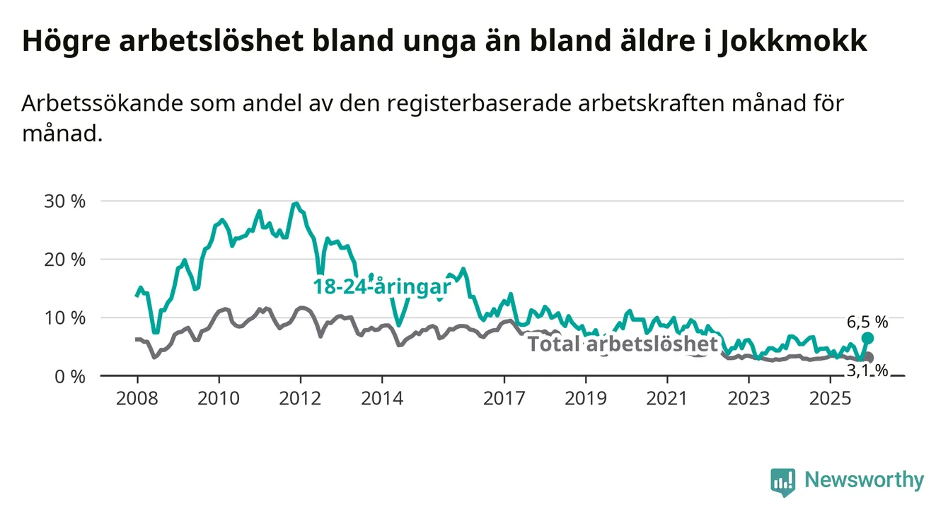 Medan Jokkmokk har lägre total arbetslöshet än Norrbotten, ligger ungdomsarbetslösheten 2,2 procentenheter högre i Jokkmokk.