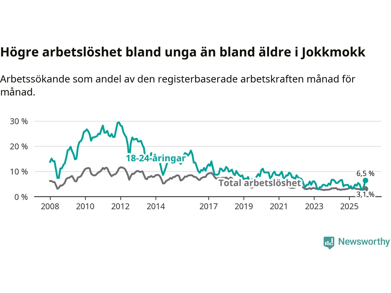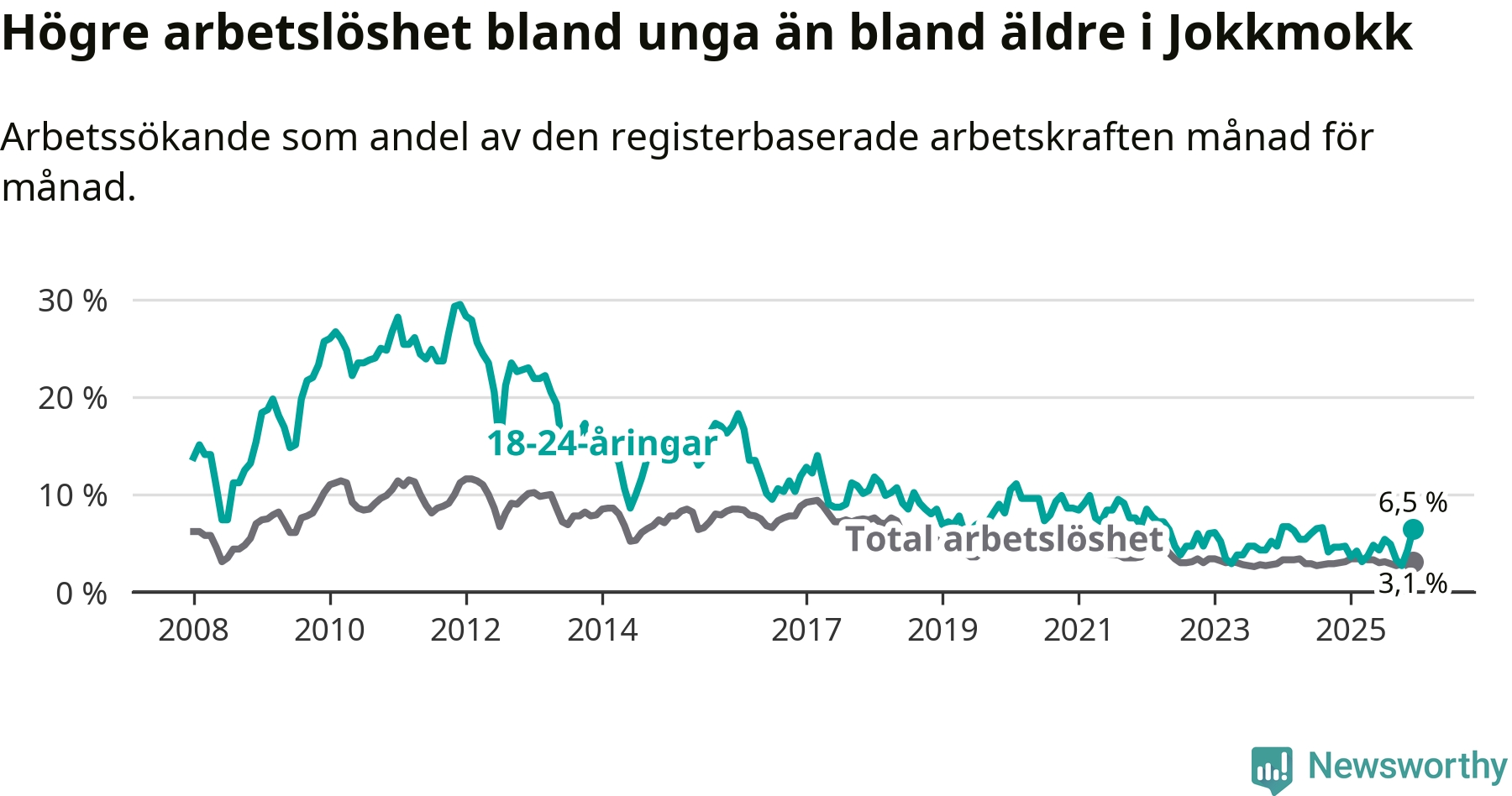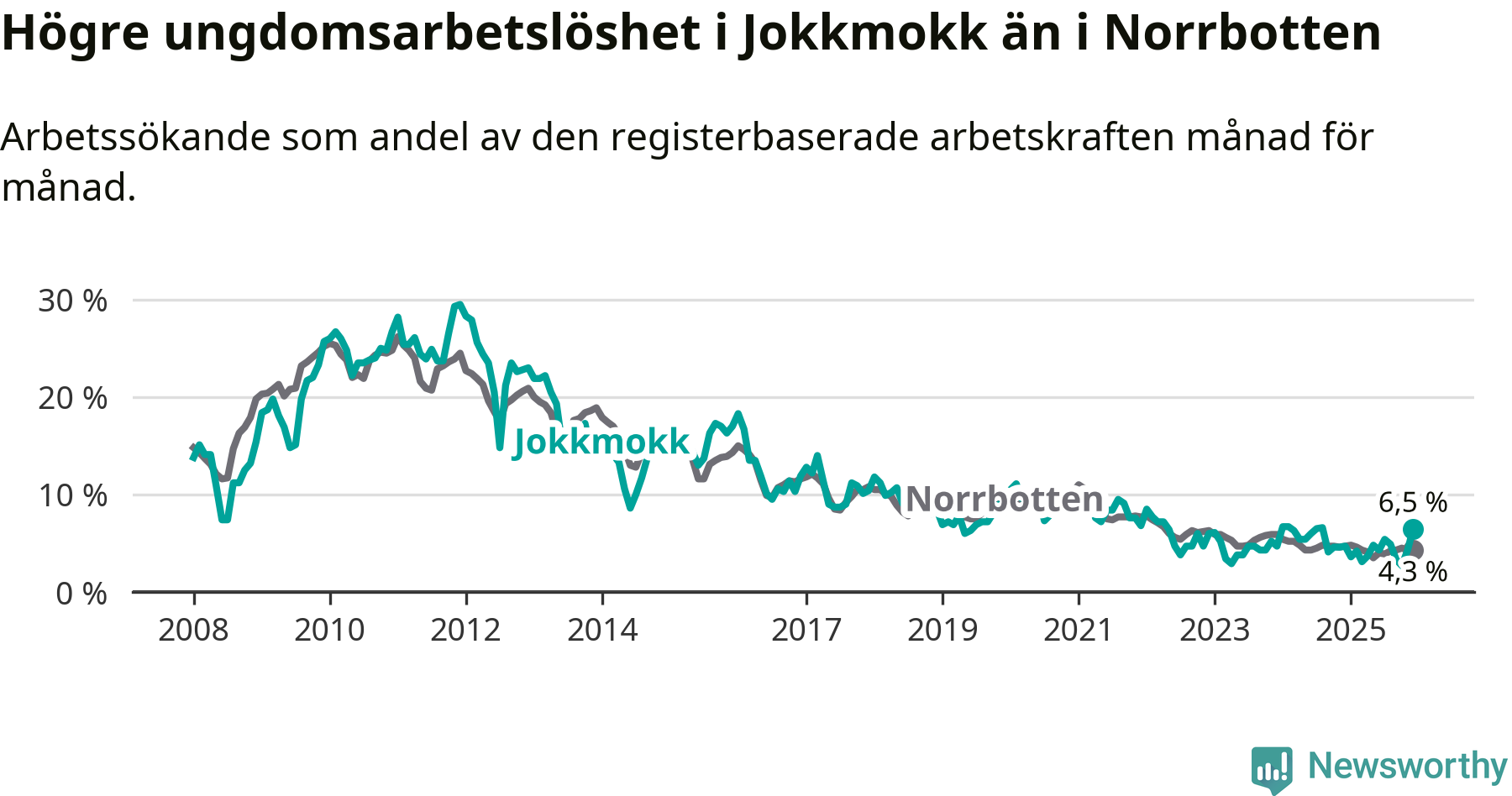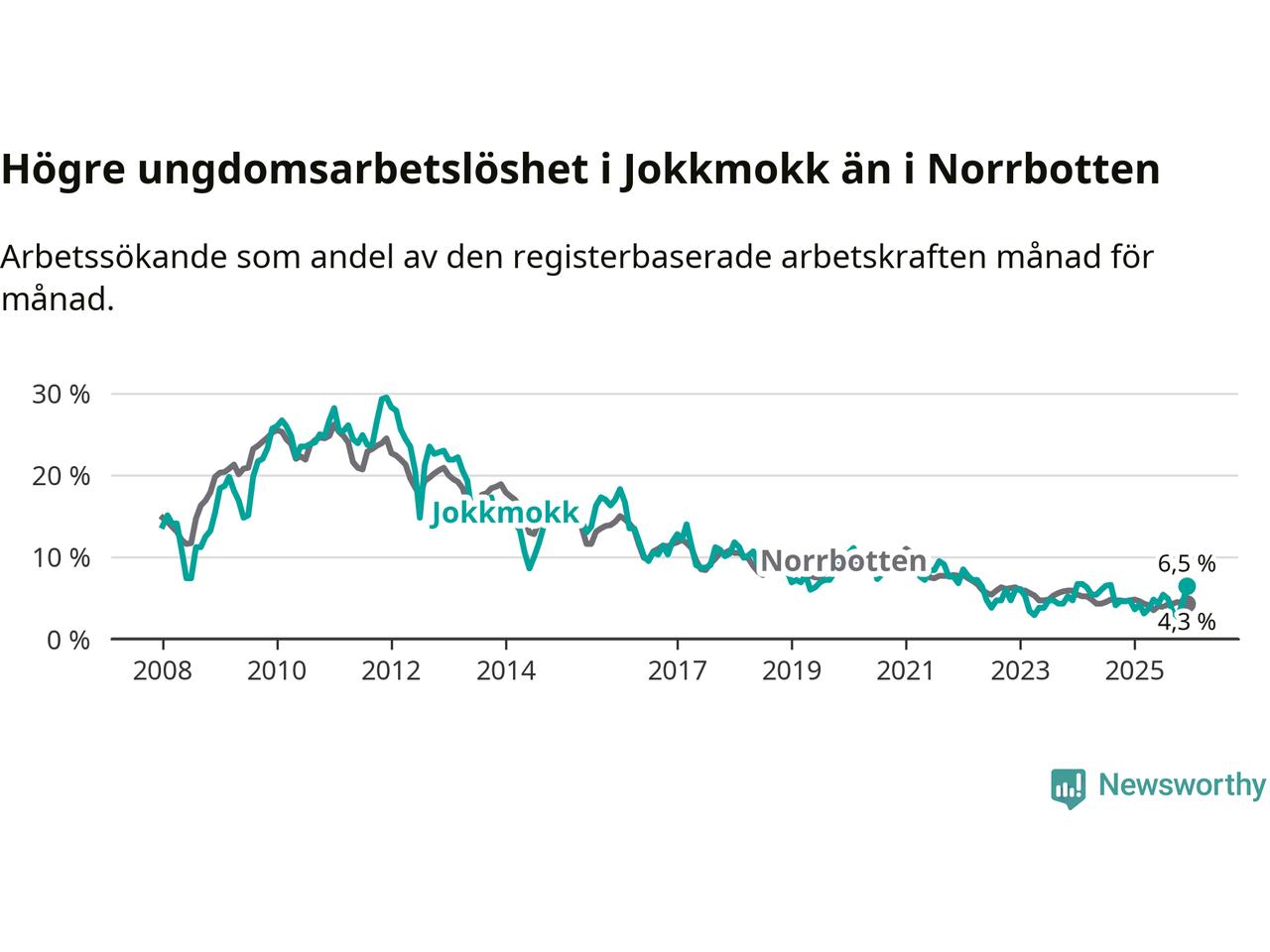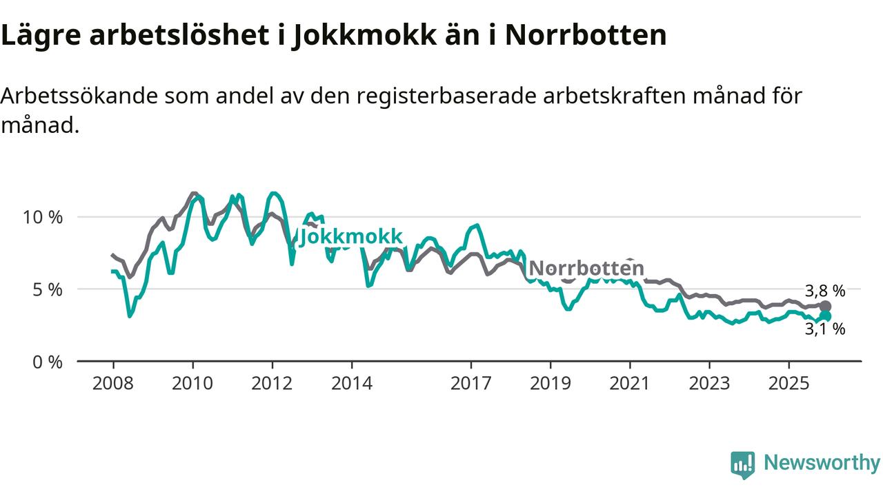Medan Jokkmokk har lägre total arbetslöshet än Norrbotten, ligger ungdomsarbetslösheten 2,2 procentenheter högre i Jokkmokk.