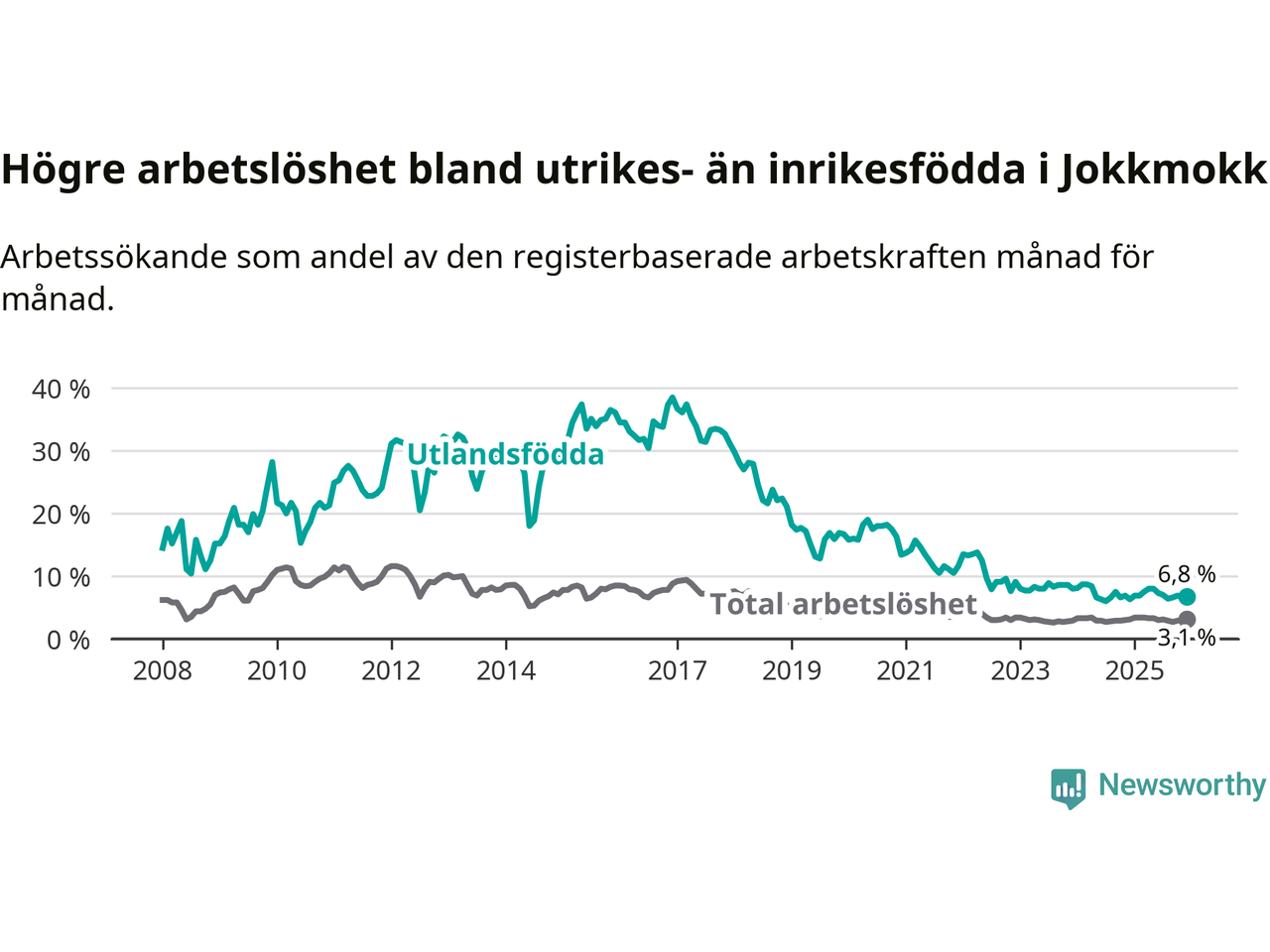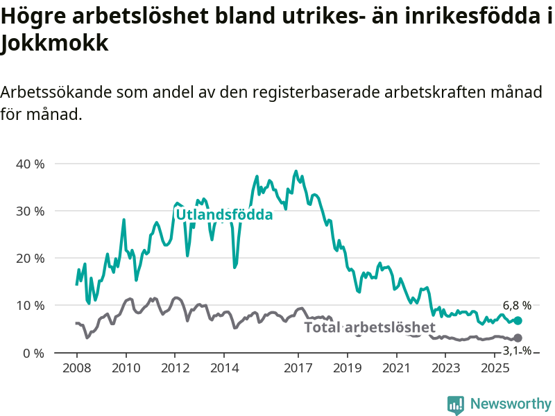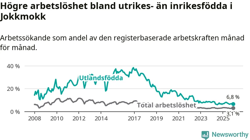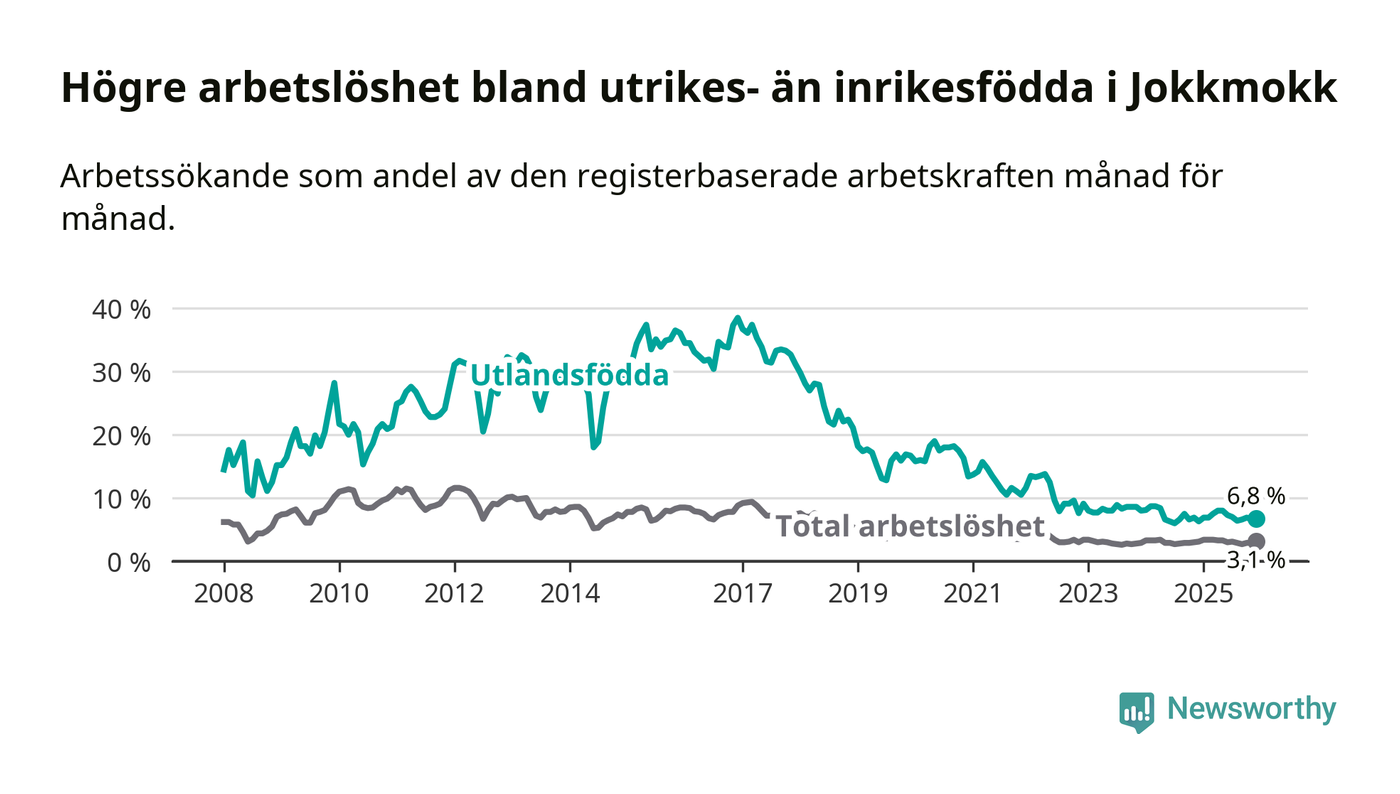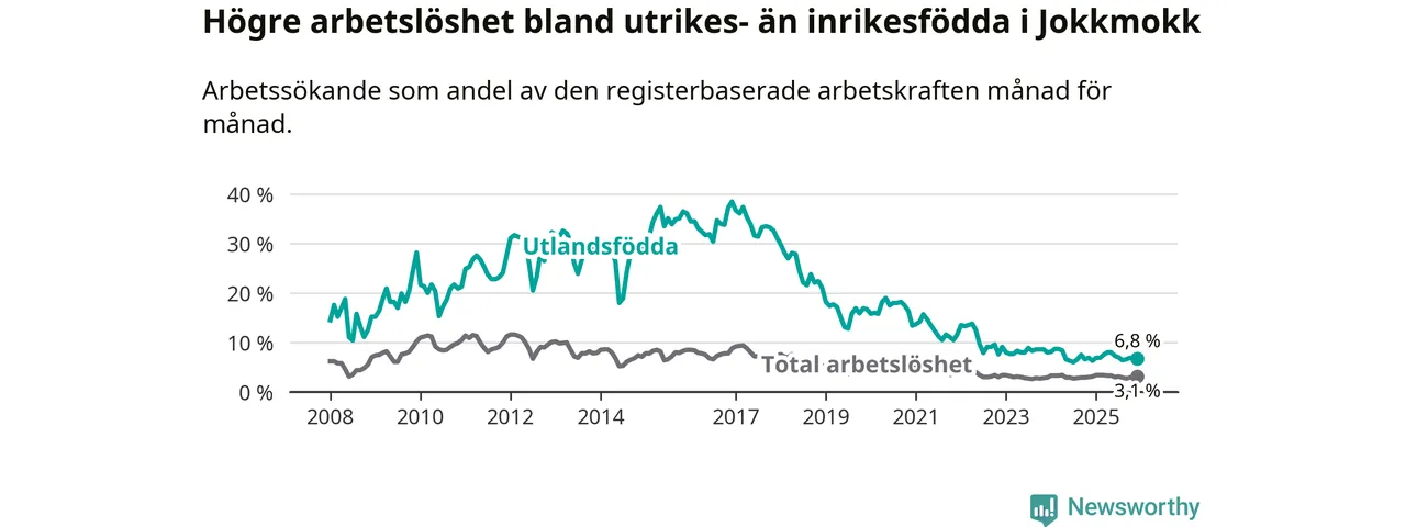 Arbetslösheten bland utlandsfödda var 6,8 procent i Jokkmokk under december månad, motsvarande 24 av 353 personer. Det är 0,5 procentenheter fler än vid samma tidpunkt i fjol (+3 om man räknar personer). Den senaste månadens uppgång innebär ett trendbrott. Under de ett föregående månaderna hade arbetslösheten bland utlandsfödda varit lägre än motsvarande tidpunkt året innan.