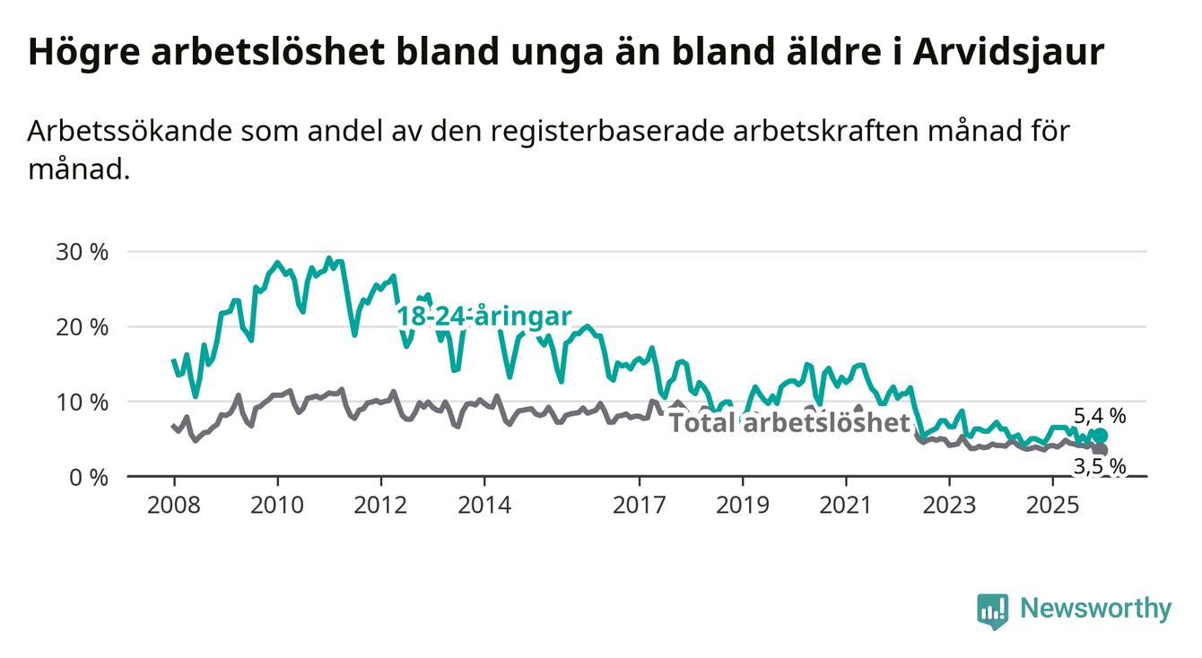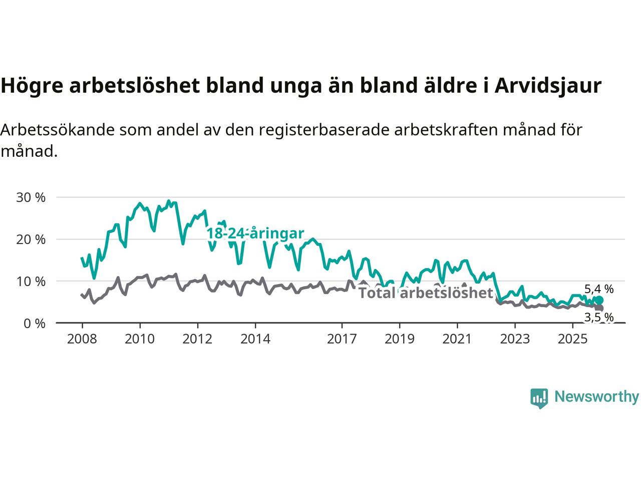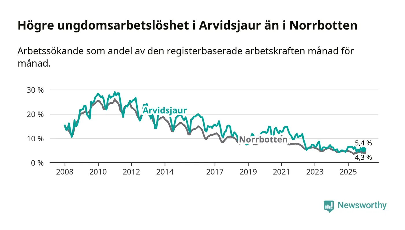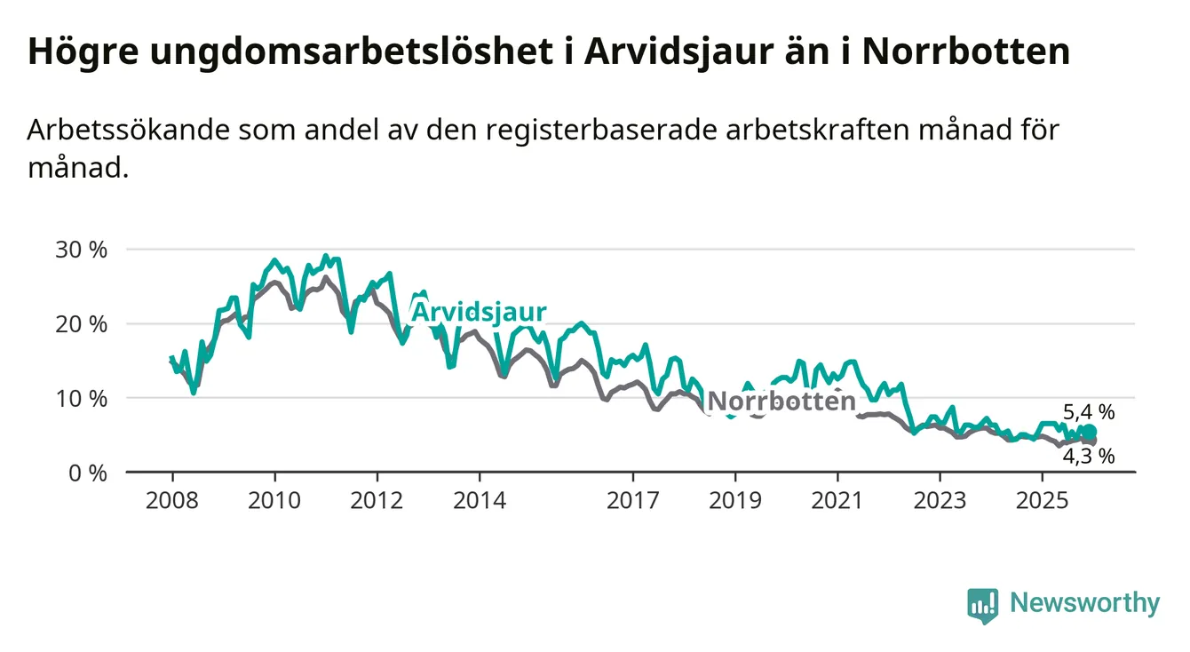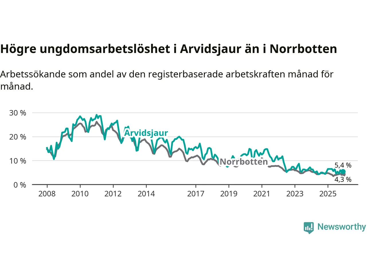 Medan Arvidsjaur har lägre total arbetslöshet än Norrbotten, ligger ungdomsarbetslösheten 1,1 procentenheter högre i Arvidsjaur.