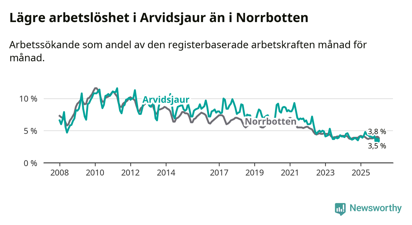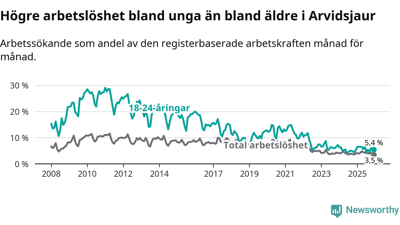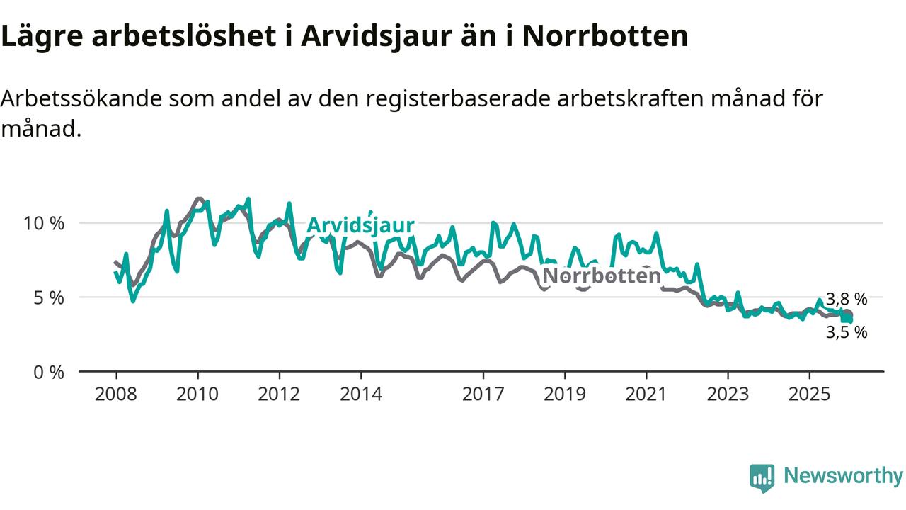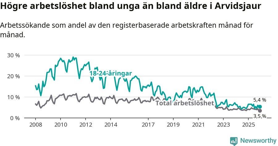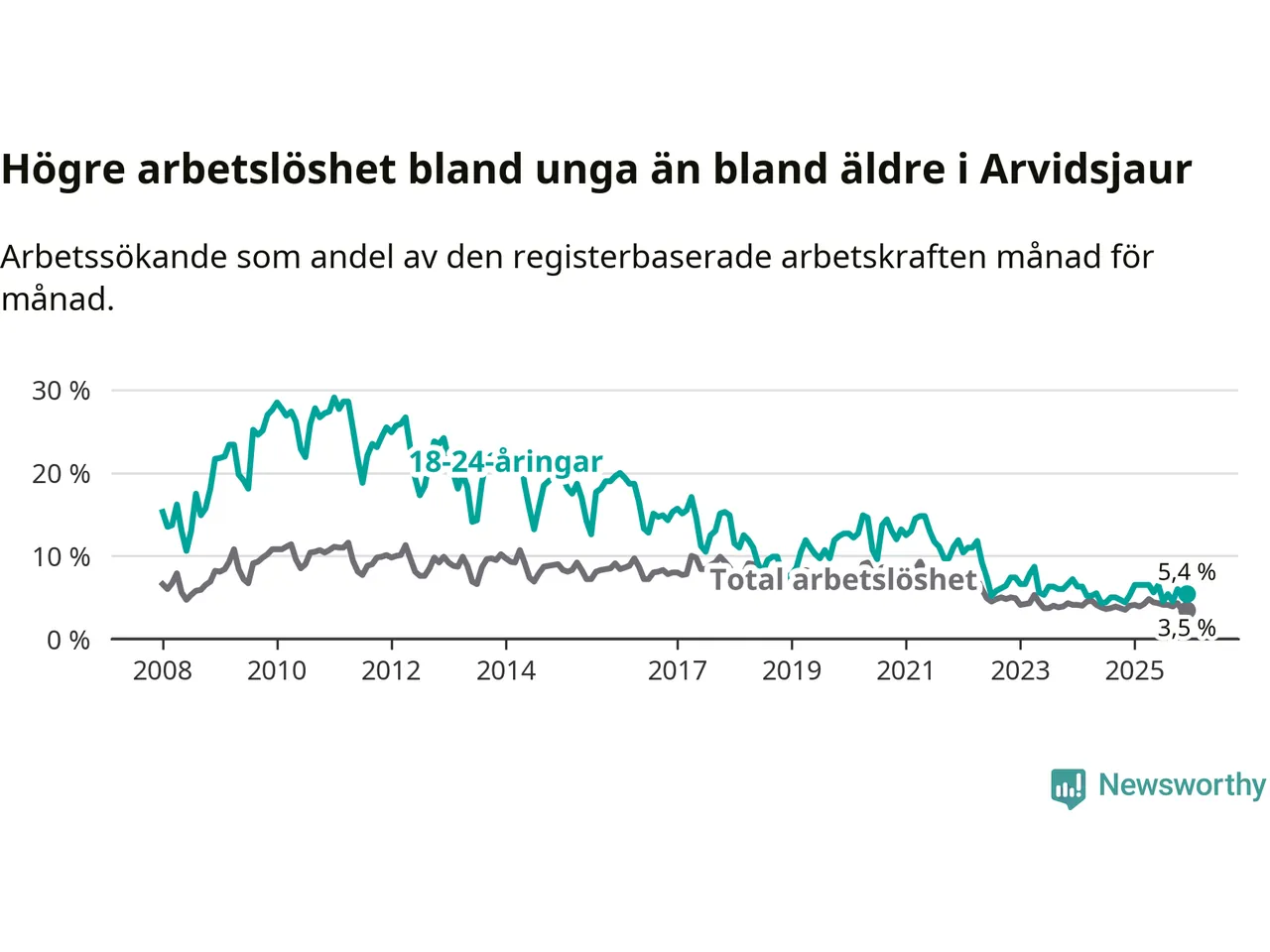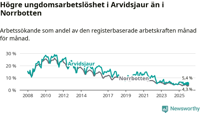 Medan Arvidsjaur har lägre total arbetslöshet än Norrbotten, ligger ungdomsarbetslösheten 1,1 procentenheter högre i Arvidsjaur.