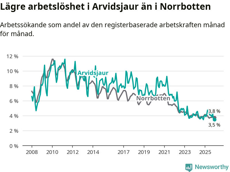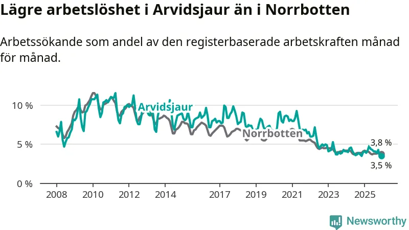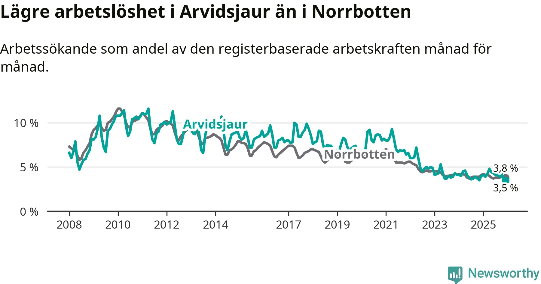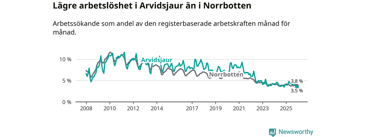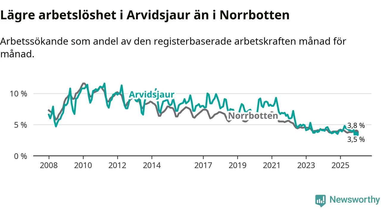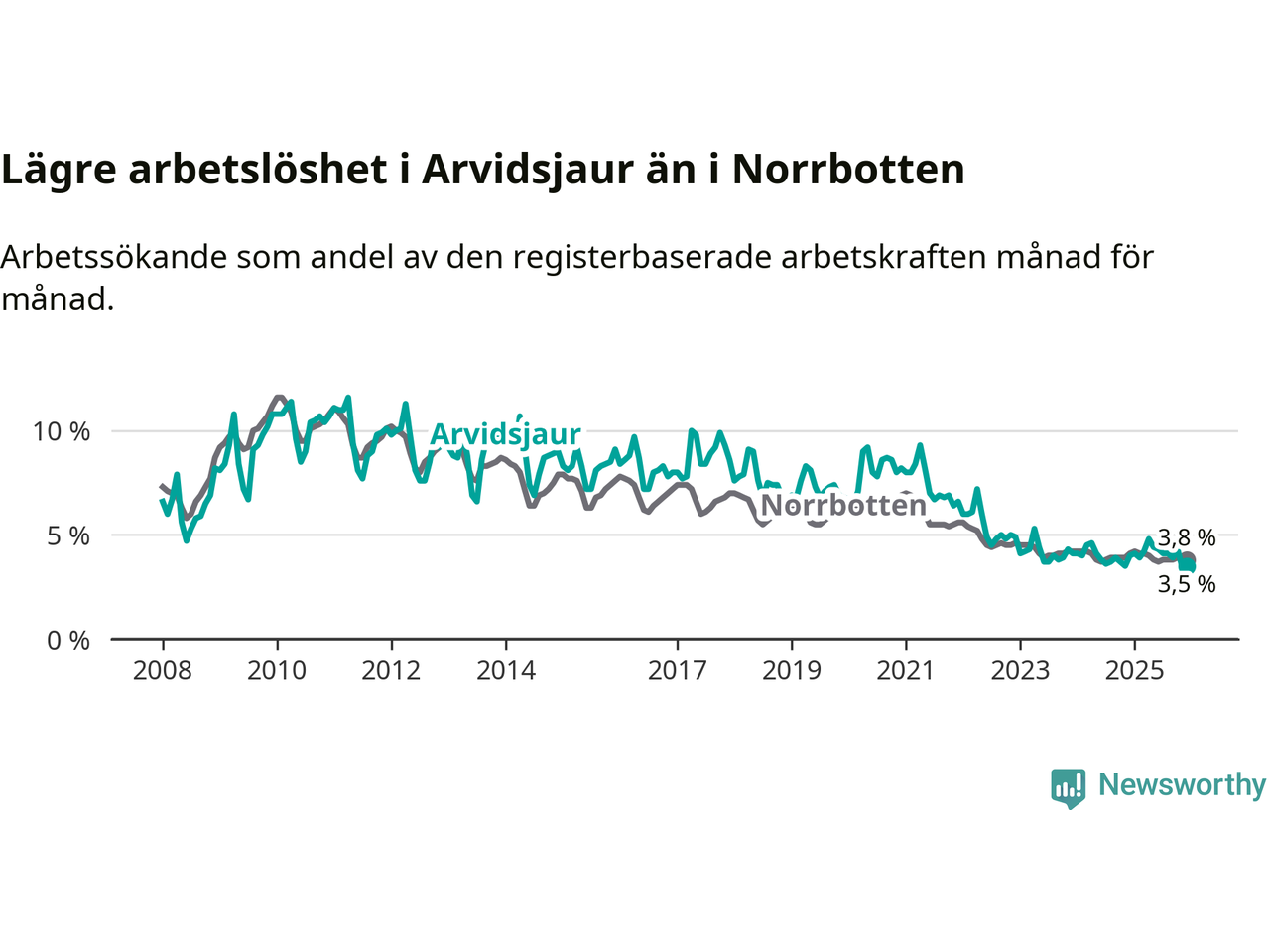 Under december månad rapporterade Arvidsjaurs kommun en total arbetslöshet på 3,5 procent. Det är en minskning jämfört med samma tidpunkt i fjol (−0,5 procentenheter). Även i Norrbottens län sjunker arbetslösheten .