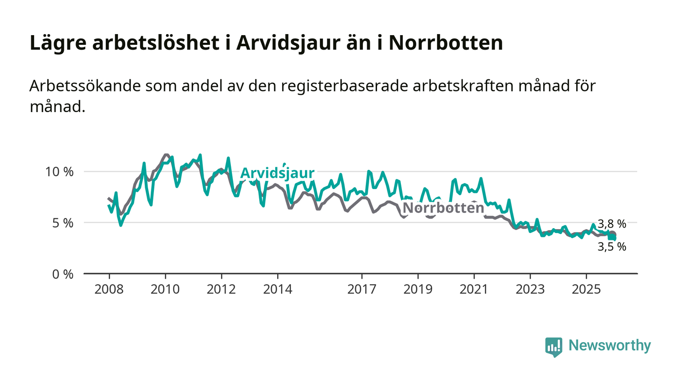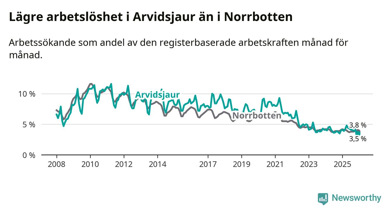 Arvidsjaur hade redan tidigare lägre arbetslöshet än snittet i hela Norrbottens län och nu växer klyftan (3,5 procent i kommunen, jämfört med 3,8 procent i hela länet). Gällivare har den lägsta arbetslösheten i länet (2,3 procent), medan Haparanda har den högsta (7,0 procent). För att Arvidsjaur skulle komma ner i samma arbetslöshetsnivå som Gällivare skulle 35 personer behöva sysselsättas.