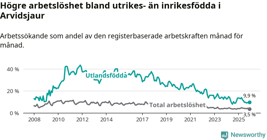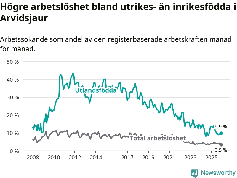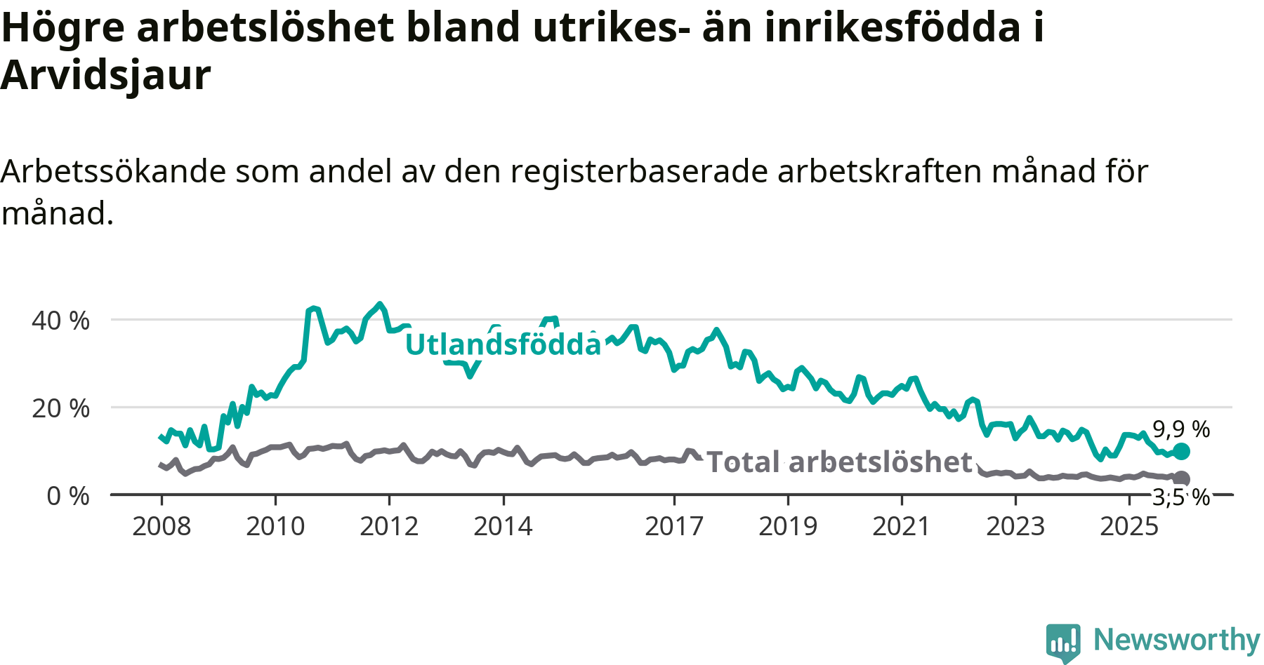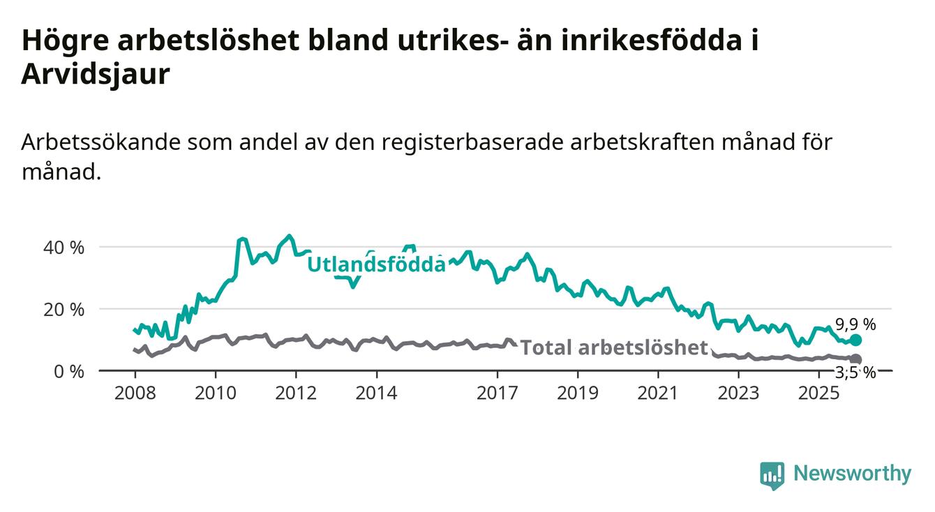 Arbetslösheten bland utlandsfödda var 9,9 procent i Arvidsjaur under december månad, motsvarande 34 av 343 personer. Det är 3,7 procentenheter färre än vid samma tidpunkt i fjol (−13 om man räknar personer).
