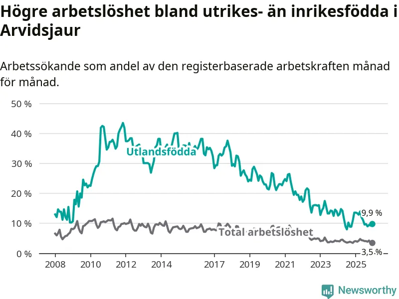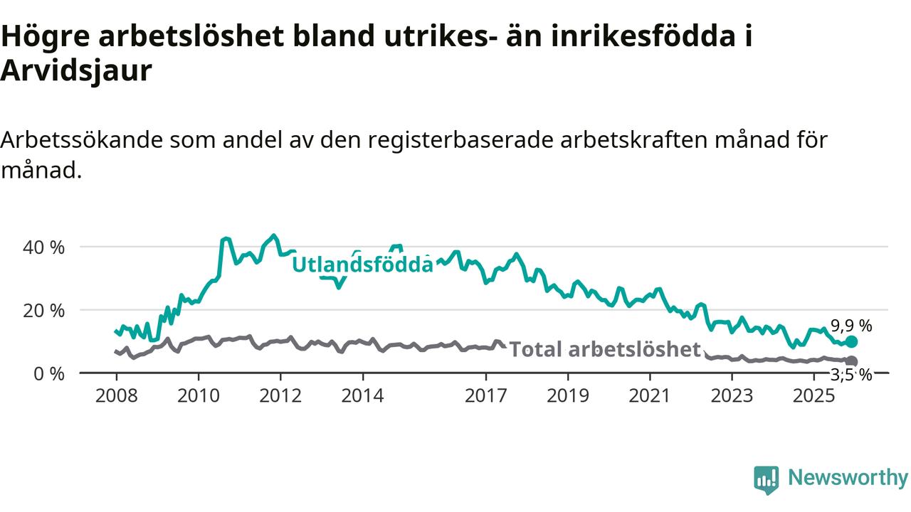 Skillnaden i arbetslöshet mellan utrikesfödda och hela befolkningen är 6,4 procentenheter i Arvidsjaur. Det är en betydligt mindre skillnad än för ett år sedan (−3,2 procentenheter).