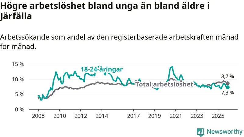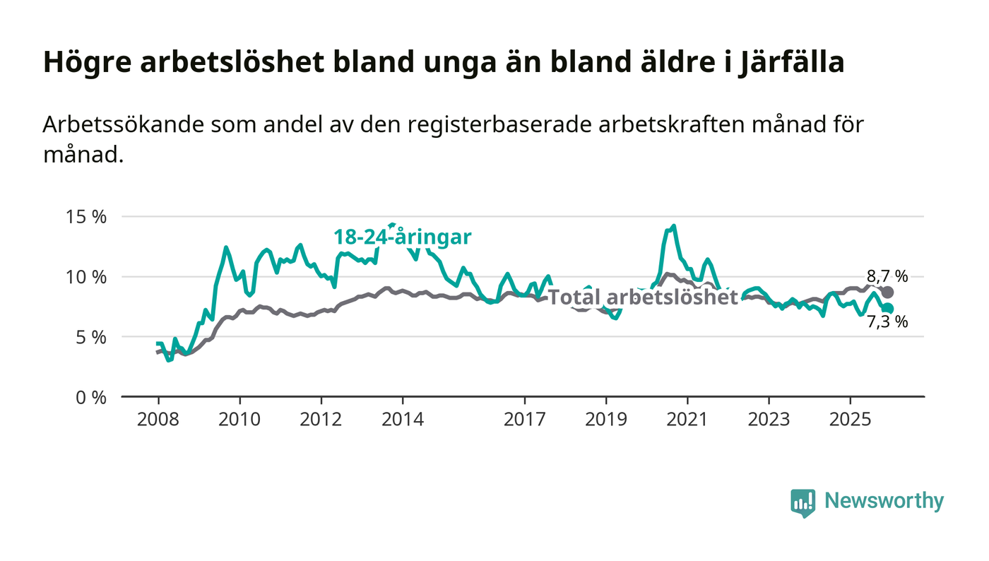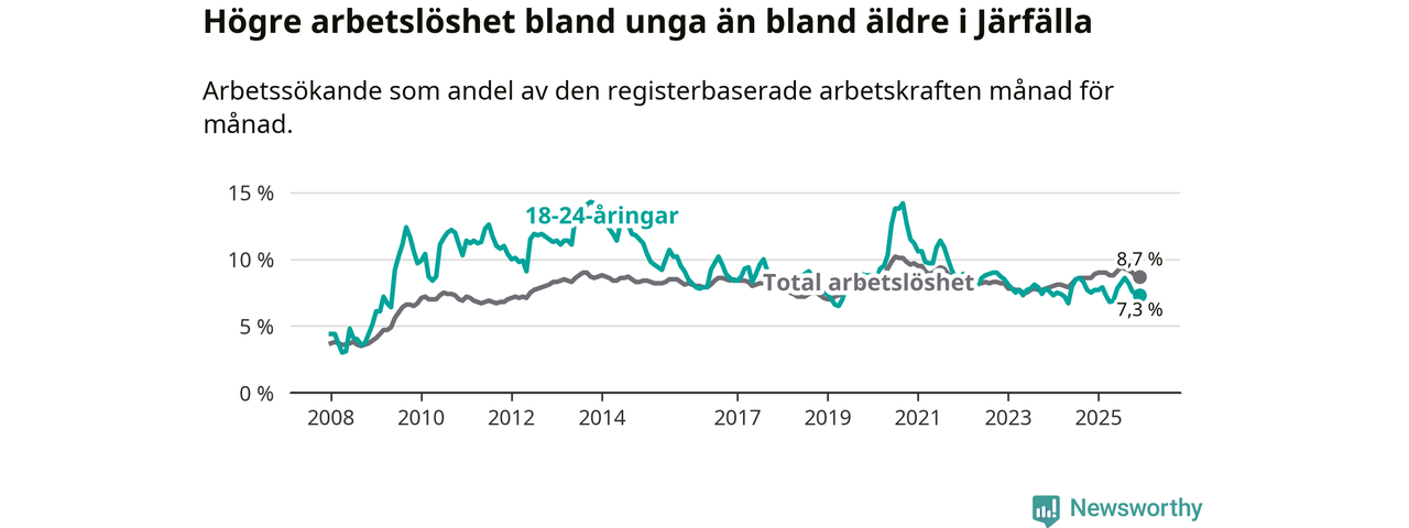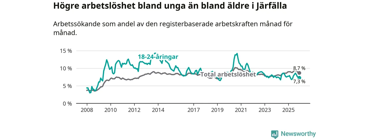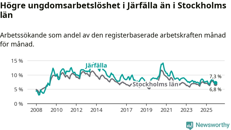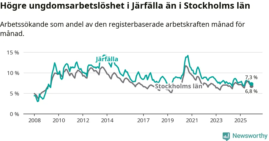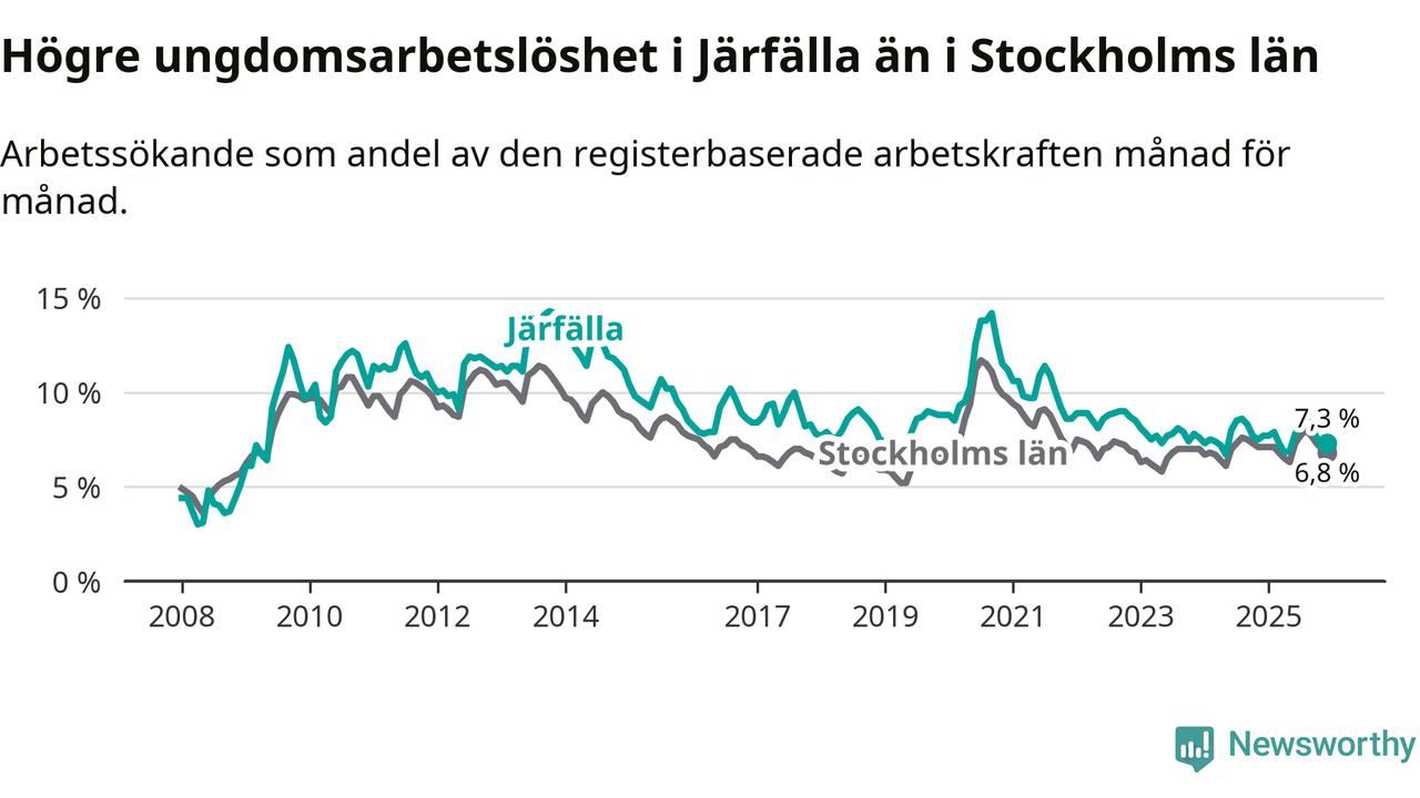 Precis som den totala arbetslösheten ligger ungdomsarbetslösheten i Järfälla högre än i Stockholms län som helhet. Skillnaden mellan kommunen och länet är 0,5 procentenheter.