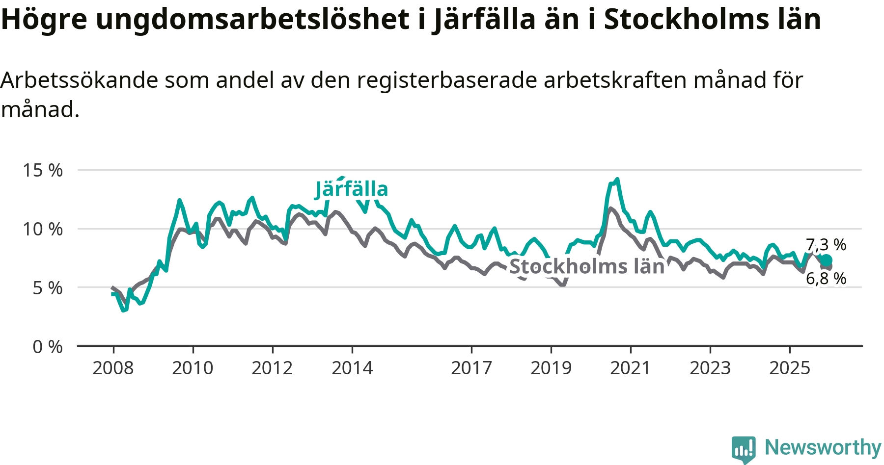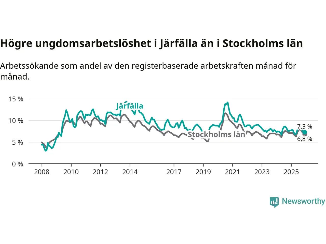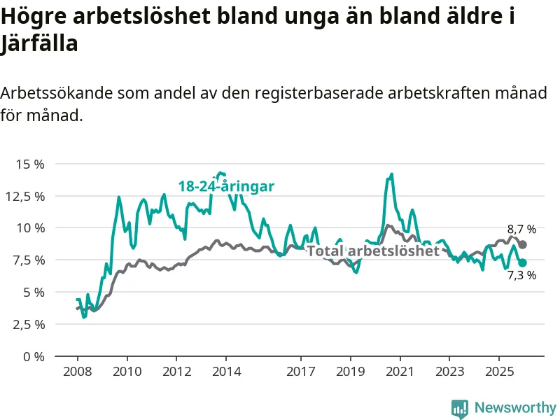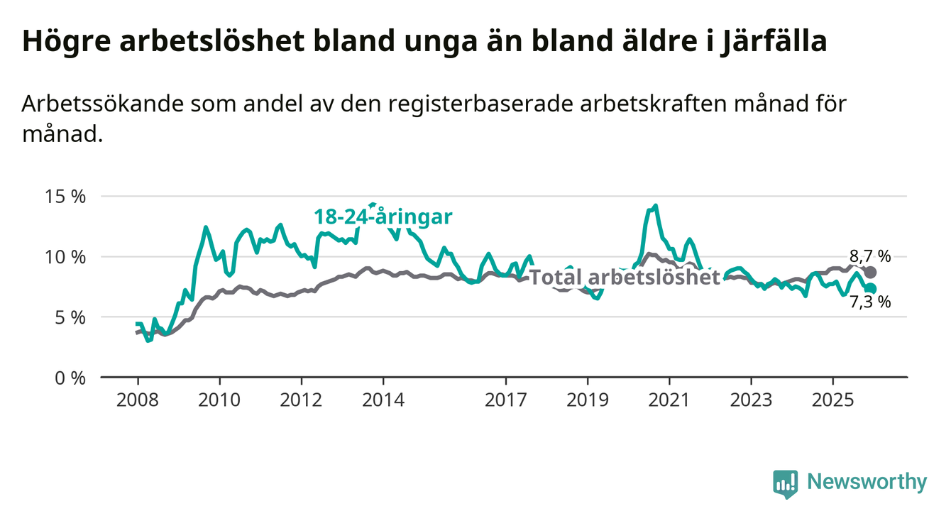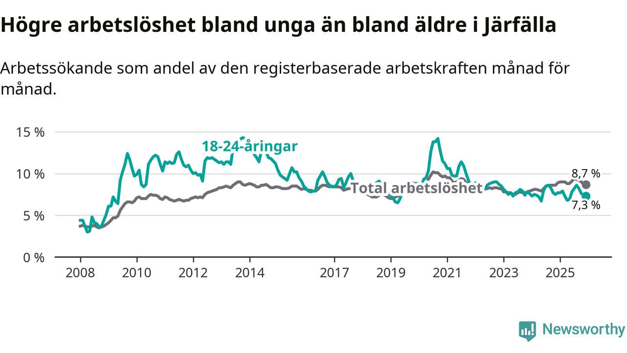 Precis som den totala arbetslösheten ligger ungdomsarbetslösheten i Järfälla högre än i Stockholms län som helhet. Skillnaden mellan kommunen och länet är 0,5 procentenheter.