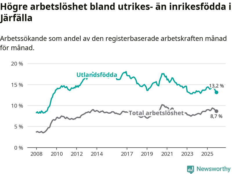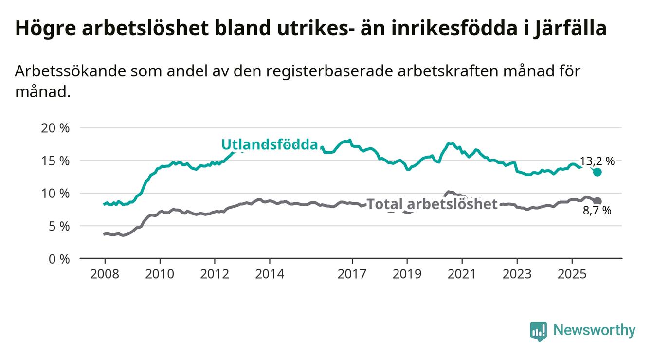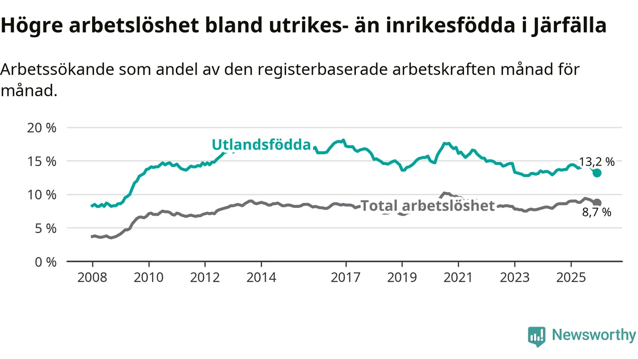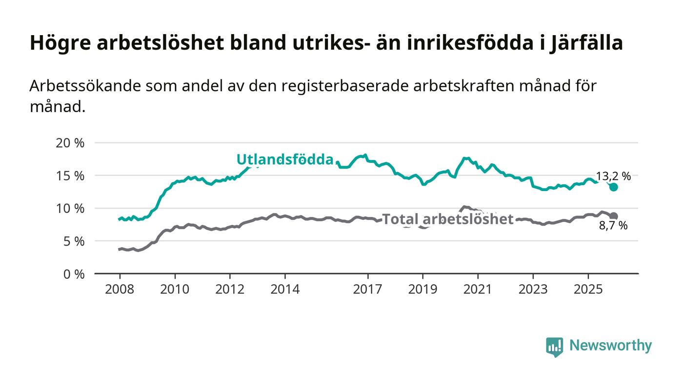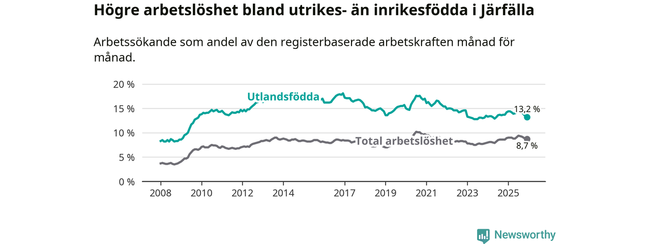 Arbetslösheten bland utlandsfödda var 13,2 procent i Järfälla under december månad, motsvarande 2 822 av 21 379 personer. Det är 1,0 procentenheter färre än vid samma tidpunkt i fjol (−51 om man räknar personer).