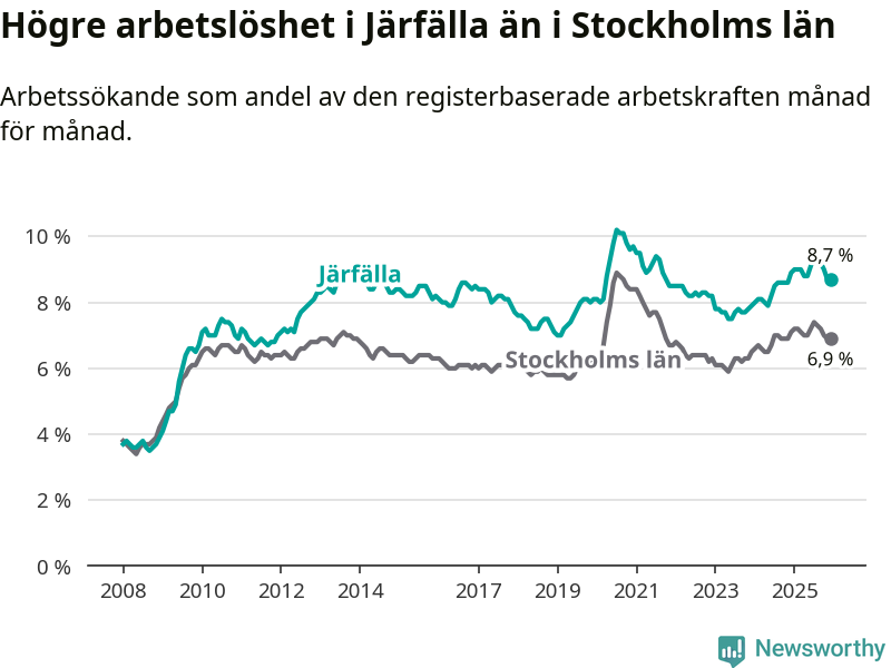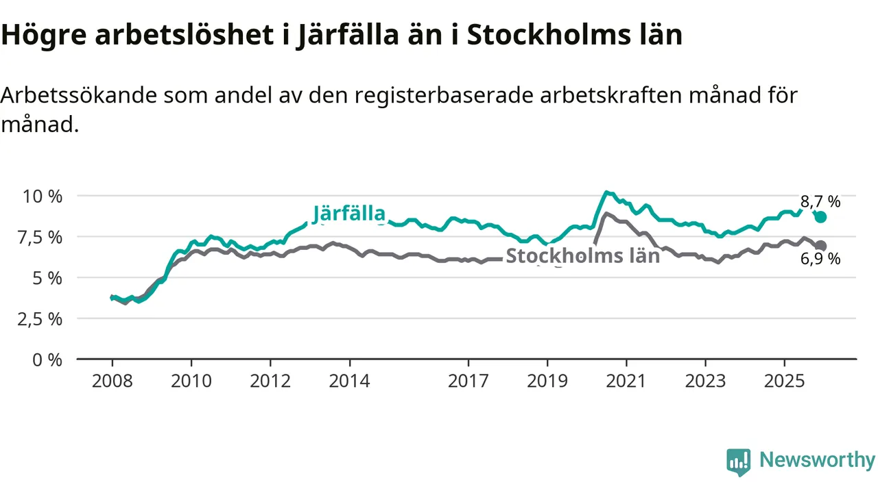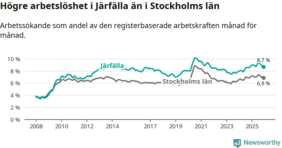 Under december månad rapporterade Järfälla kommun en total arbetslöshet på 8,7 procent. Det är en minskning jämfört med samma tidpunkt i fjol (−0,2 procentenheter). Även i Stockholms län sjunker arbetslösheten något.