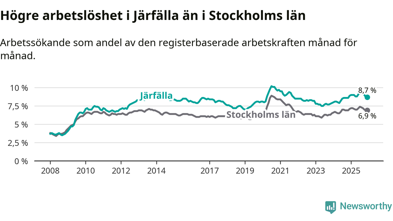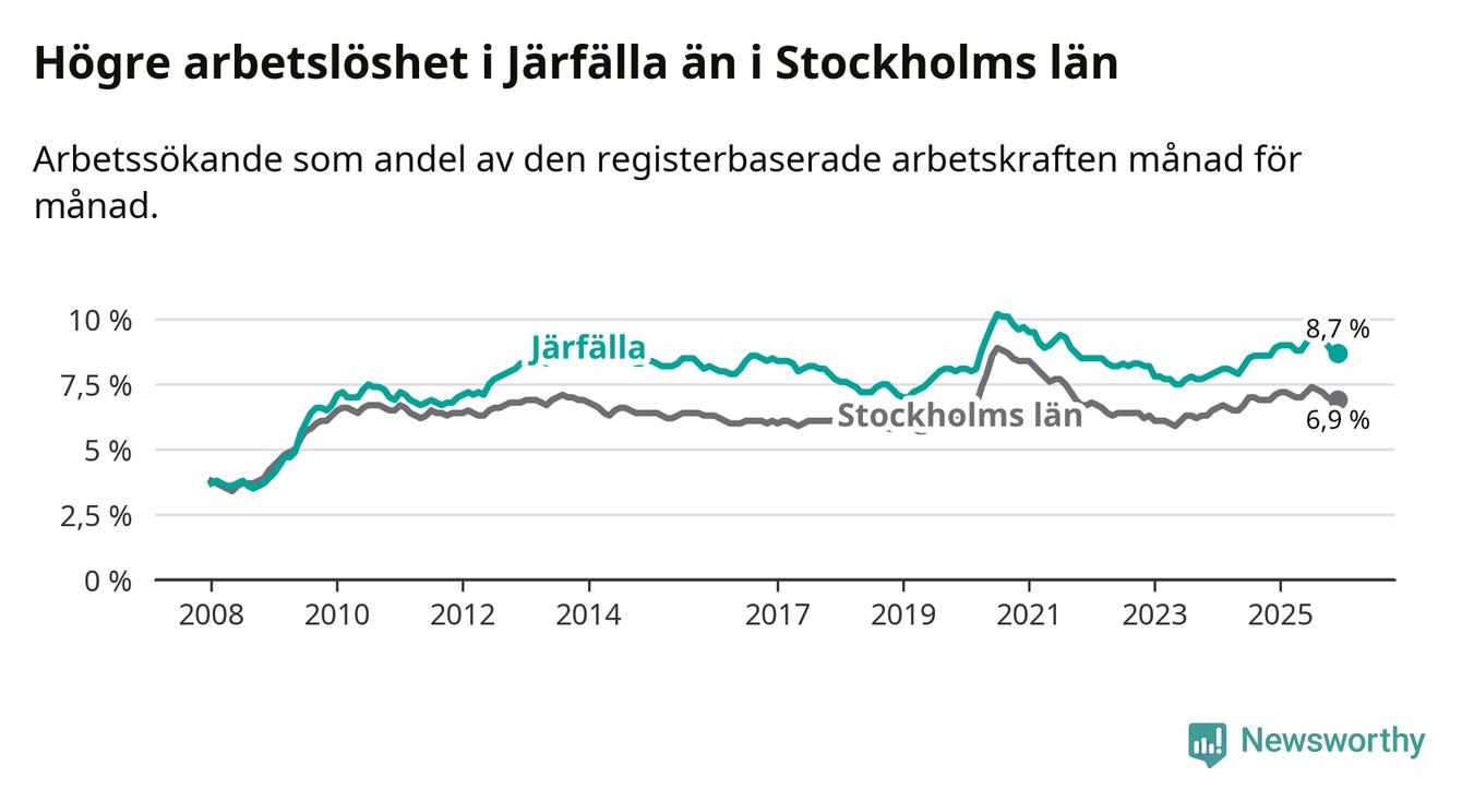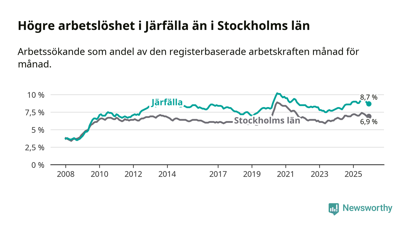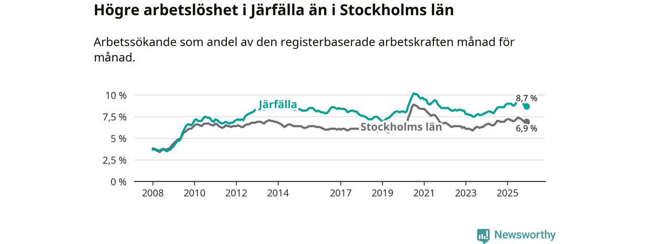 Även om arbetslösheten i Järfälla alltså minskar, så ligger den fortfarande över snittet i hela Stockholms län (8,7 procent i kommunen, jämfört med 6,9 procent i hela länet). Ekerö har den lägsta arbetslösheten i länet (3,8 procent), medan Södertälje har den högsta (11,0 procent). För att Järfälla skulle komma ner i samma arbetslöshetsnivå som Ekerö skulle 2 286 personer behöva sysselsättas.
