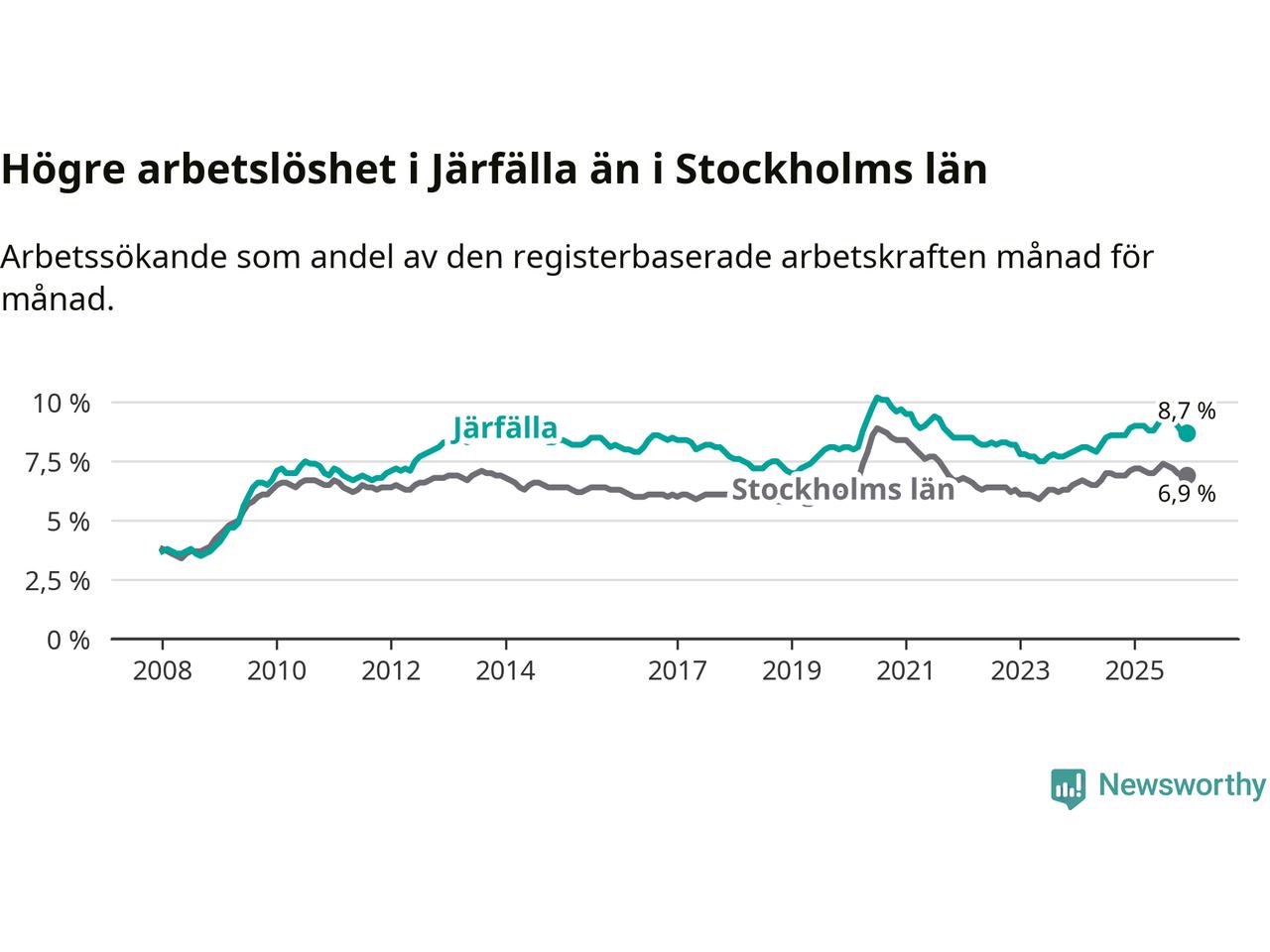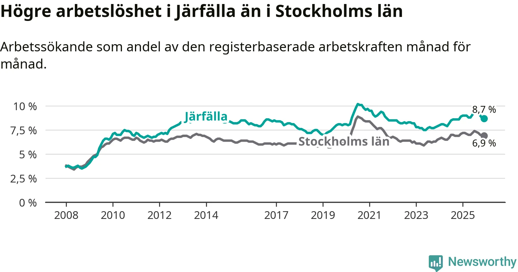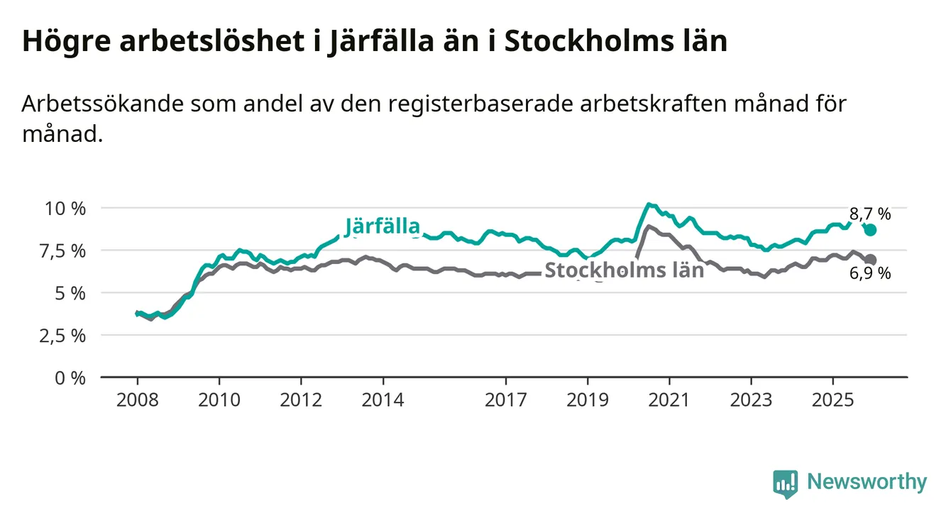 Även om arbetslösheten i Järfälla alltså minskar, så ligger den fortfarande över snittet i hela Stockholms län (8,7 procent i kommunen, jämfört med 6,9 procent i hela länet). Ekerö har den lägsta arbetslösheten i länet (3,8 procent), medan Södertälje har den högsta (11,0 procent). För att Järfälla skulle komma ner i samma arbetslöshetsnivå som Ekerö skulle 2 286 personer behöva sysselsättas.