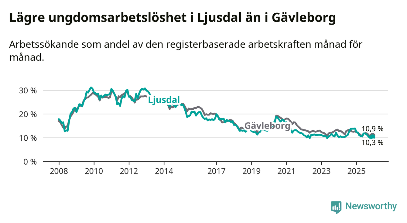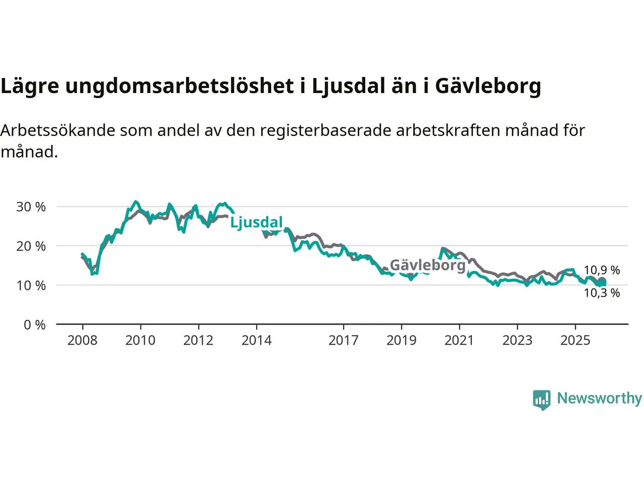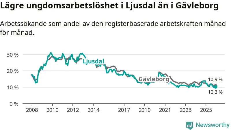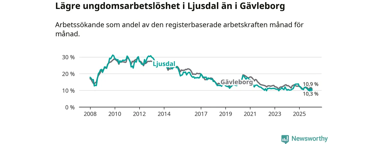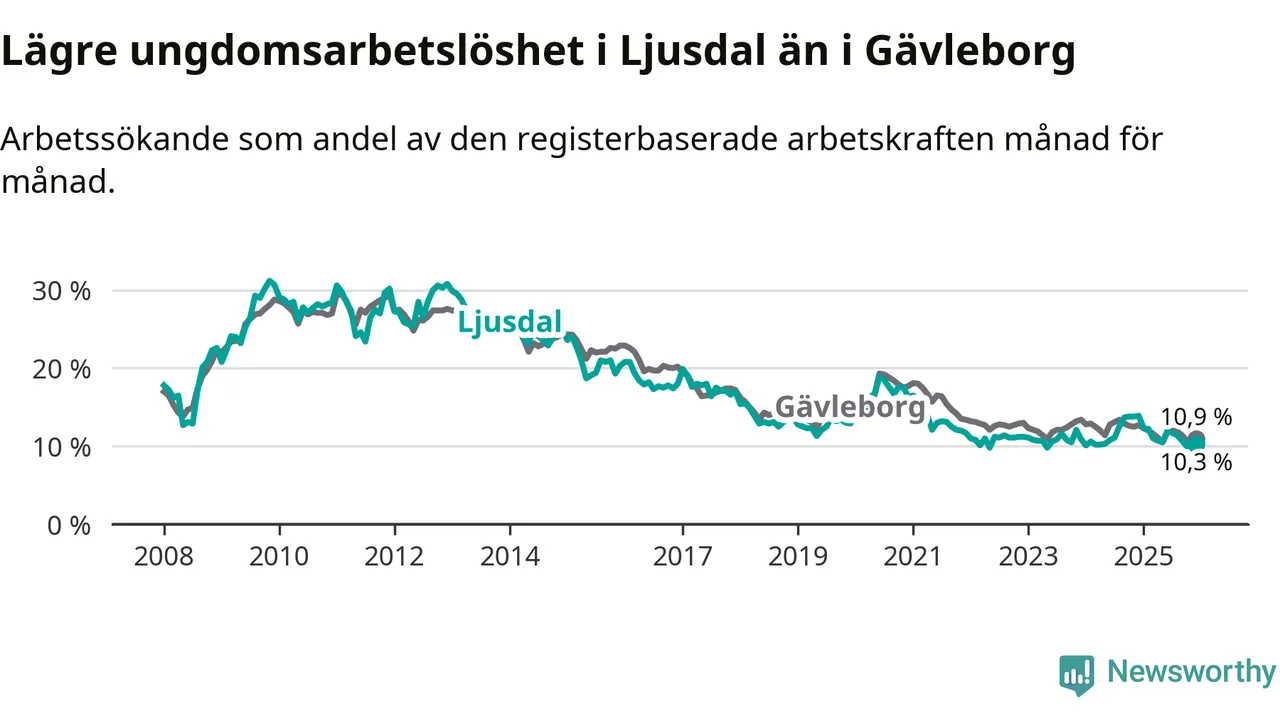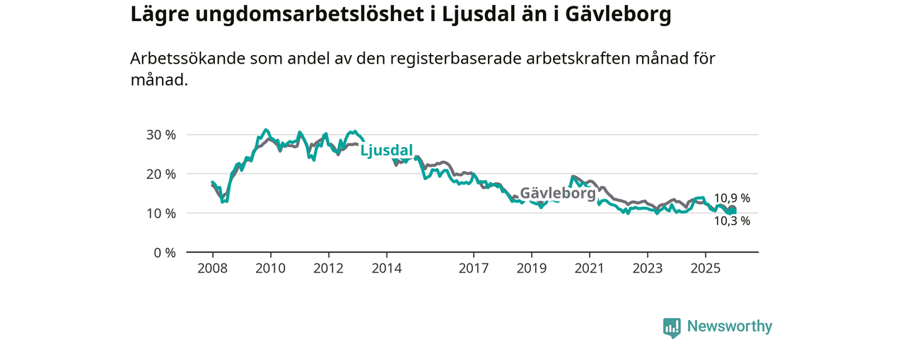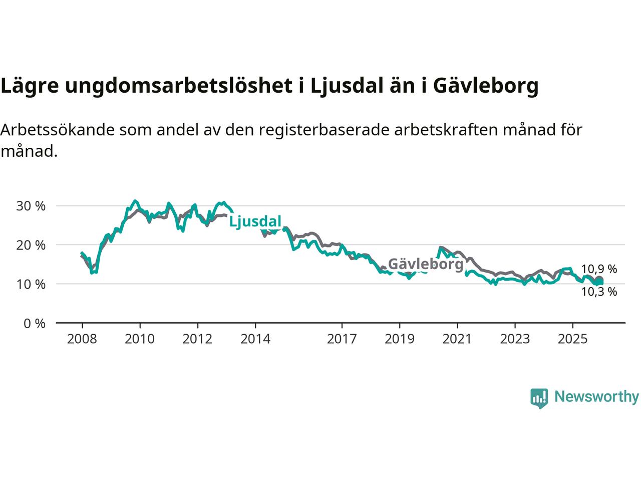 Precis som den totala arbetslösheten ligger ungdomsarbetslösheten i Ljusdal lägre än i Gävleborg som helhet. Skillnaden mellan kommunen och länet är 0,6 procentenheter.