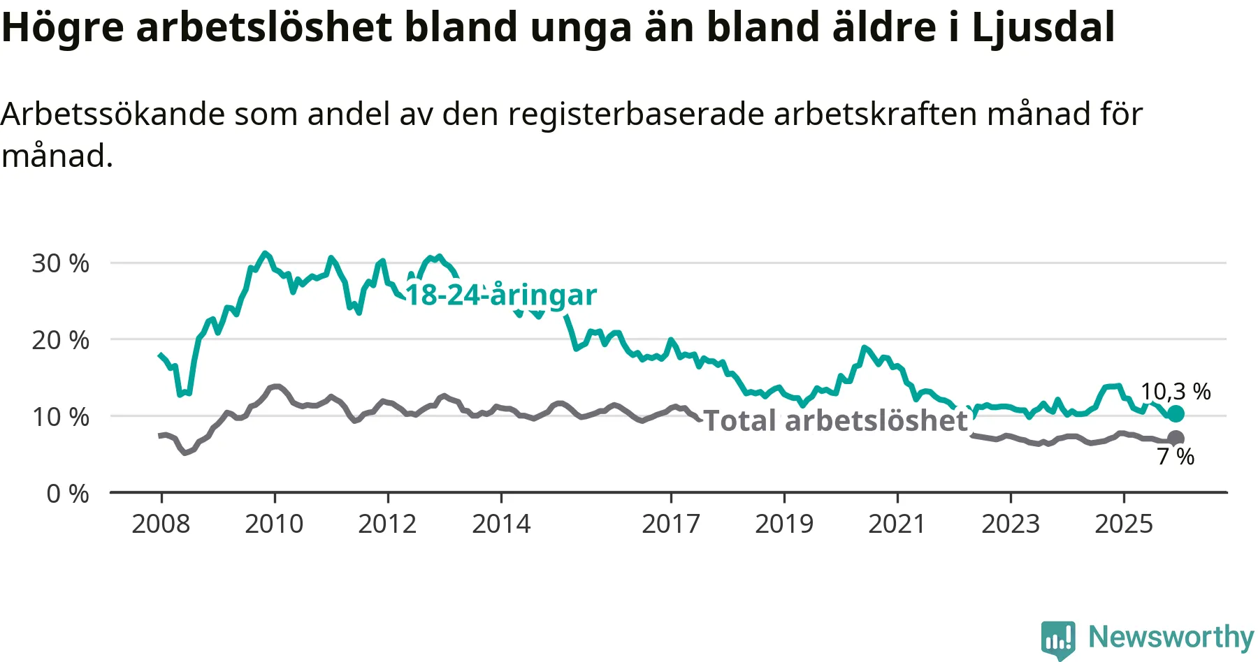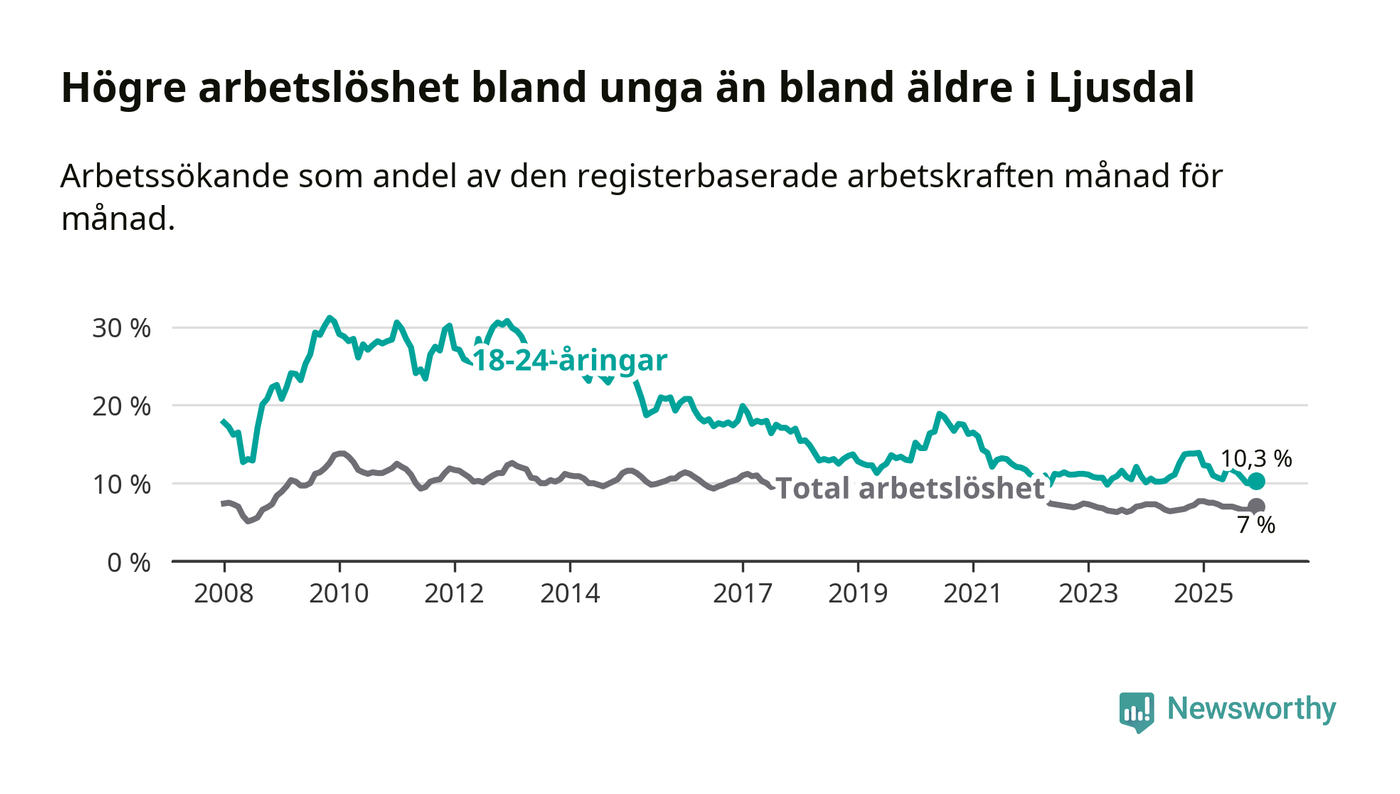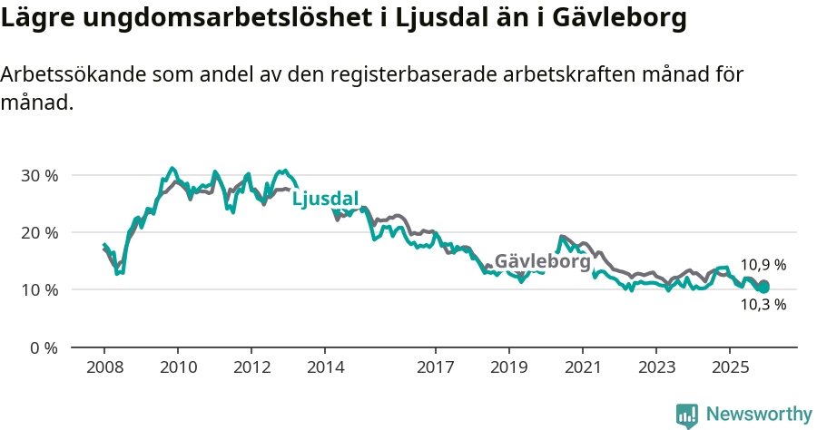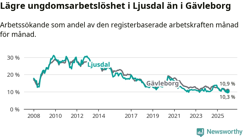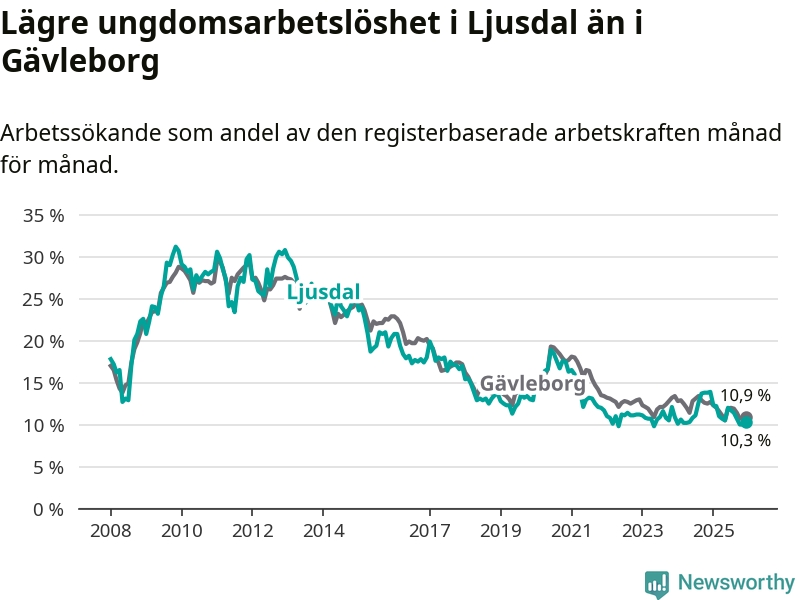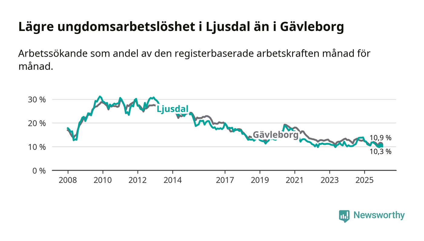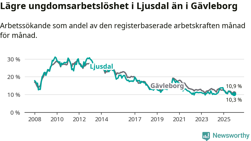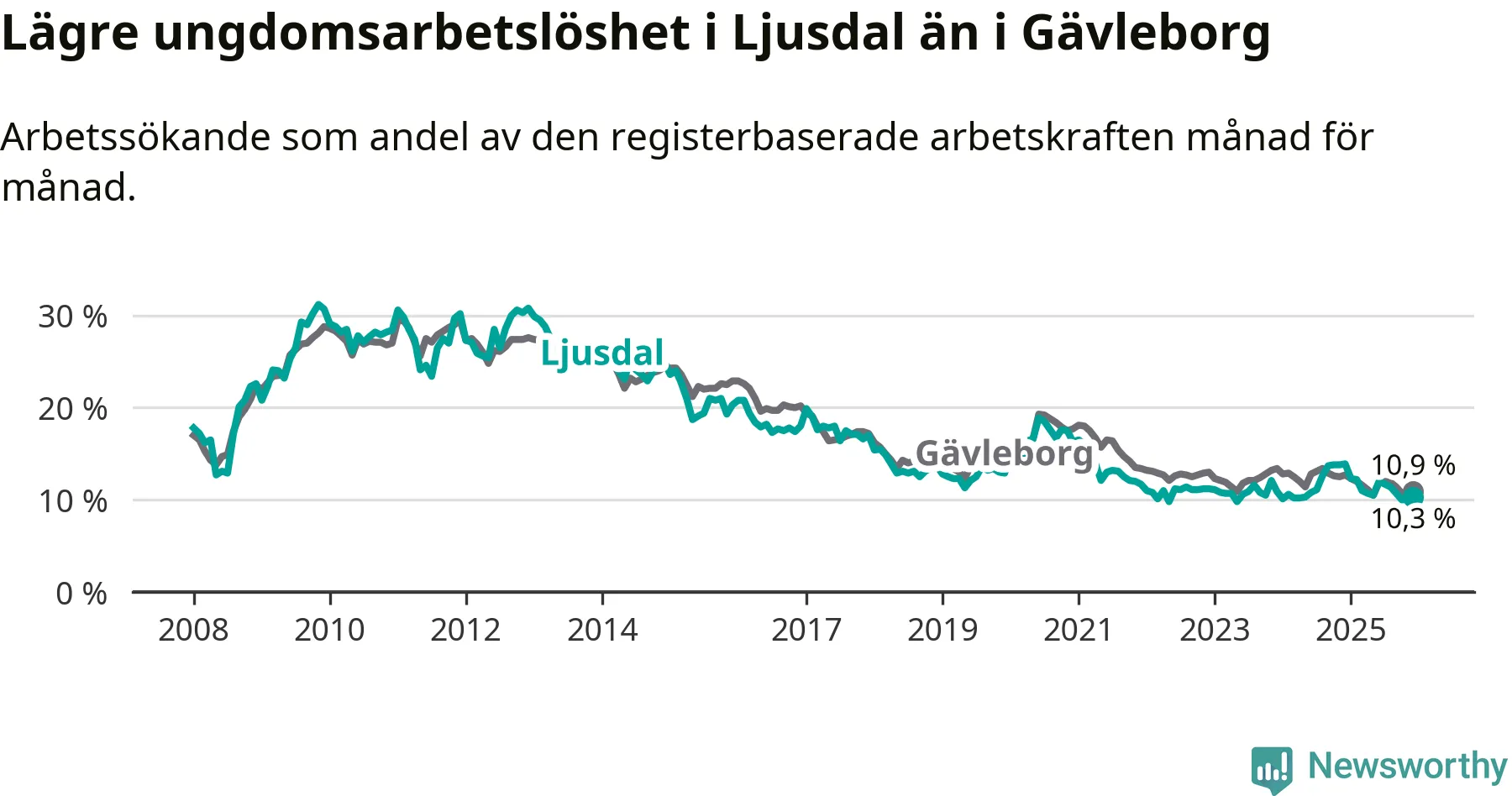 Precis som den totala arbetslösheten ligger ungdomsarbetslösheten i Ljusdal lägre än i Gävleborg som helhet. Skillnaden mellan kommunen och länet är 0,6 procentenheter.