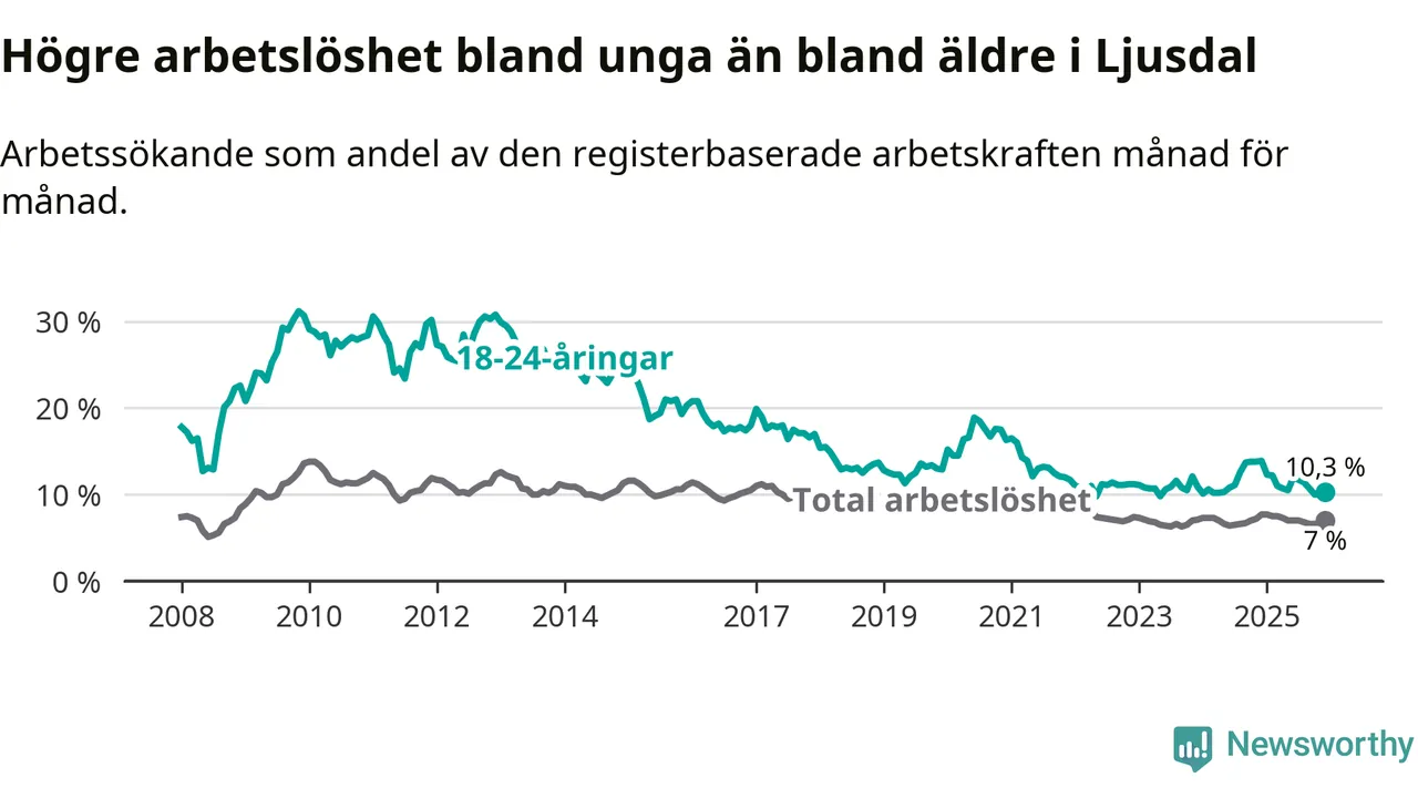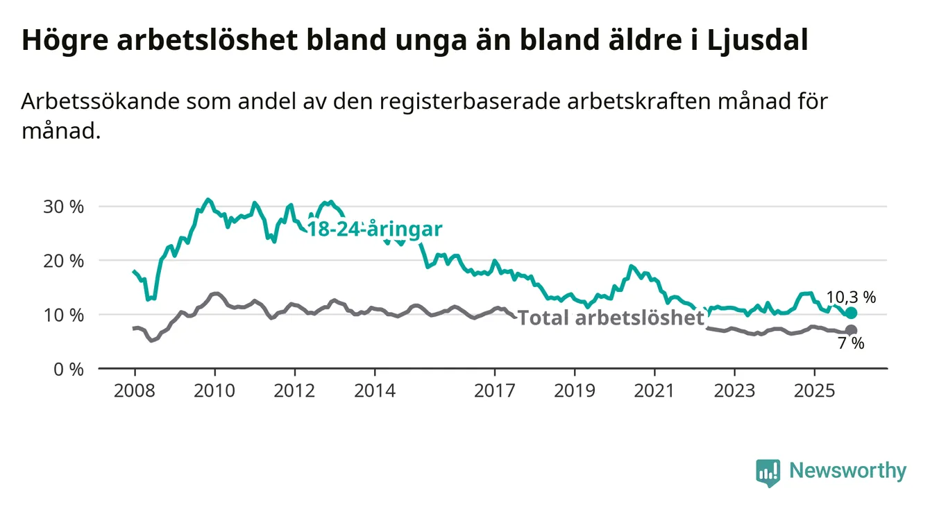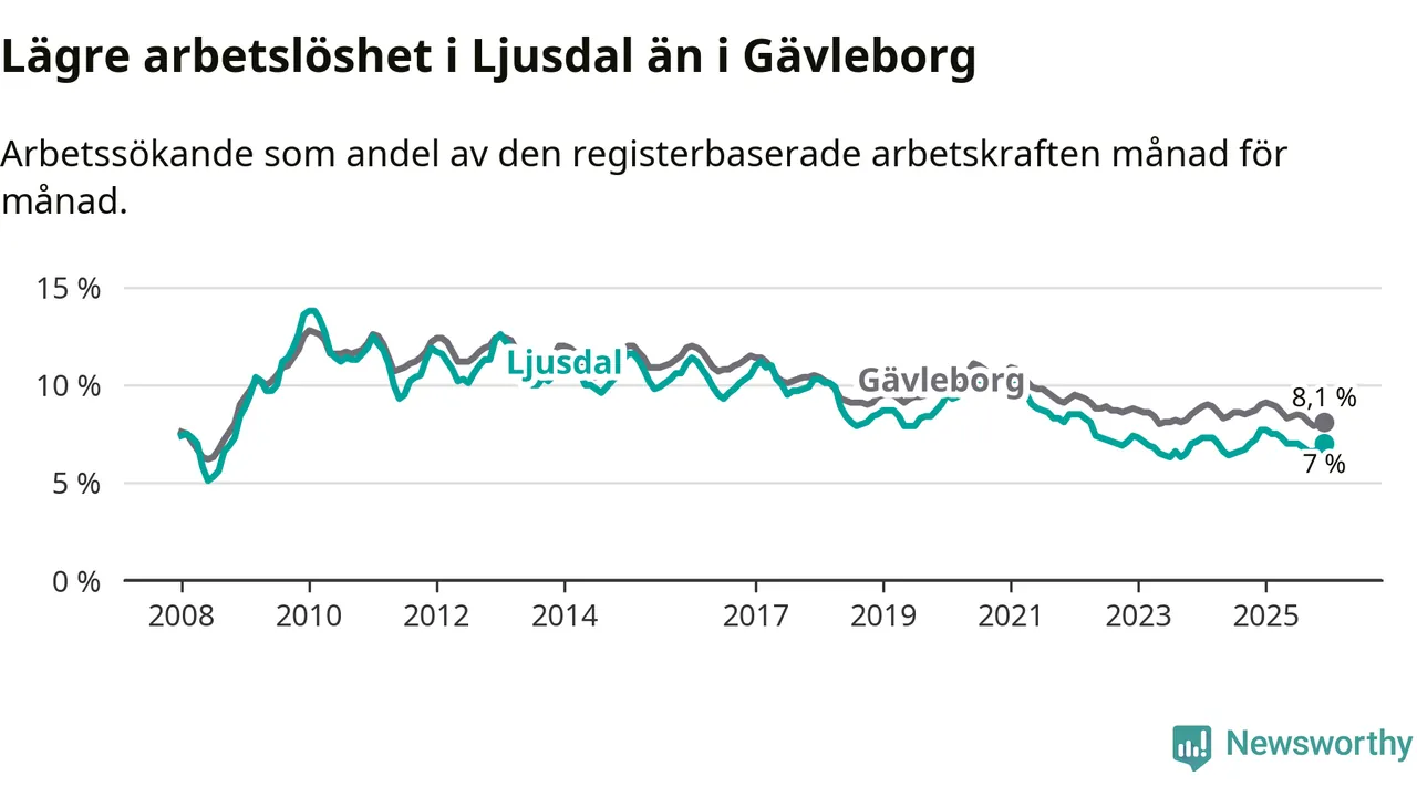 Under december månad rapporterade Ljusdals kommun en total arbetslöshet på 7,0 procent. Det är en minskning jämfört med samma tidpunkt i fjol (−0,7 procentenheter). Även i Gävleborgs län sjunker arbetslösheten .
