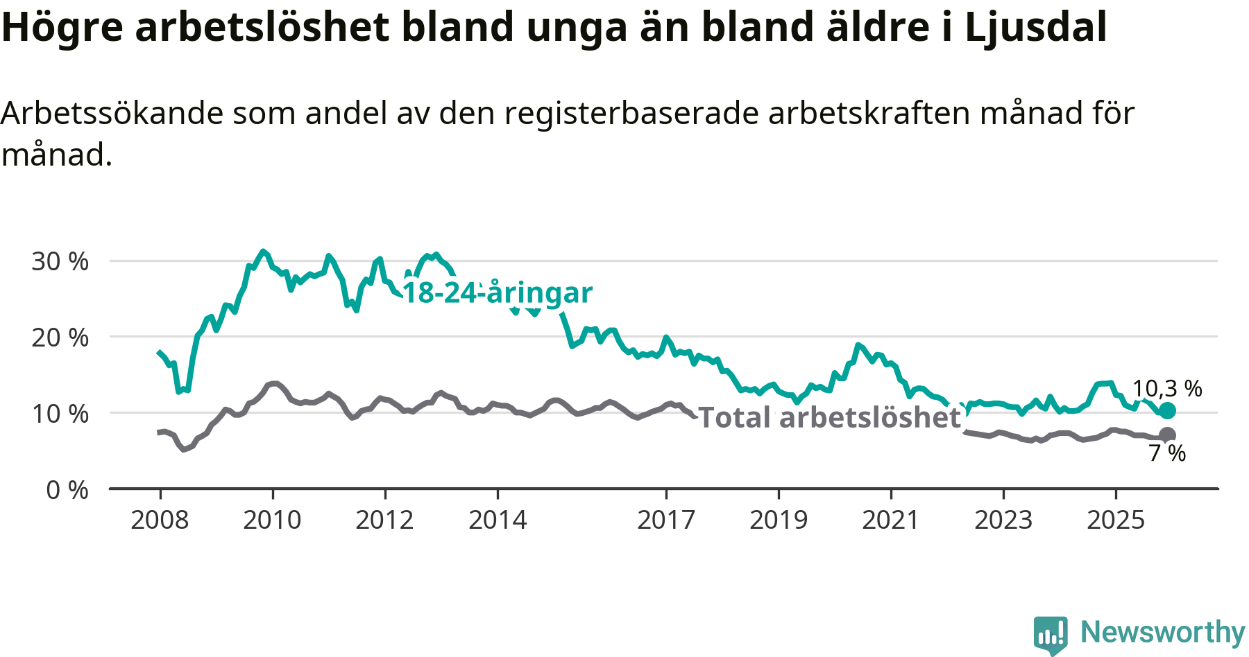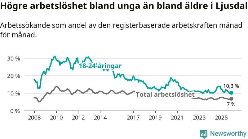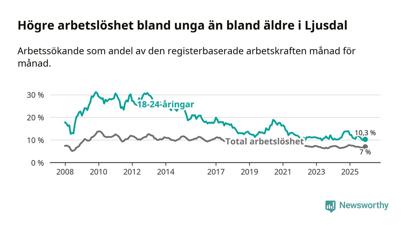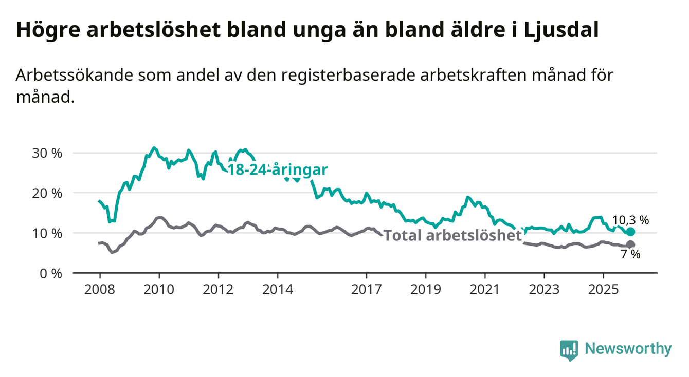 Under december månad rapporterade Ljusdals kommun en total arbetslöshet på 7,0 procent. Det är en minskning jämfört med samma tidpunkt i fjol (−0,7 procentenheter). Även i Gävleborgs län sjunker arbetslösheten .