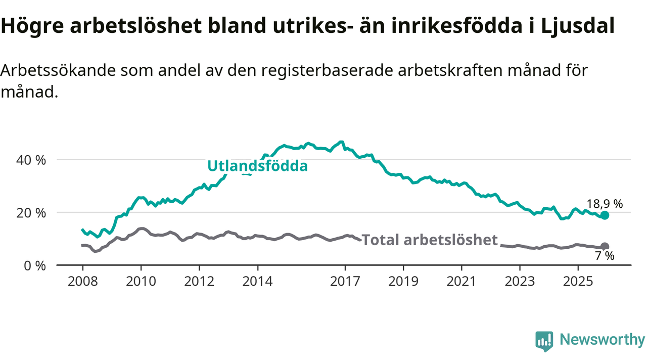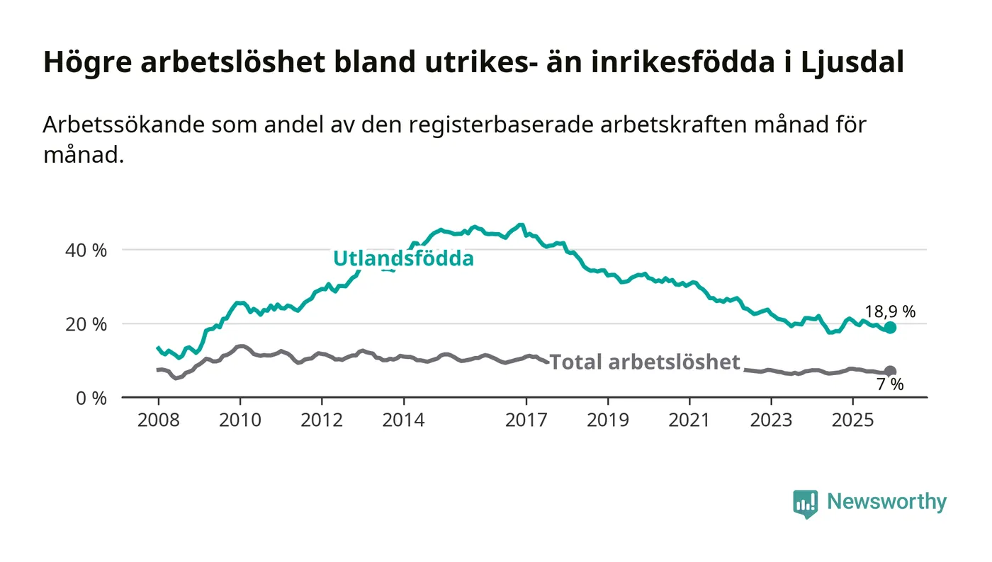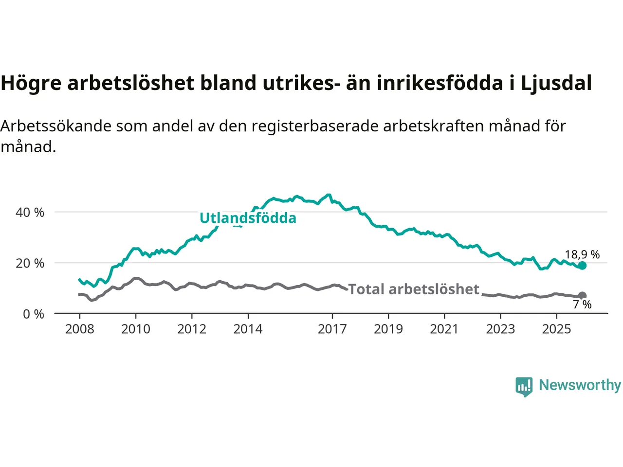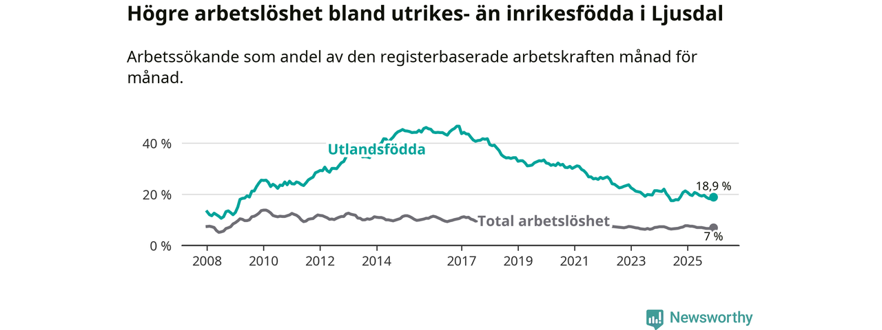 Skillnaden i arbetslöshet mellan utrikesfödda och hela befolkningen är 11,9 procentenheter i Ljusdal. Det är en betydligt mindre skillnad än för ett år sedan (−1,7 procentenheter).