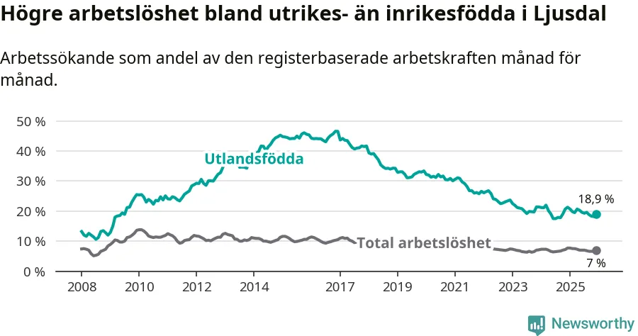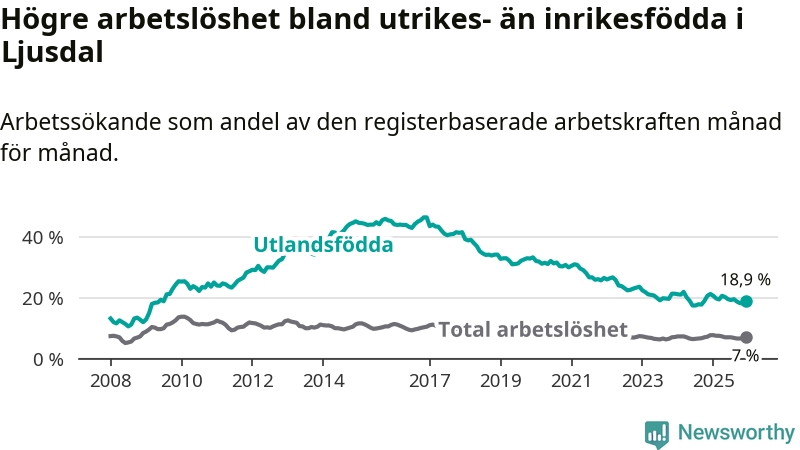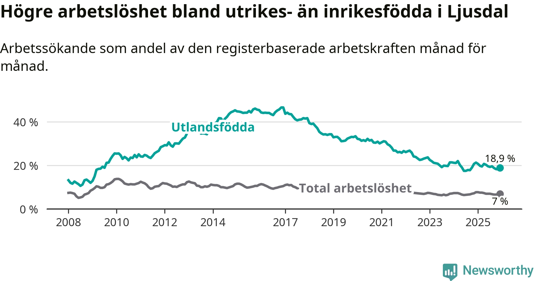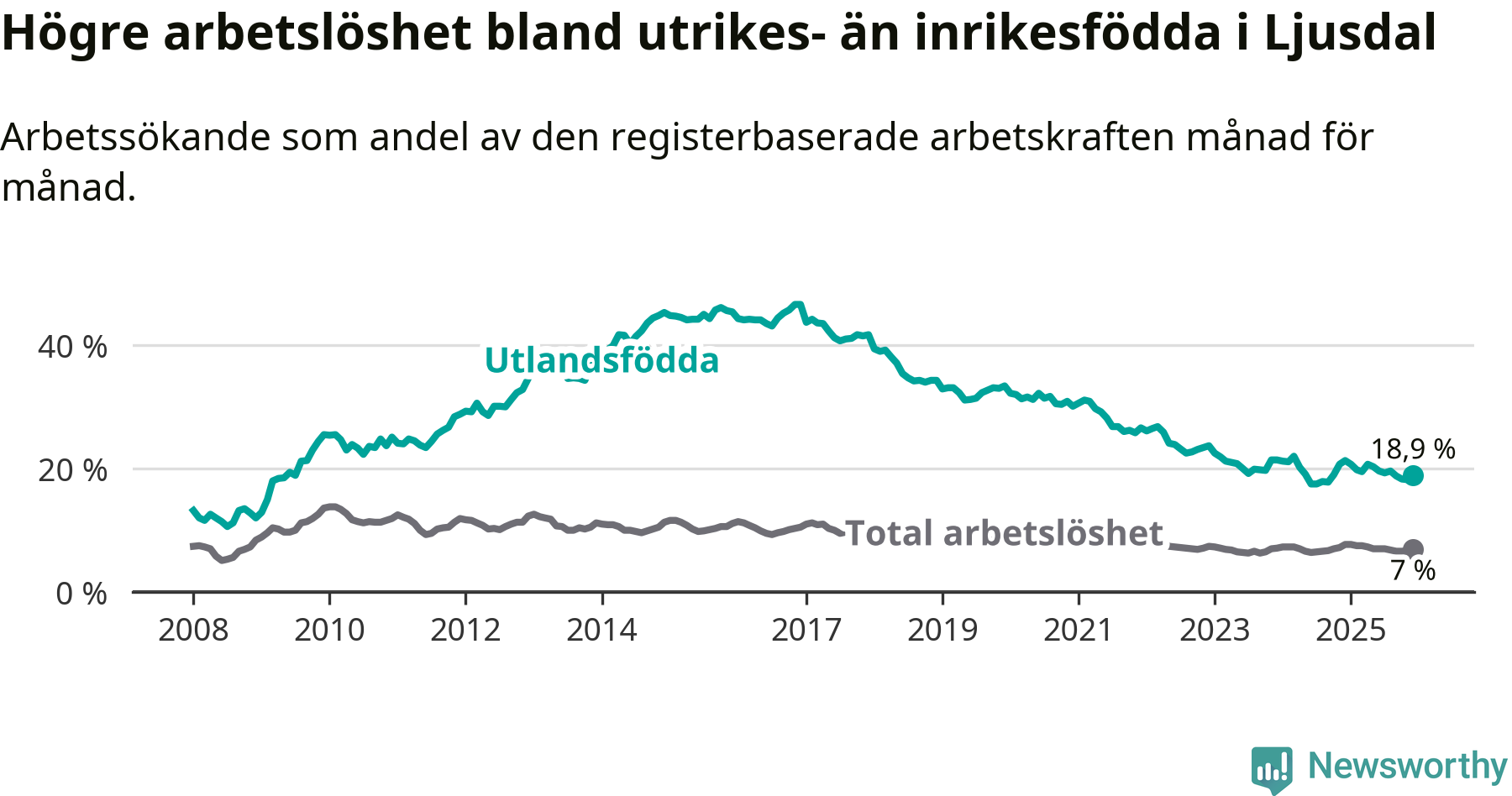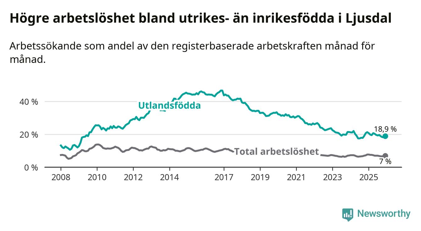 Skillnaden i arbetslöshet mellan utrikesfödda och hela befolkningen är 11,9 procentenheter i Ljusdal. Det är en betydligt mindre skillnad än för ett år sedan (−1,7 procentenheter).