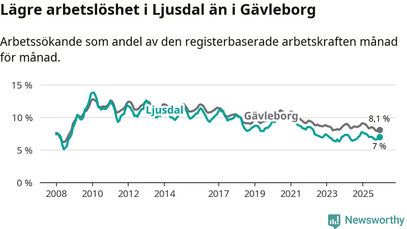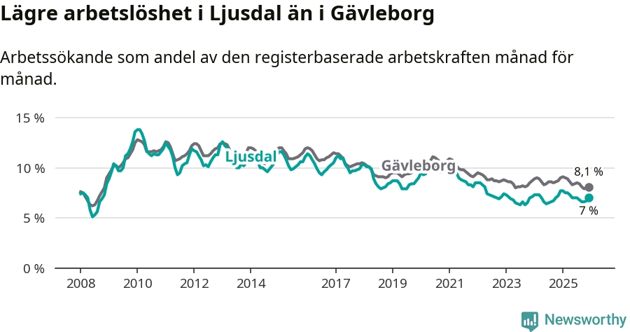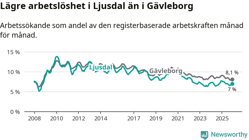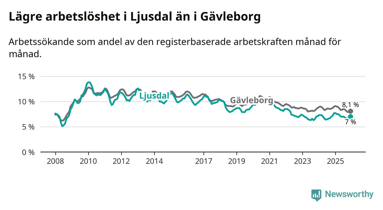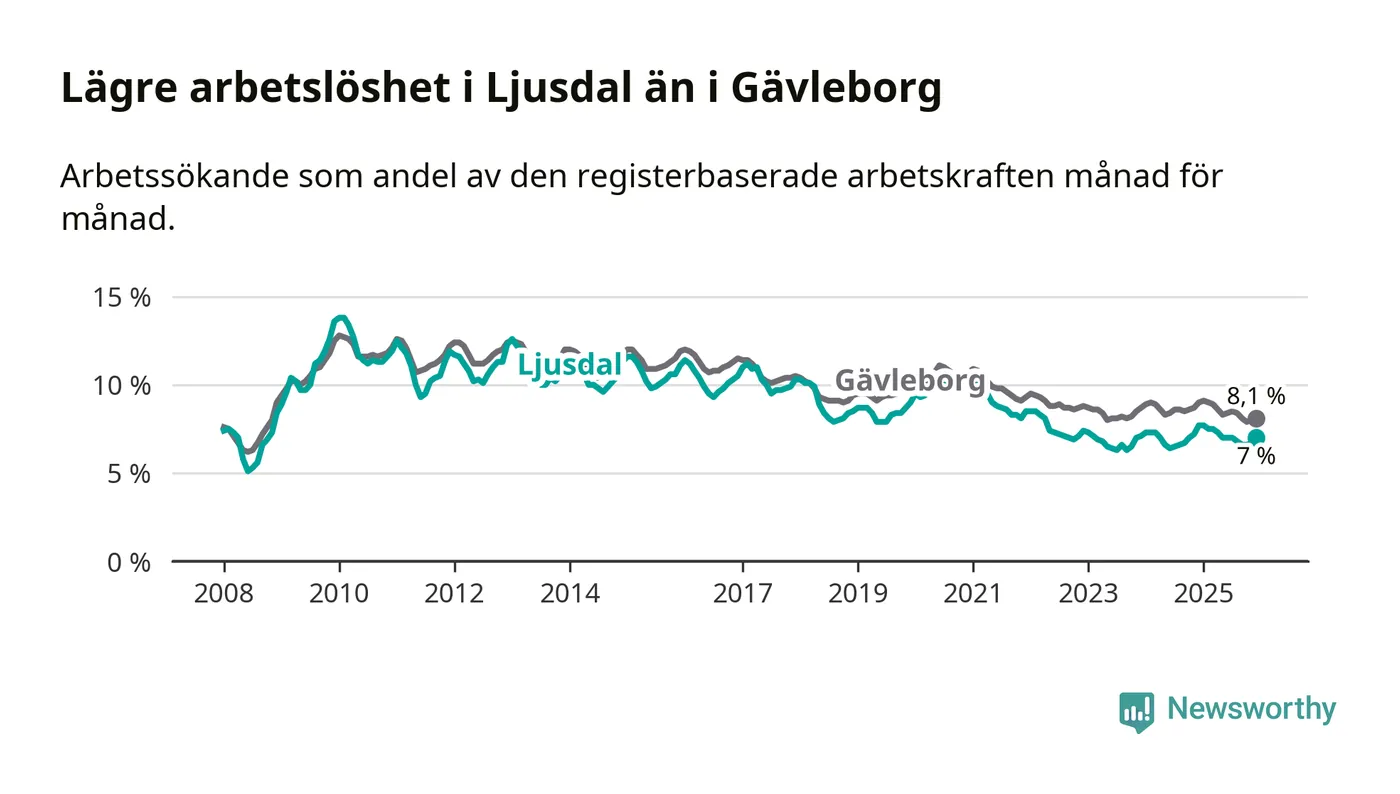 Ljusdal hade redan tidigare lägre arbetslöshet än snittet i hela Gävleborgs län och nu växer klyftan (7,0 procent i kommunen, jämfört med 8,1 procent i hela länet). Hudiksvall har den lägsta arbetslösheten i länet (6,0 procent), medan Söderhamn har den högsta (9,1 procent). För att Ljusdal skulle komma ner i samma arbetslöshetsnivå som Hudiksvall skulle 85 personer behöva sysselsättas.
