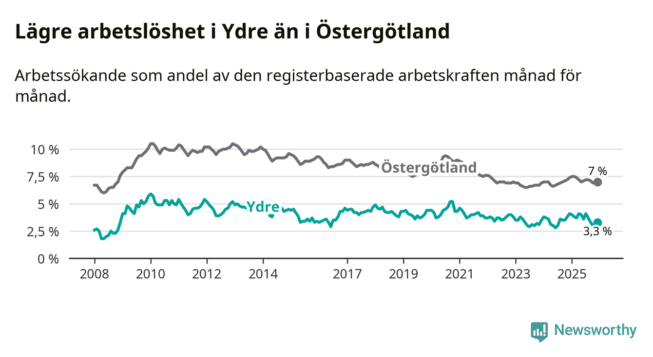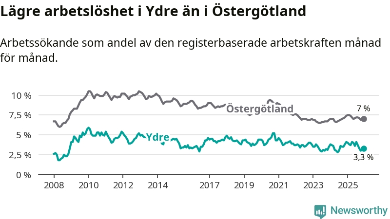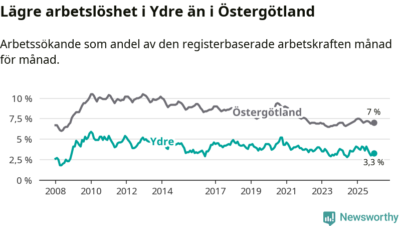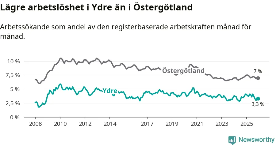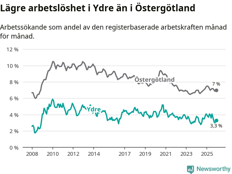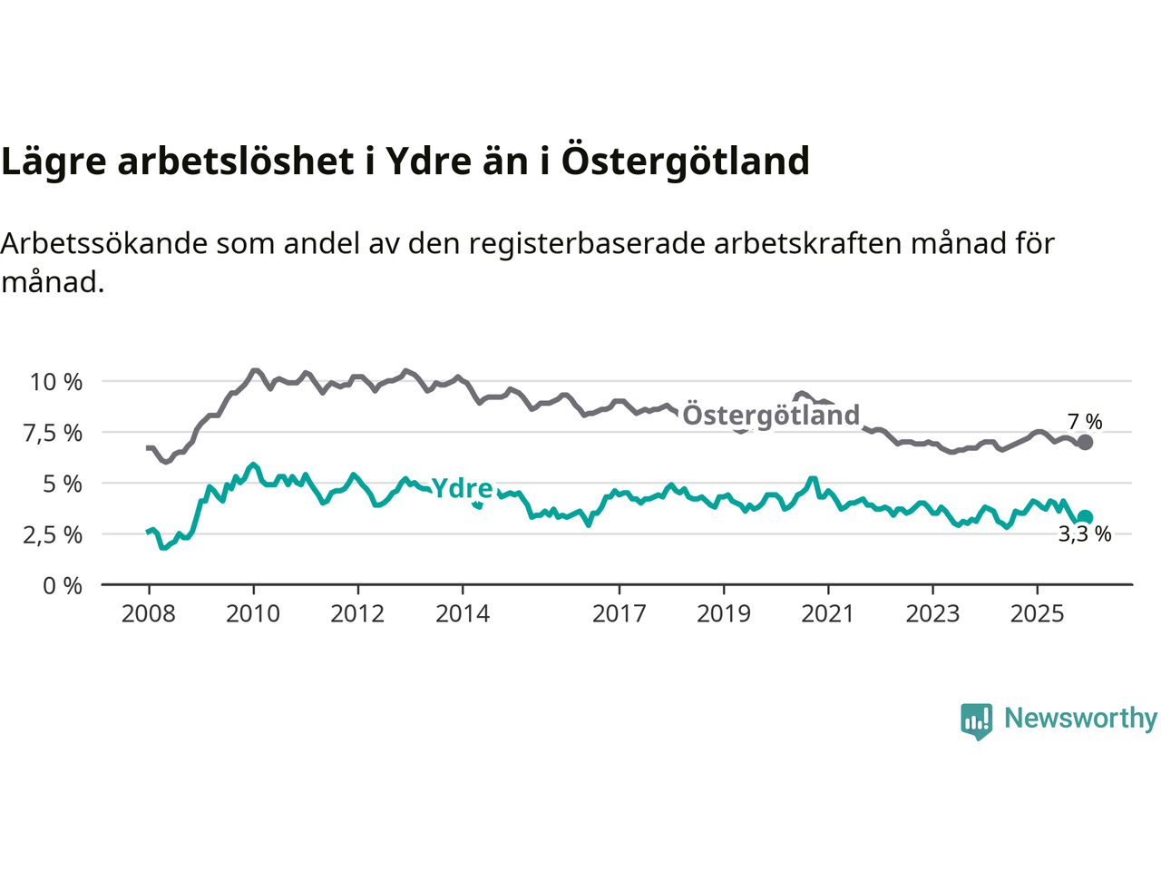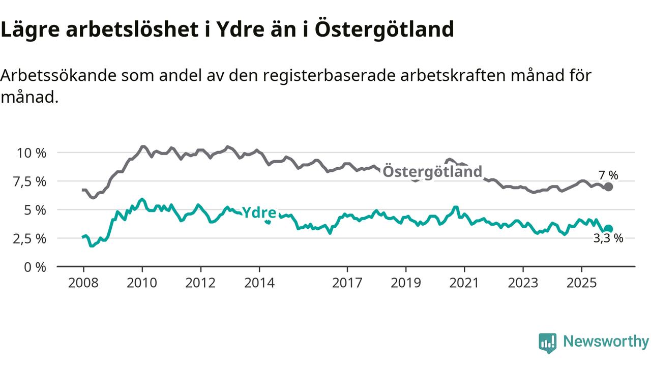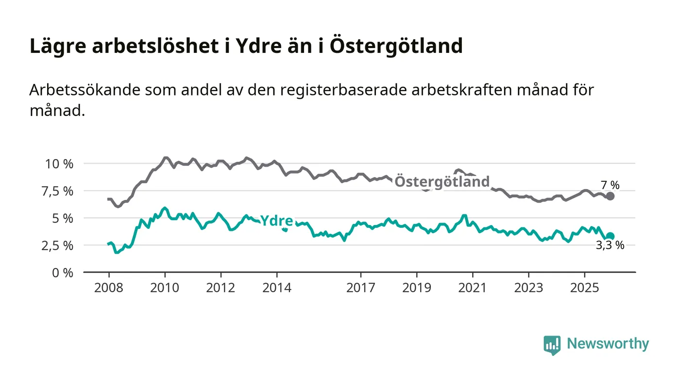 Under december månad rapporterade Ydre kommun en total arbetslöshet på 3,3 procent. Det är en minskning jämfört med samma tidpunkt i fjol (−0,8 procentenheter). Även i Östergötlands län sjunker arbetslösheten .
