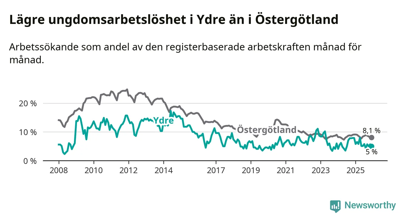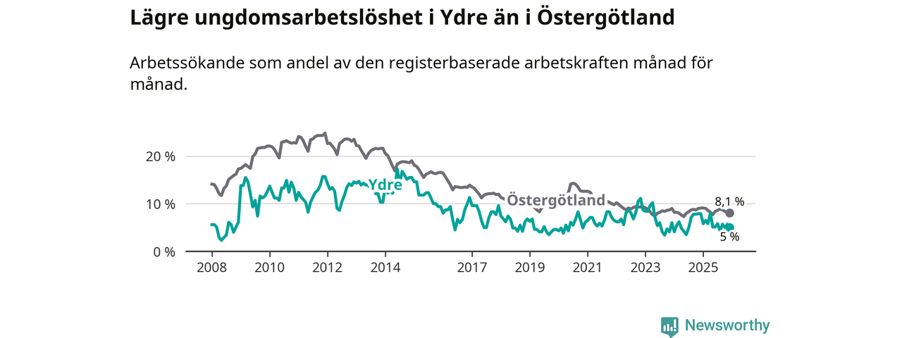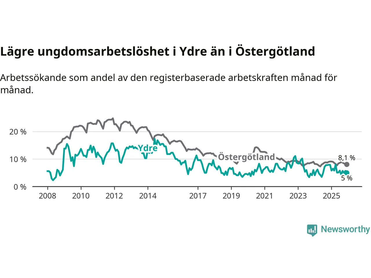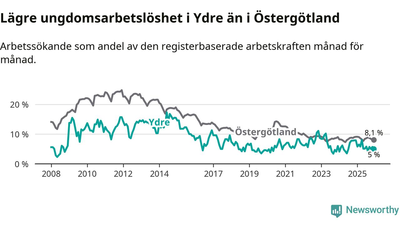 Precis som den totala arbetslösheten ligger ungdomsarbetslösheten i Ydre lägre än i Östergötland som helhet. Skillnaden mellan kommunen och länet är 3,1 procentenheter.