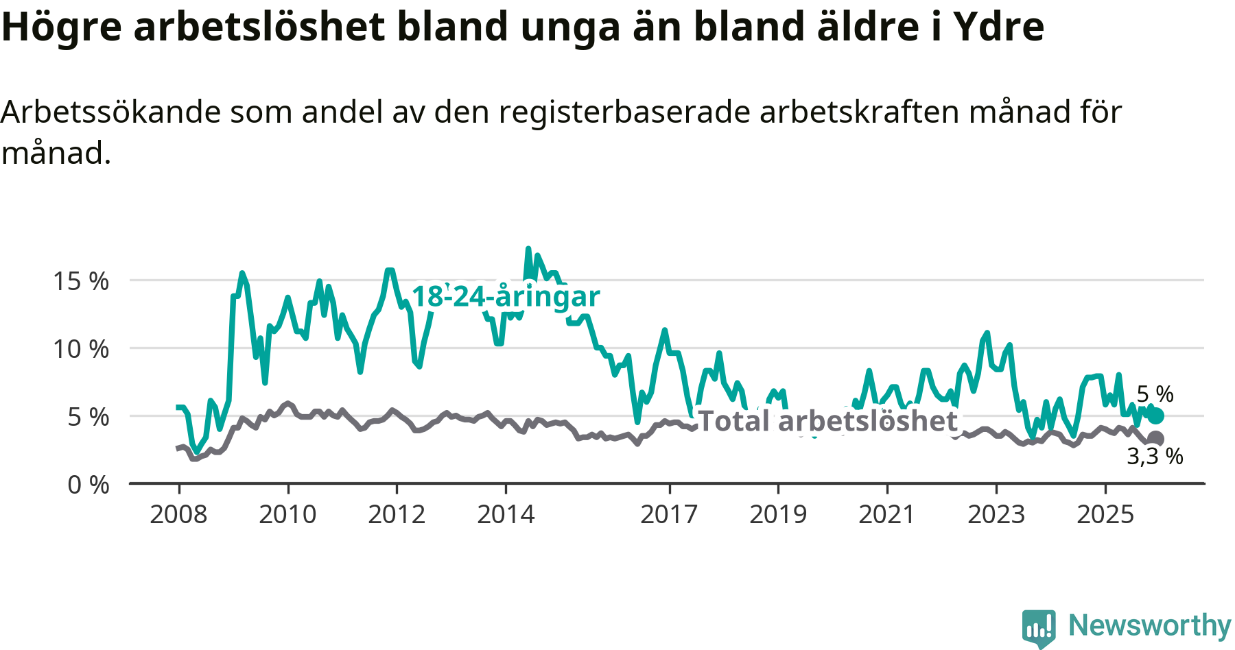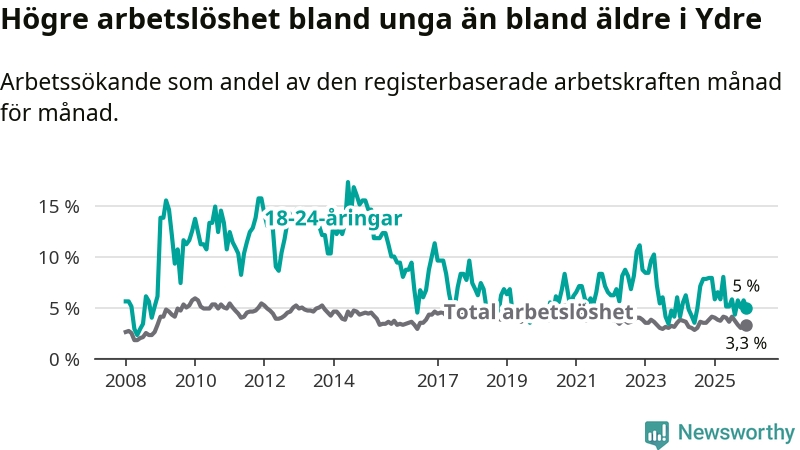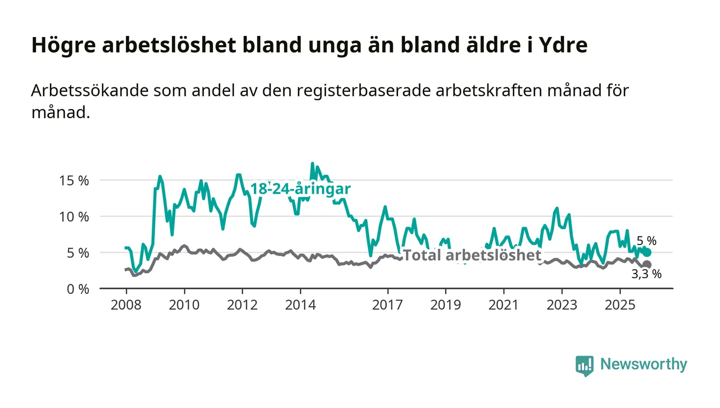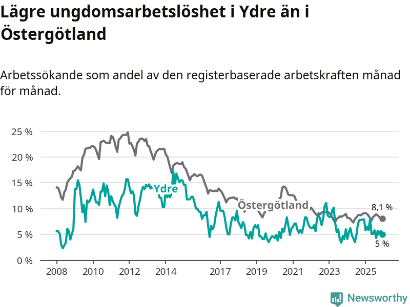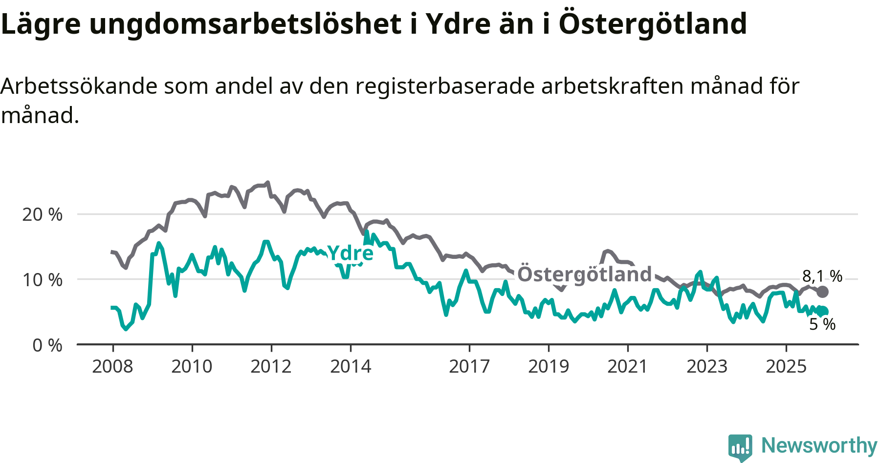 Precis som den totala arbetslösheten ligger ungdomsarbetslösheten i Ydre lägre än i Östergötland som helhet. Skillnaden mellan kommunen och länet är 3,1 procentenheter.