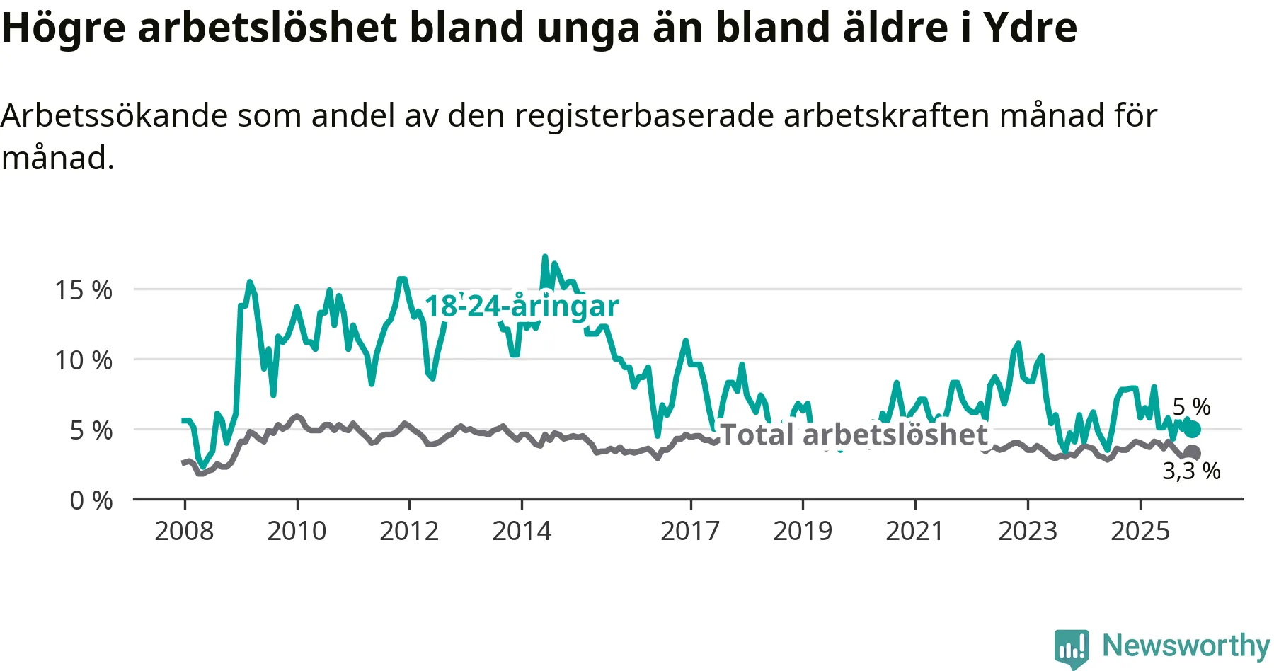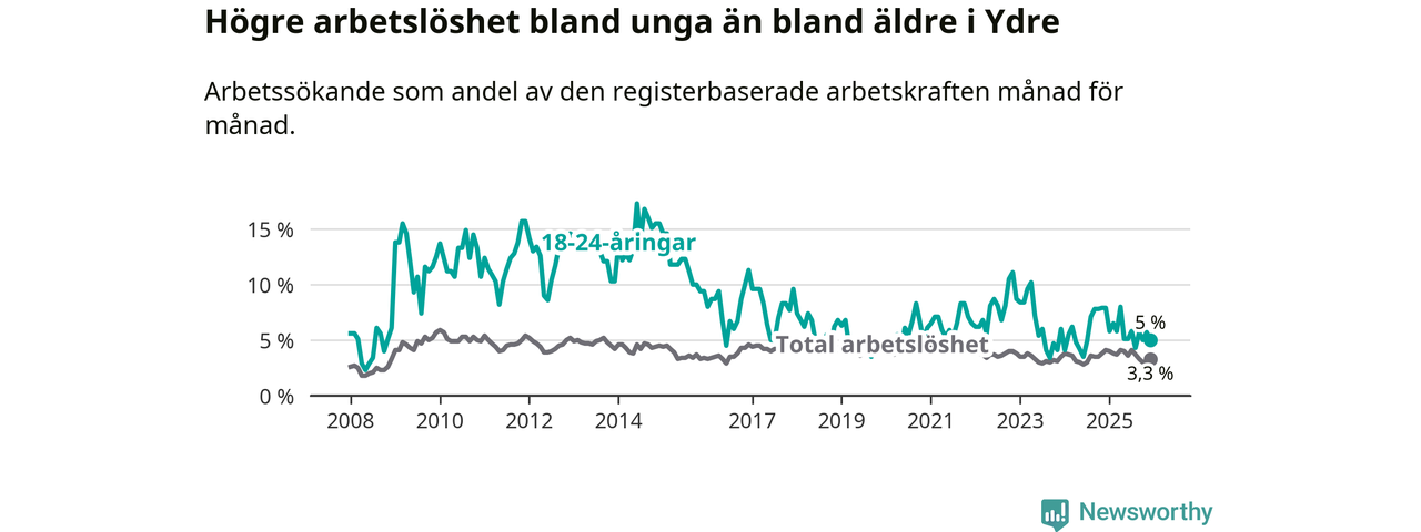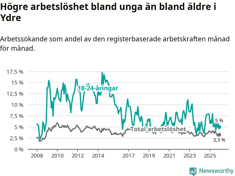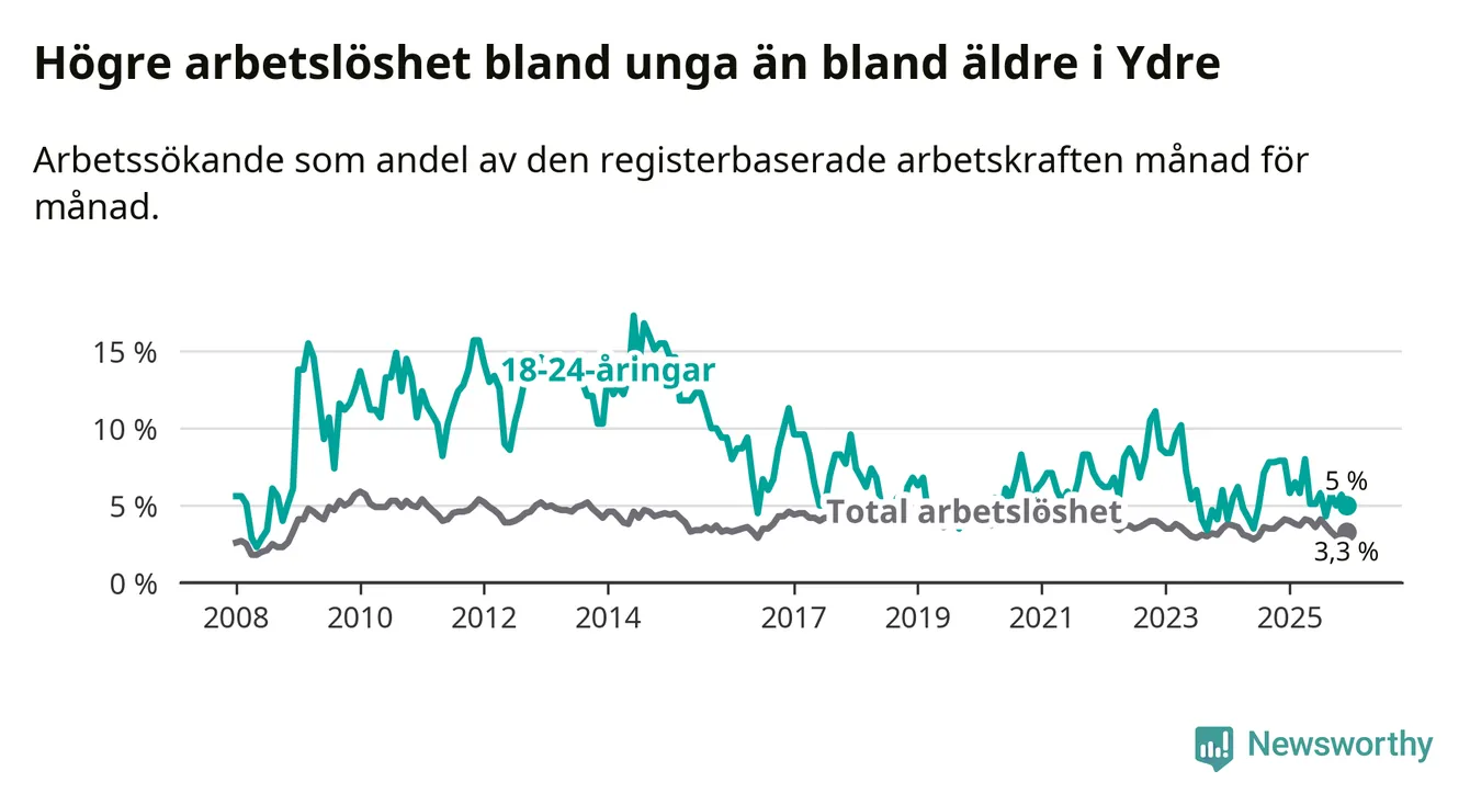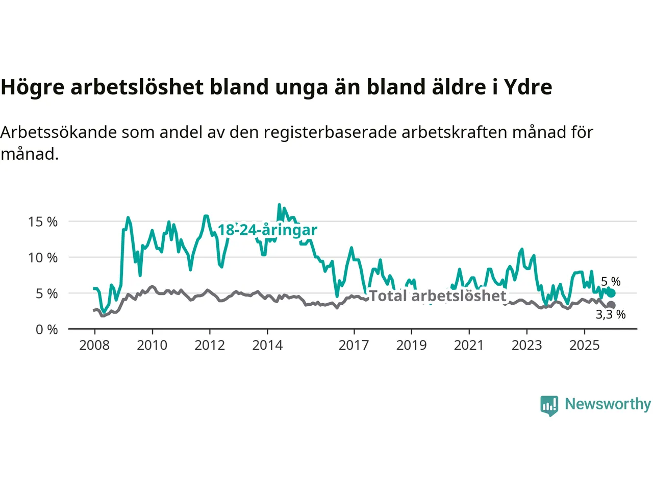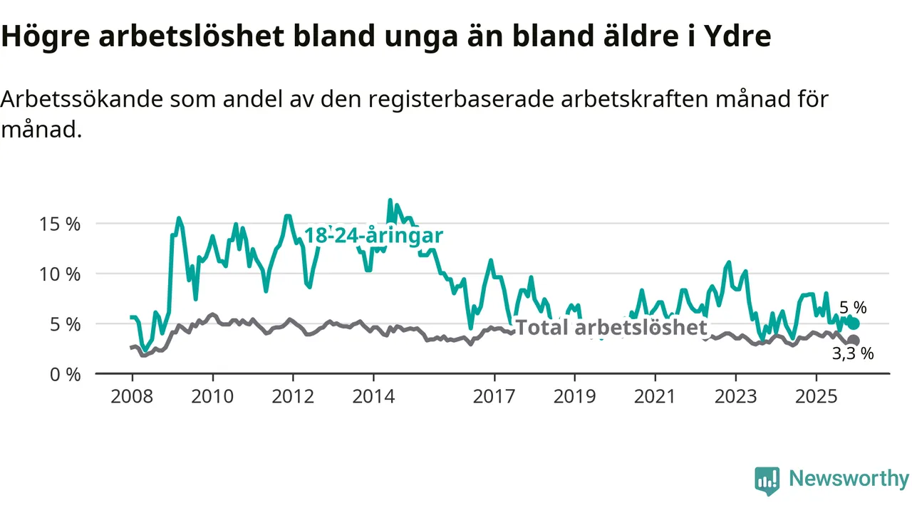 Den senaste månadsstatistiken från Arbetsförmedlingen visar på en nedgång i ungdomsarbetslöshet i Ydre kommun med 2,9 procentenheter. Arbetslösheten bland personer i åldern 18–24 år låg i december på 5,0 procent.